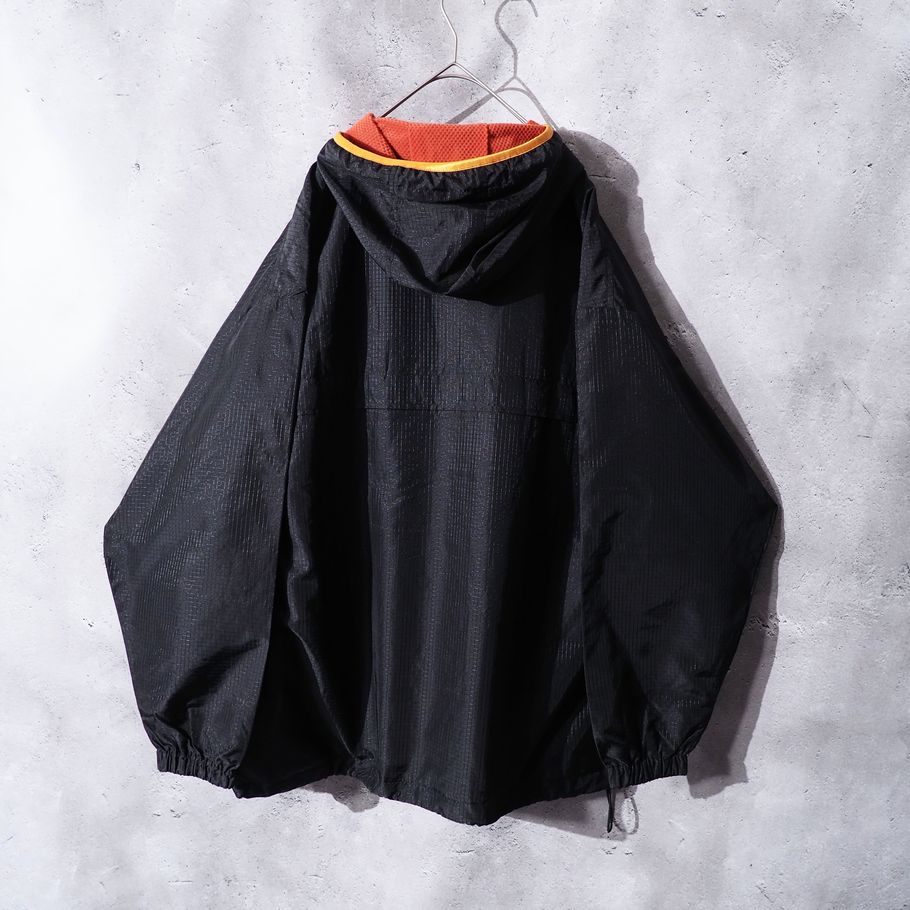 XLオーバーのルーズなサイジング、丈先には絞りの効いたドローコードがありシルエットの変化も楽しめます。裏地のオレンジメッシュも可愛いですね。