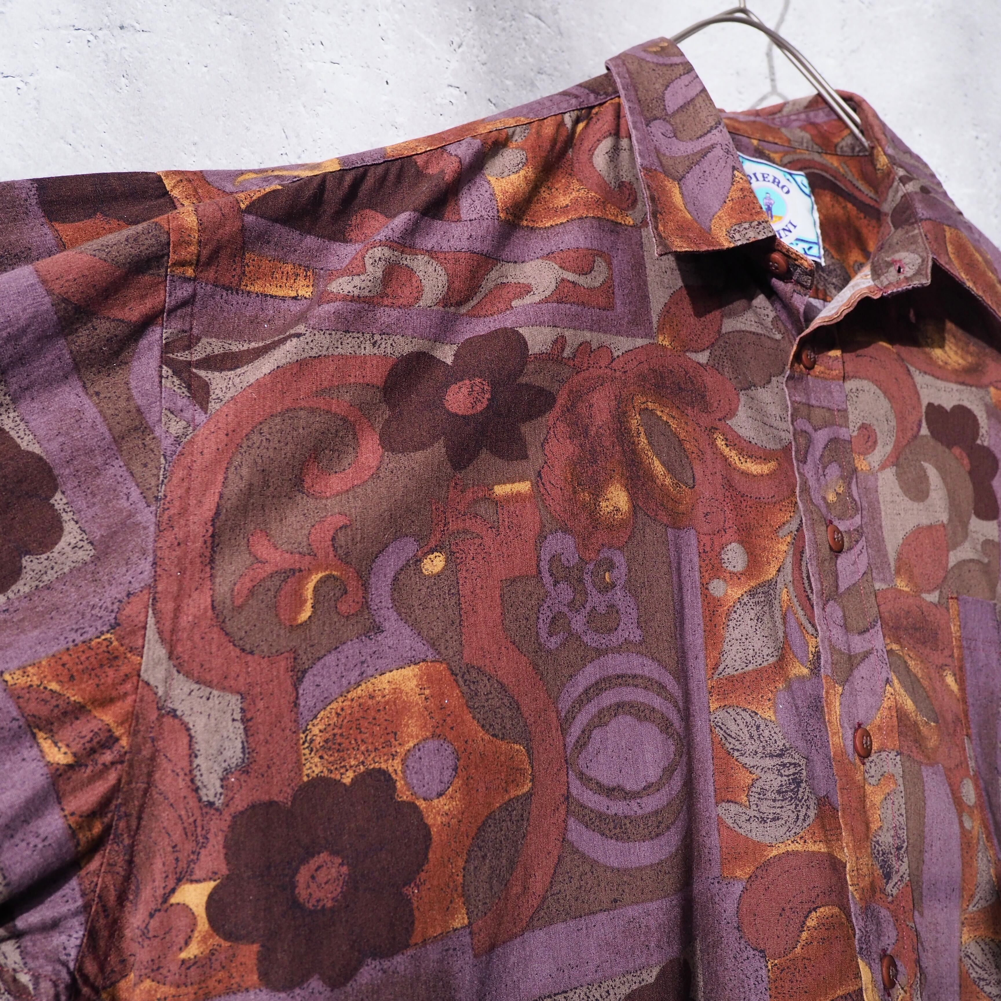 臙脂と紫のツートーンカラーで編成された総柄アートシャツ。大ぶりの花々が全面にあしらわれており、レトロな雰囲気がまた素晴らしい。ボタンも可愛いですね ☺︎