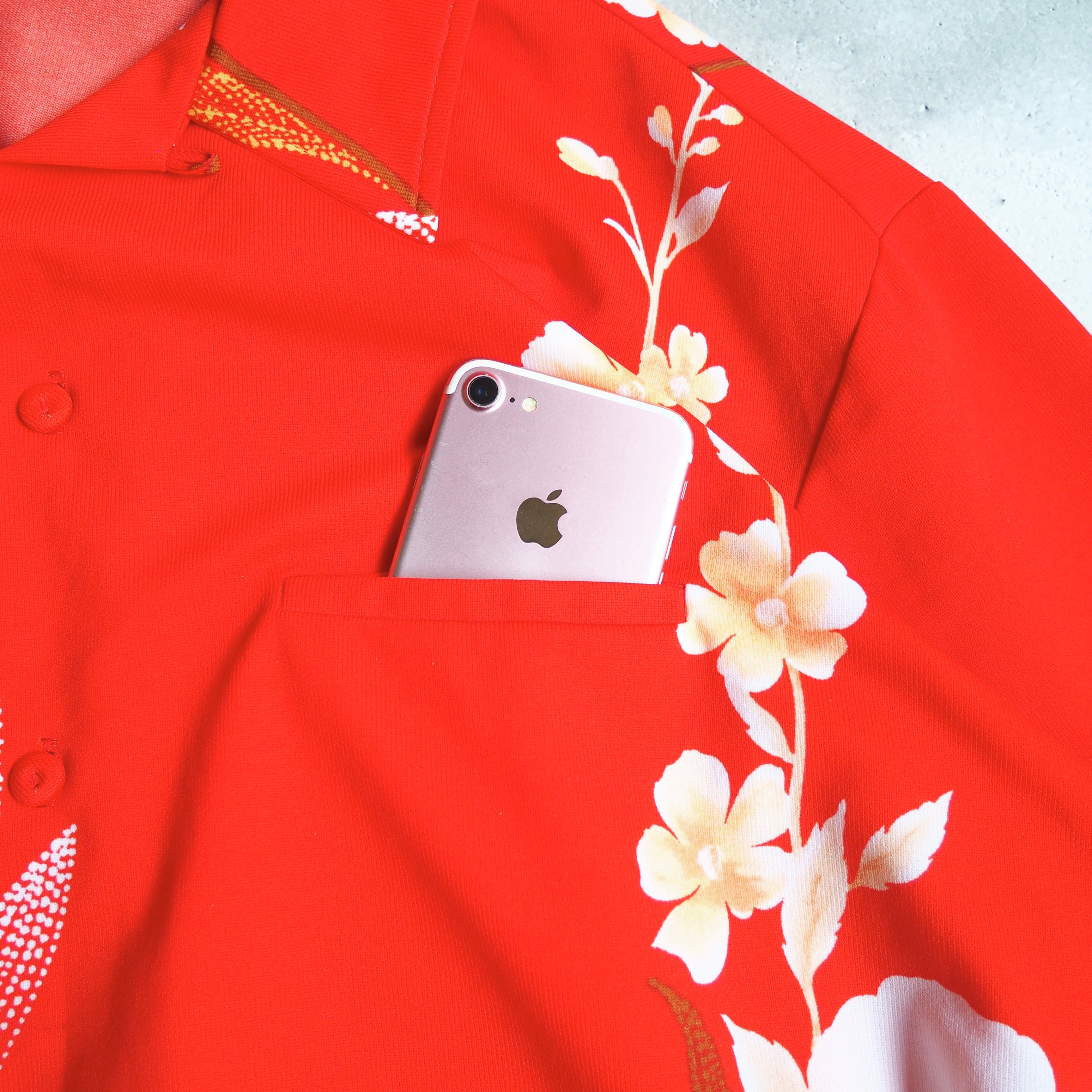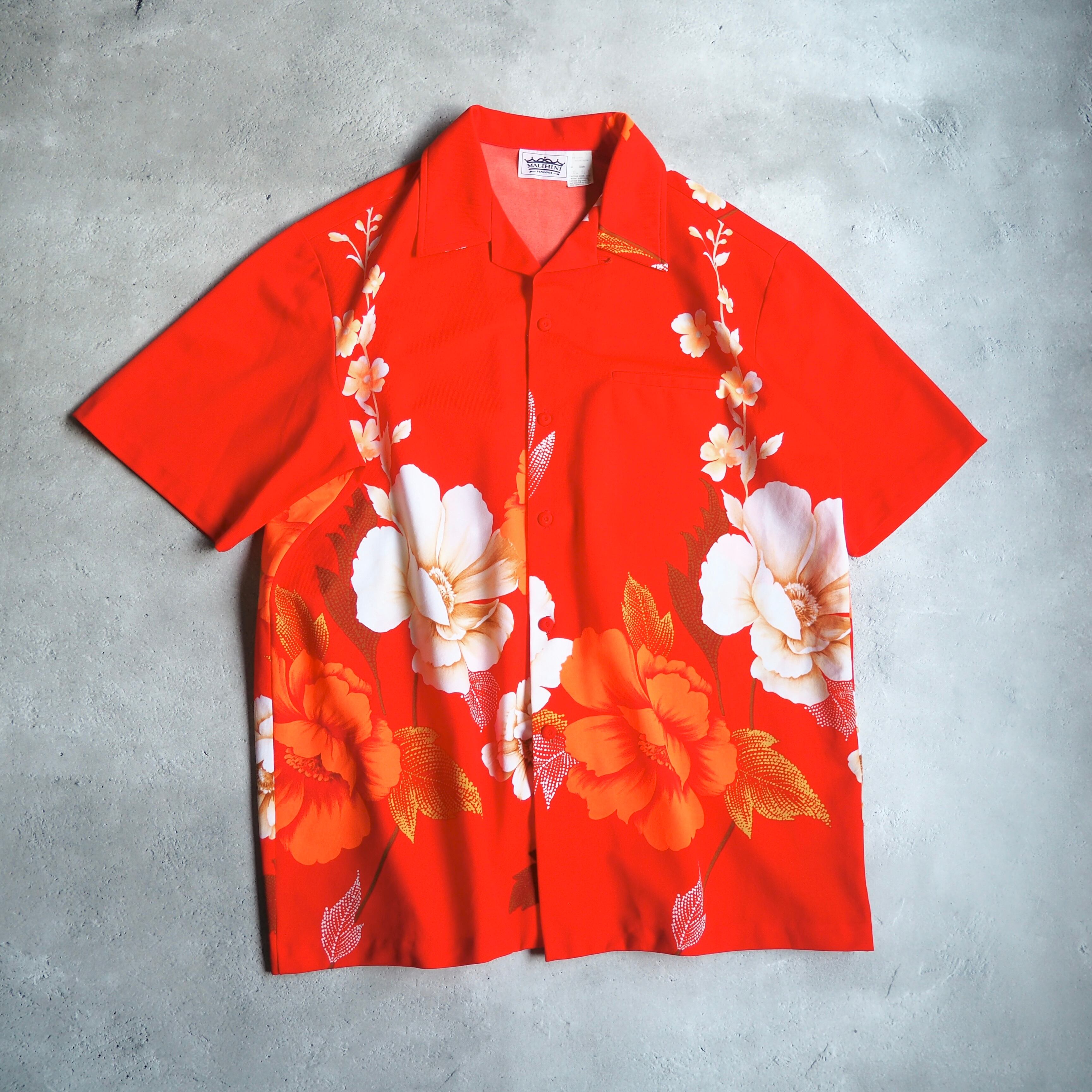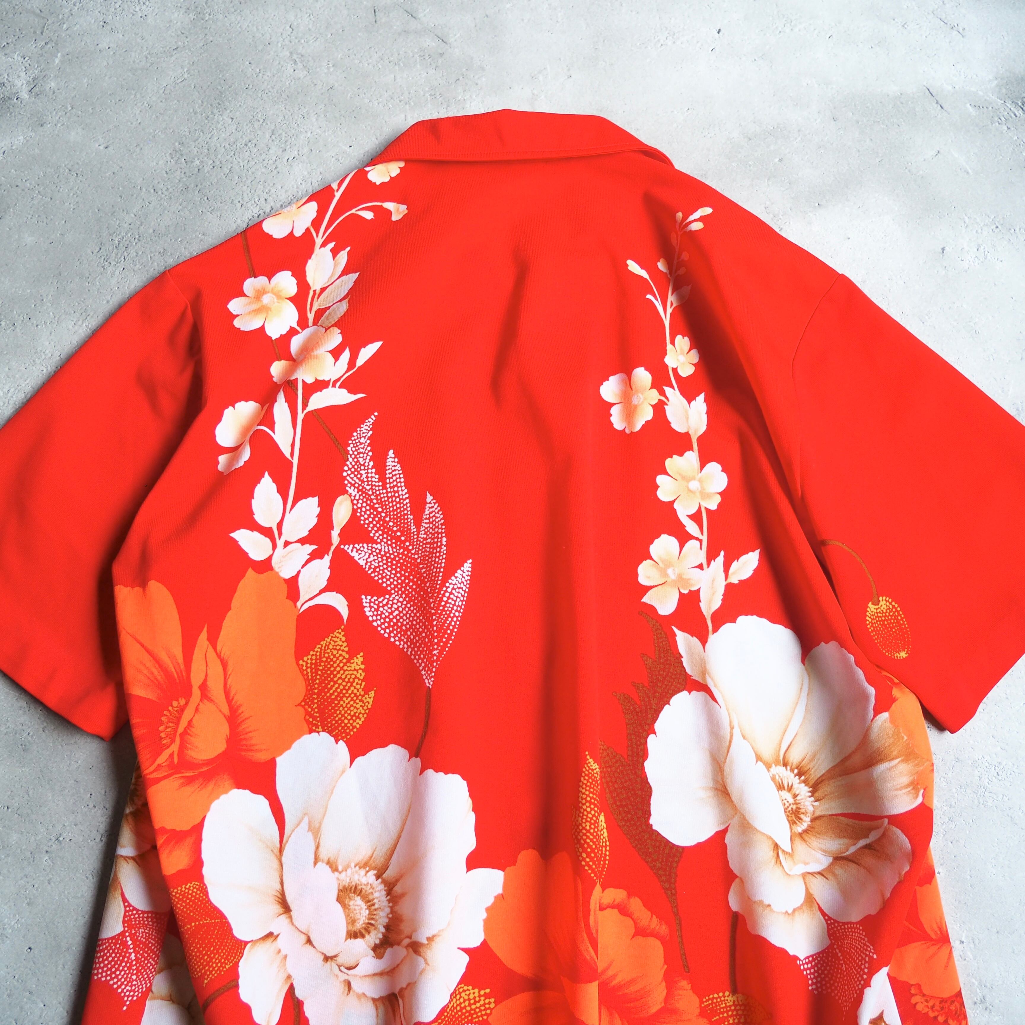 日本の伝統色でもある朱色をベースとしたポリボディに大ぶりの花々が美しく咲く、何処かジャポニズムなティストを魅せるオープンカラーシャツ。