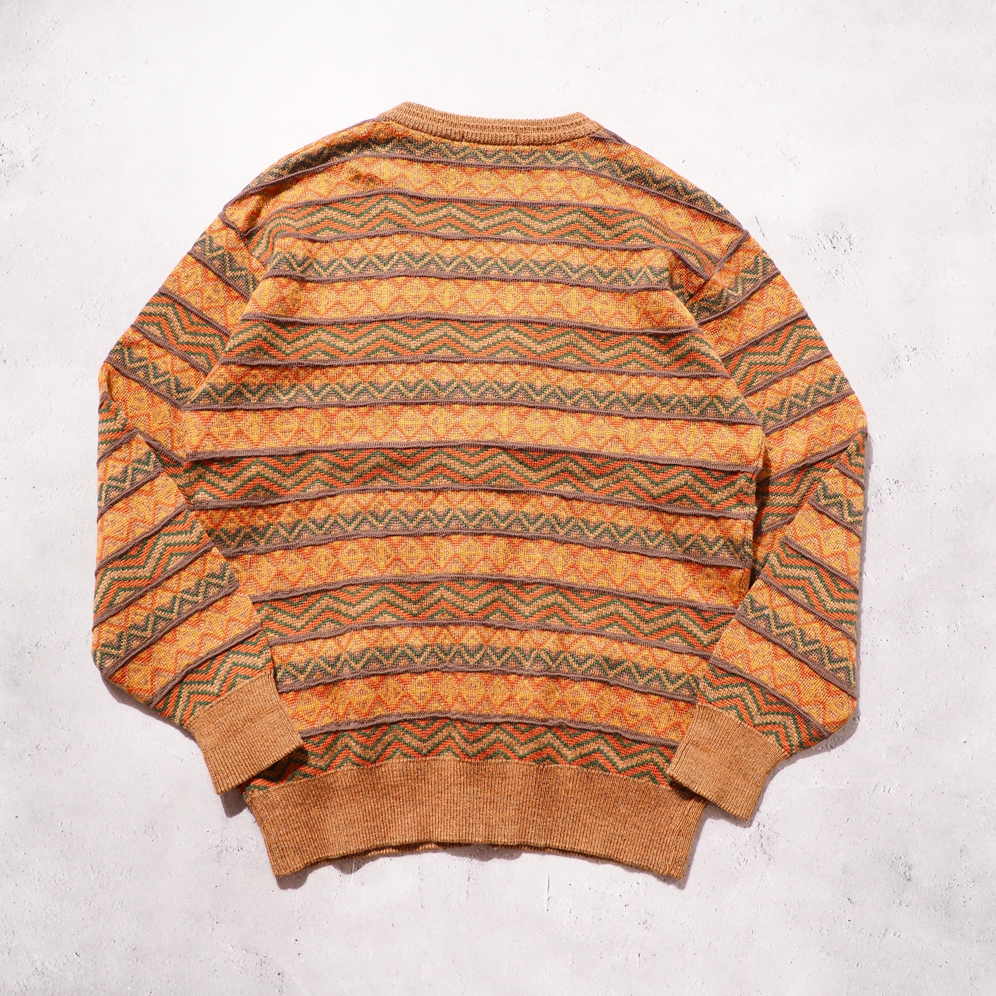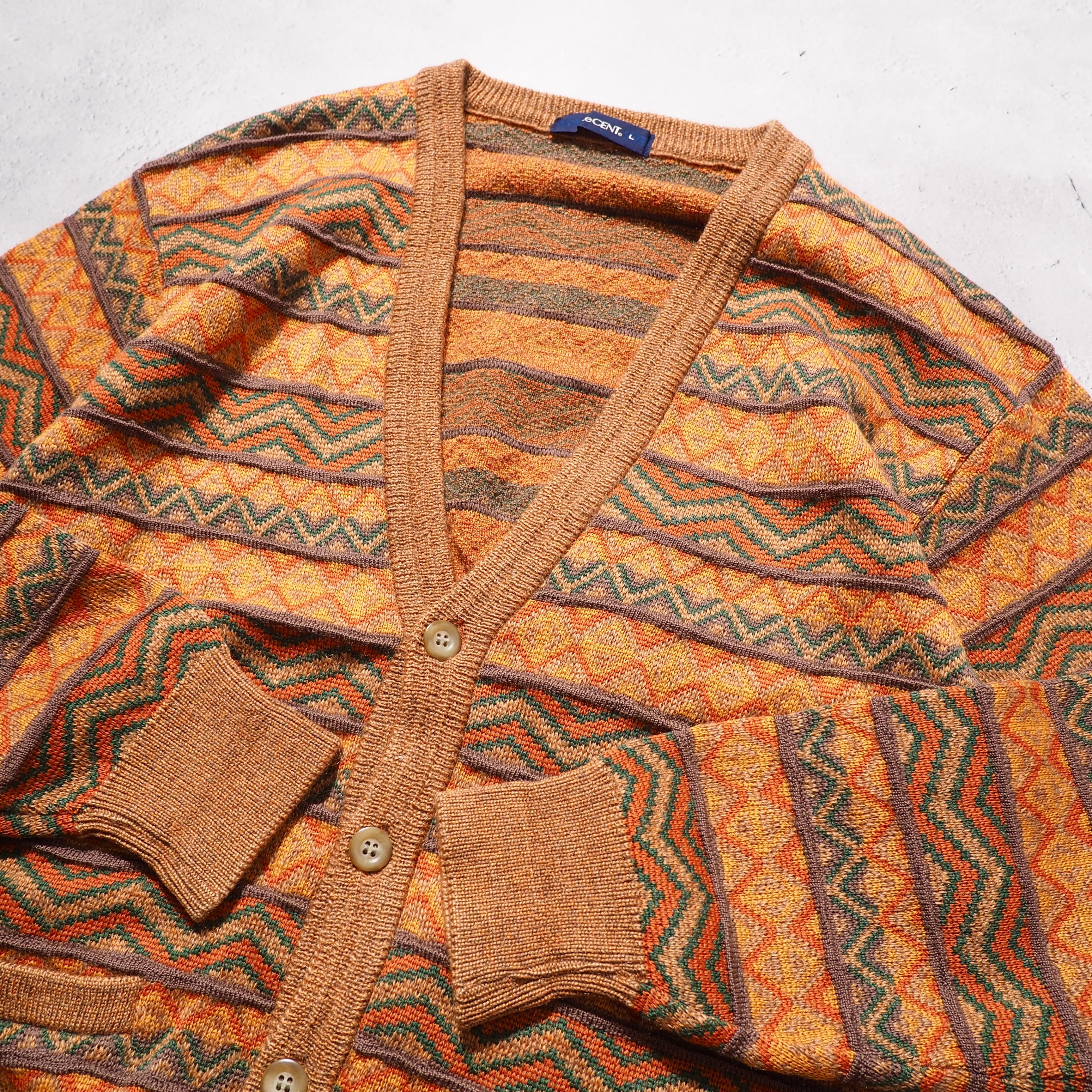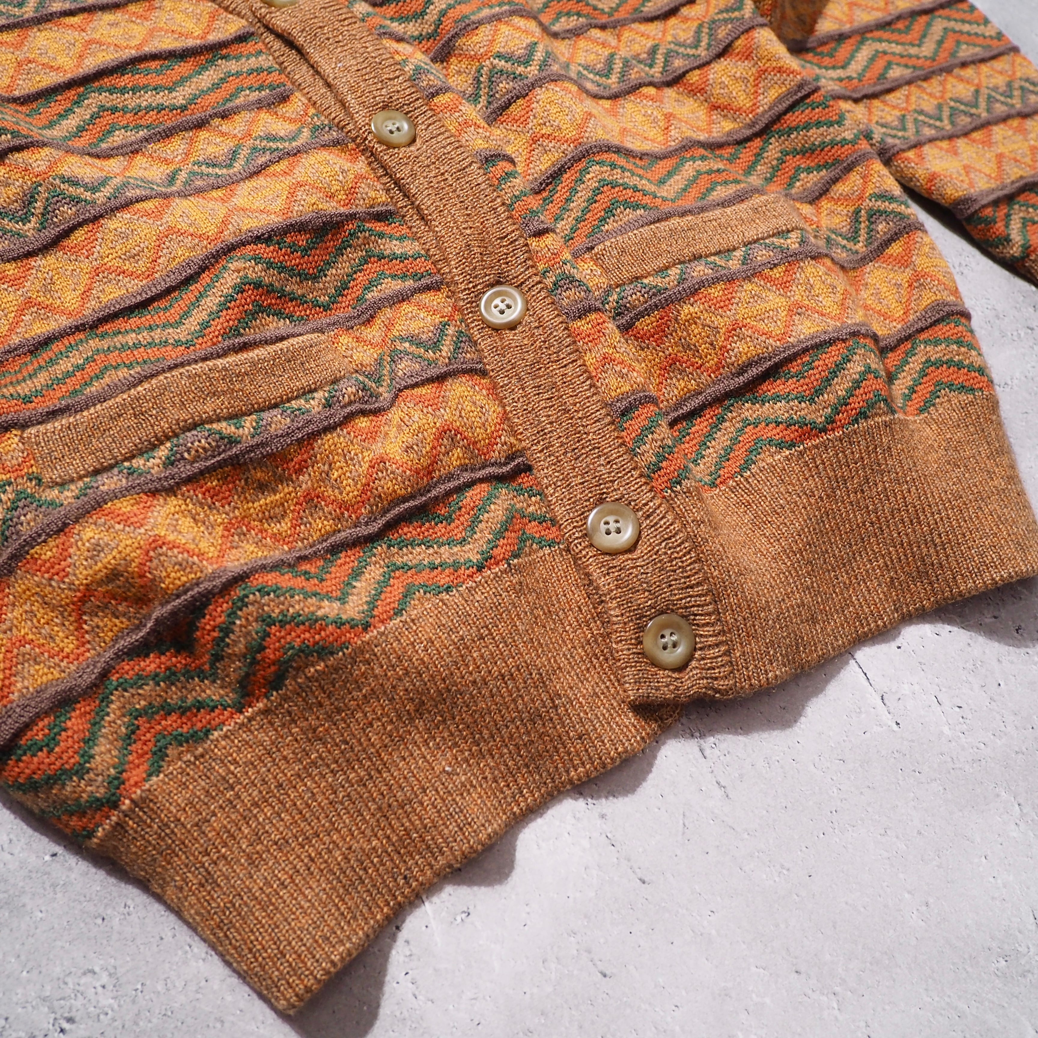オレンジをベースとしたウールモヘアの混紡生地にグリーン、パプール、イエロー、ブラウンの幾何学紋様を織り込んだ3Dニットカーディガン。