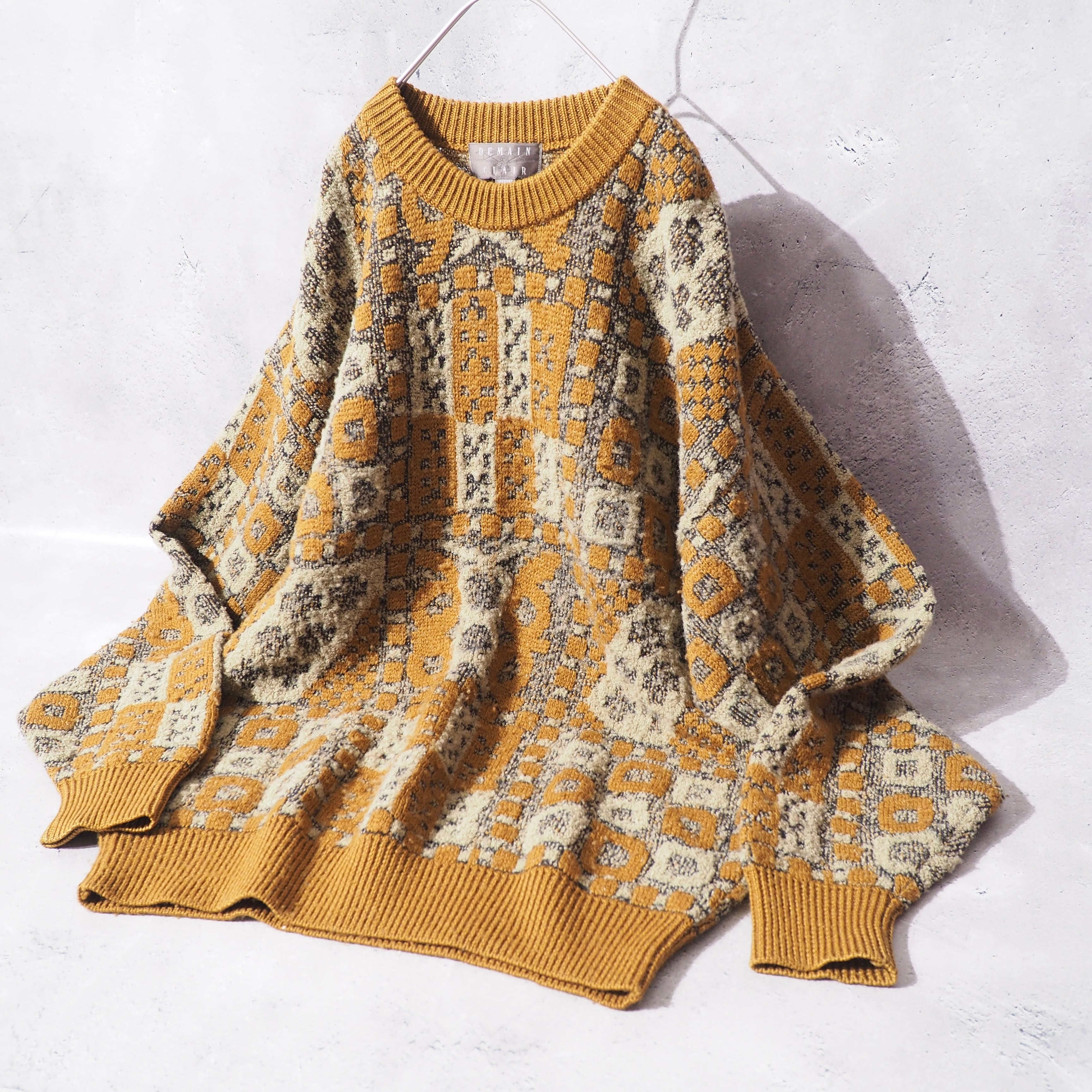 十字架や、ギンガムチェック、スクエアといった様々な幾何学模様を立体感のある編み込みで表現したヴィンテージニット。