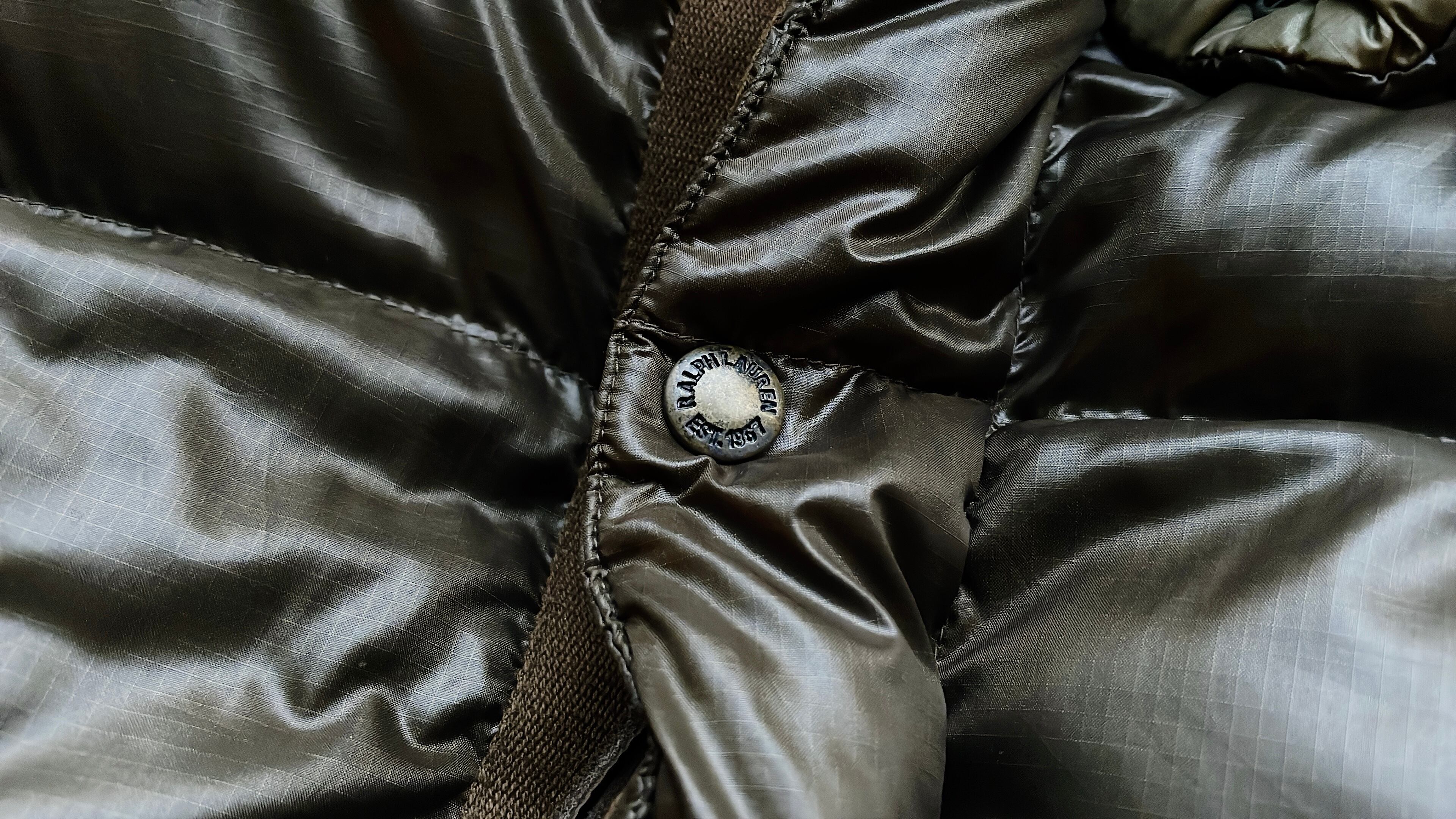 深みのあるダークカーキのお色に、シャリ感×光沢感のあるナイロンリップストップがミリタリーソリッドな表情を魅せるポロラルフローレンのダウンベスト。