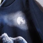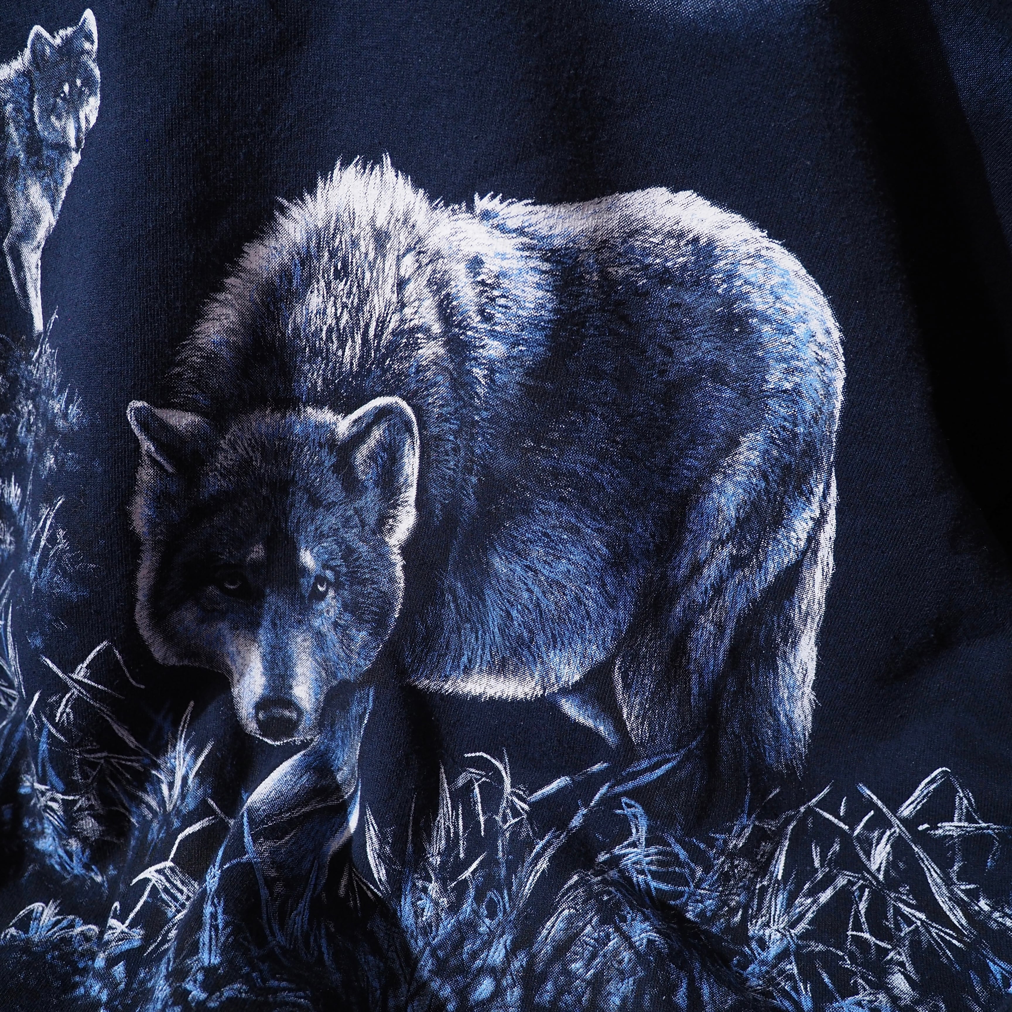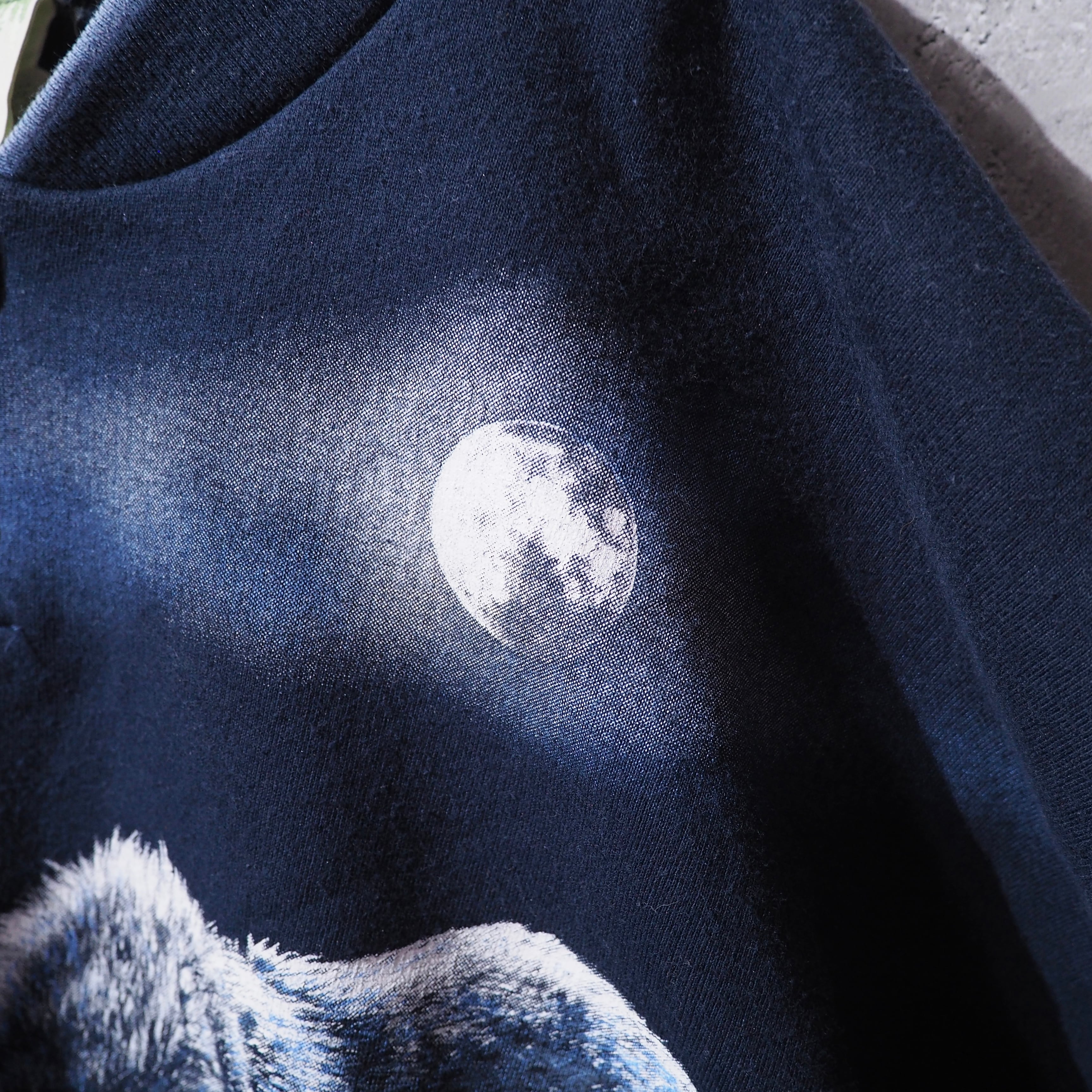 ダークネイビーのボディに描かれた満月と狼がクールなスウェット。