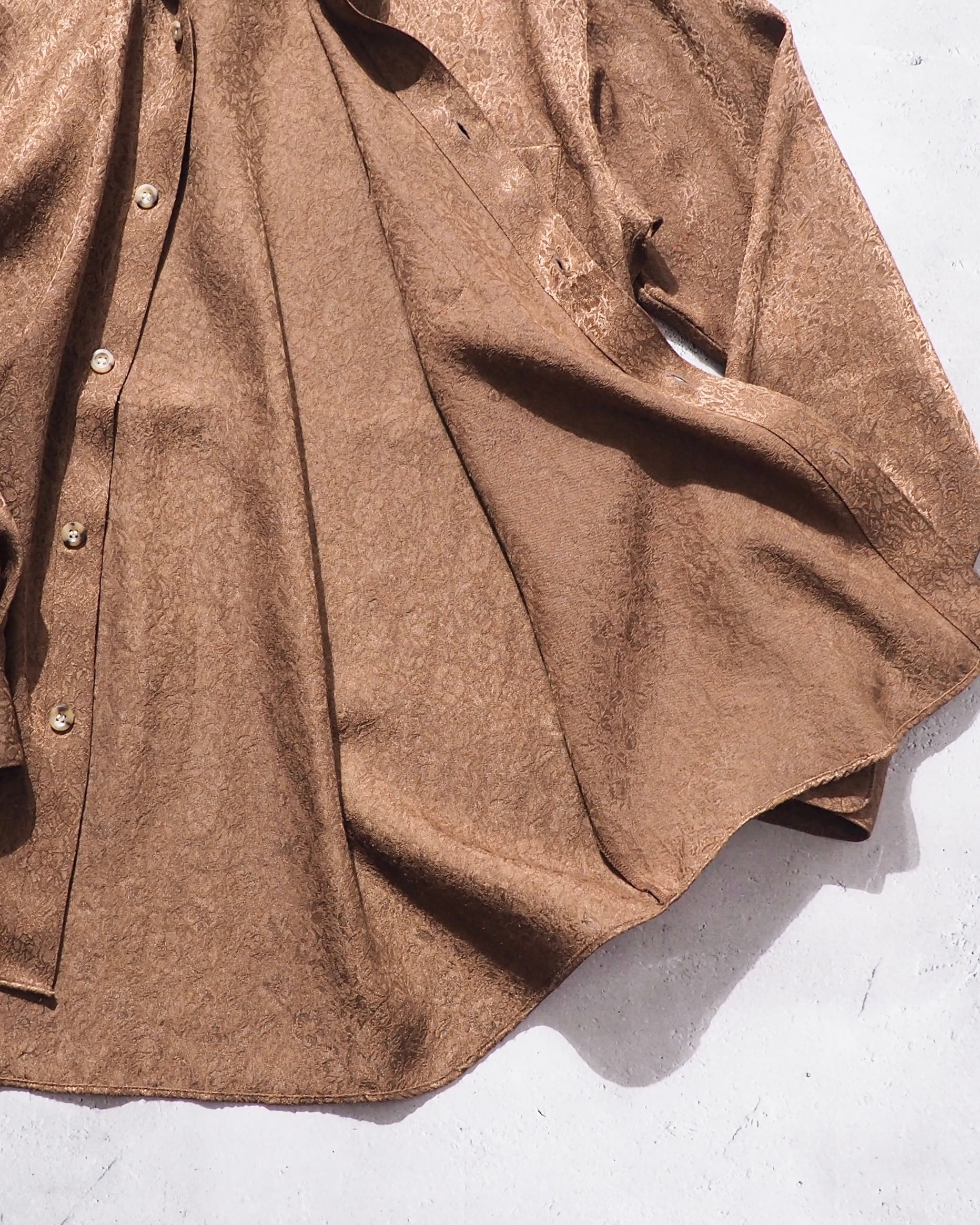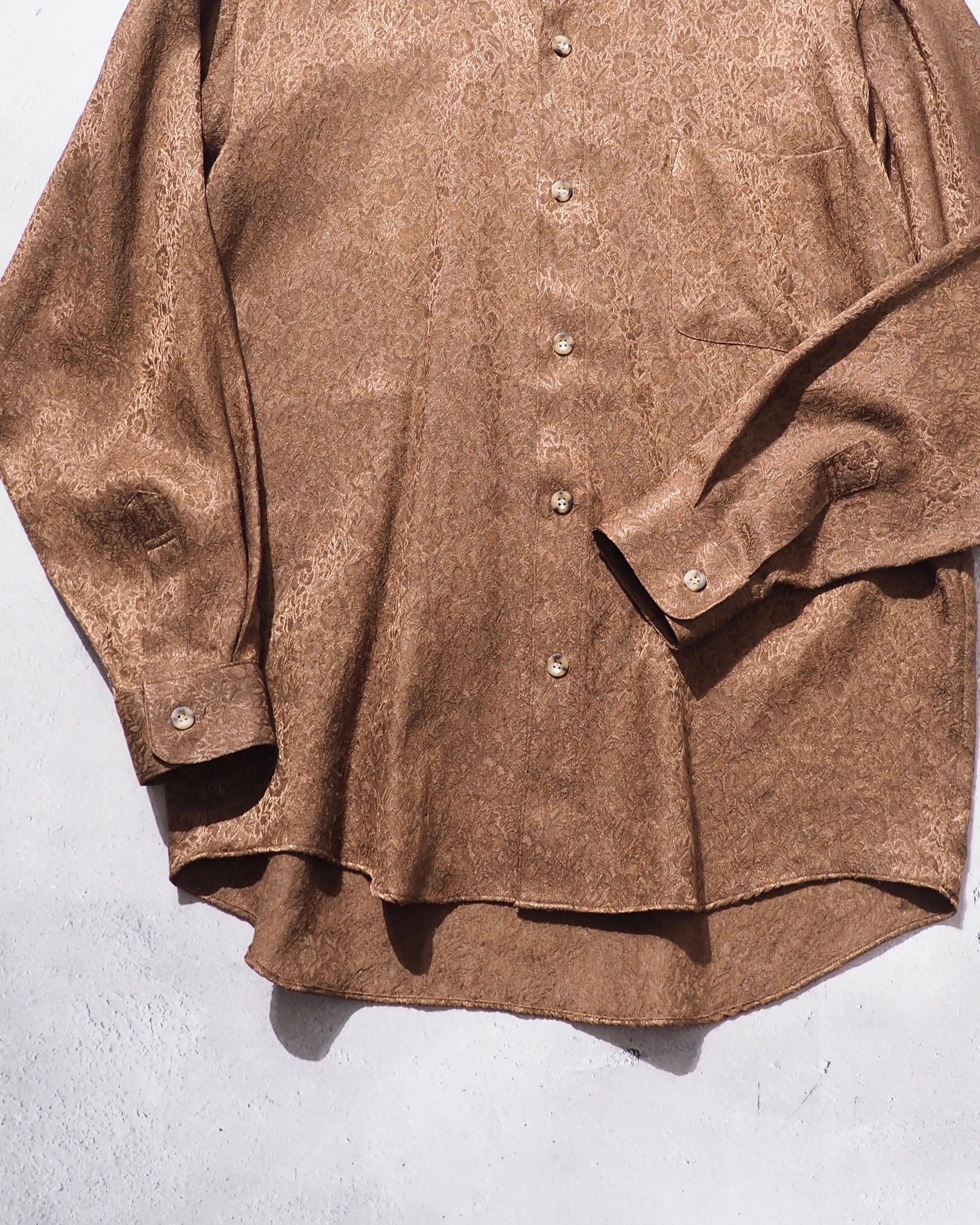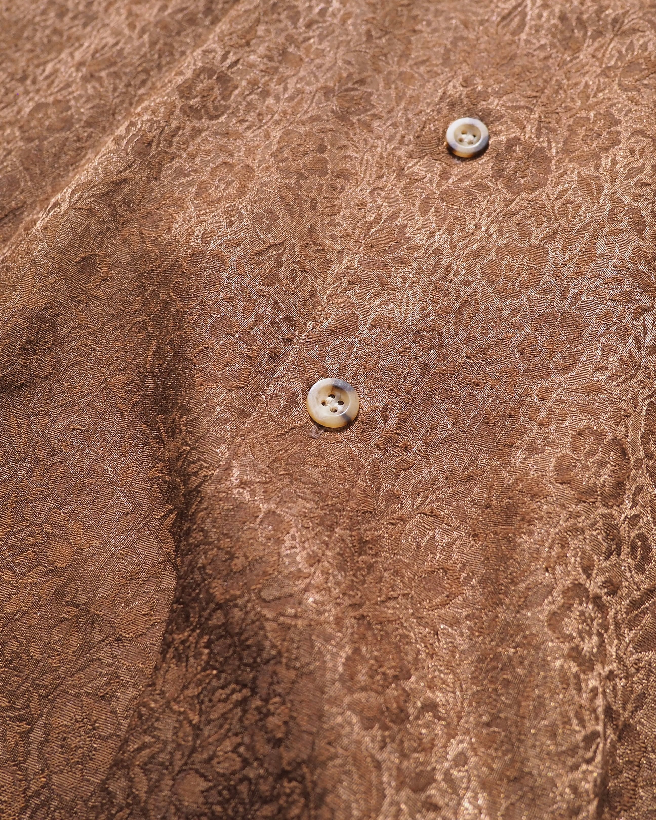 光沢かつドレープな生地感のライトブラウンボディにあしらわれた花々がラグジュアリーなシャツ。
