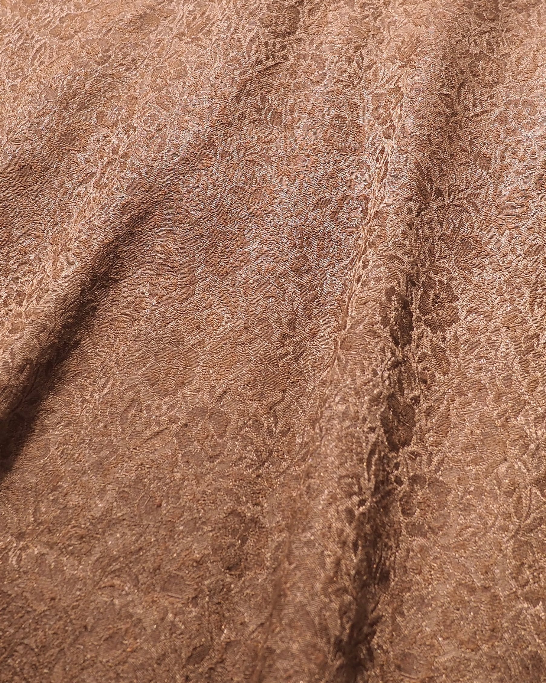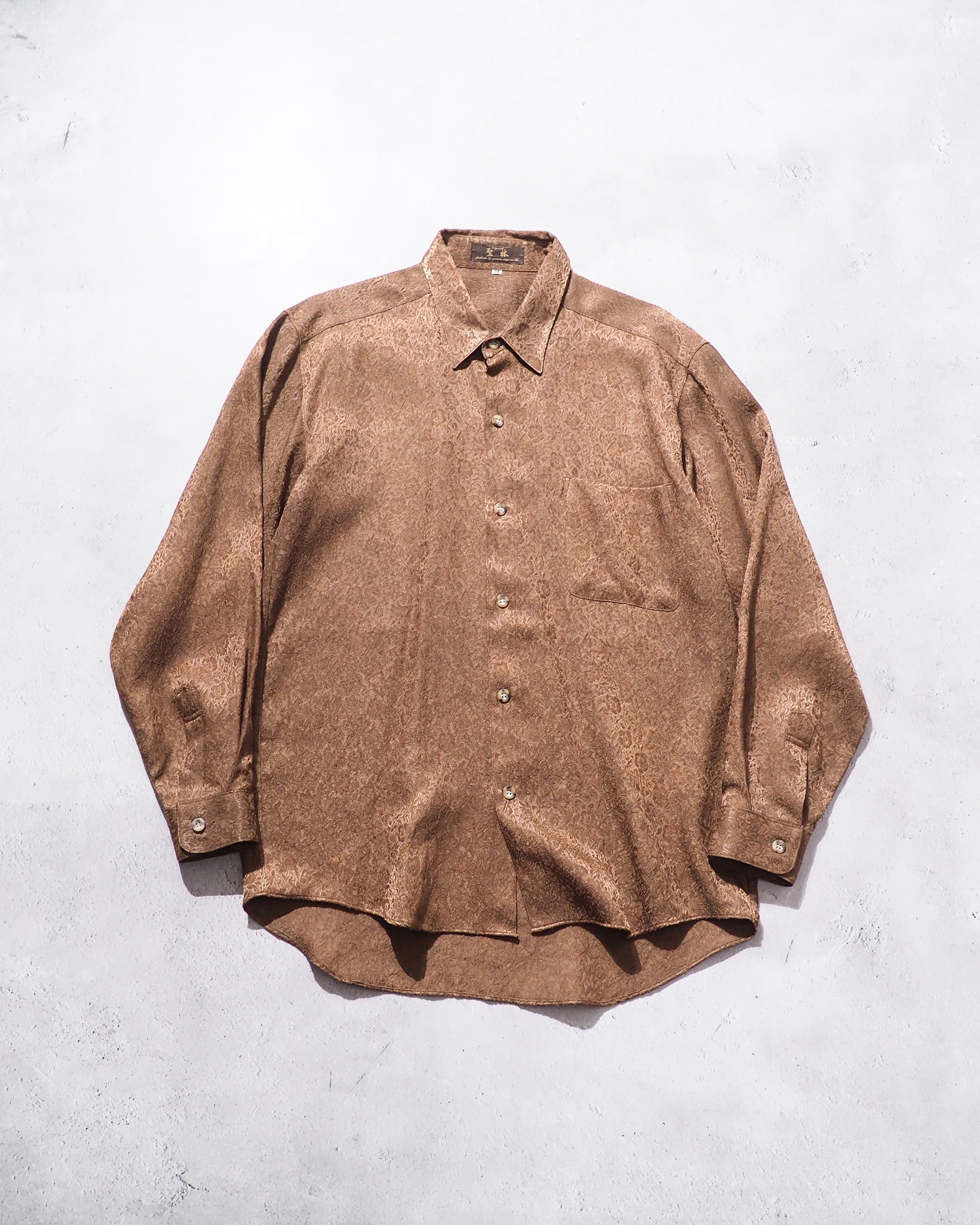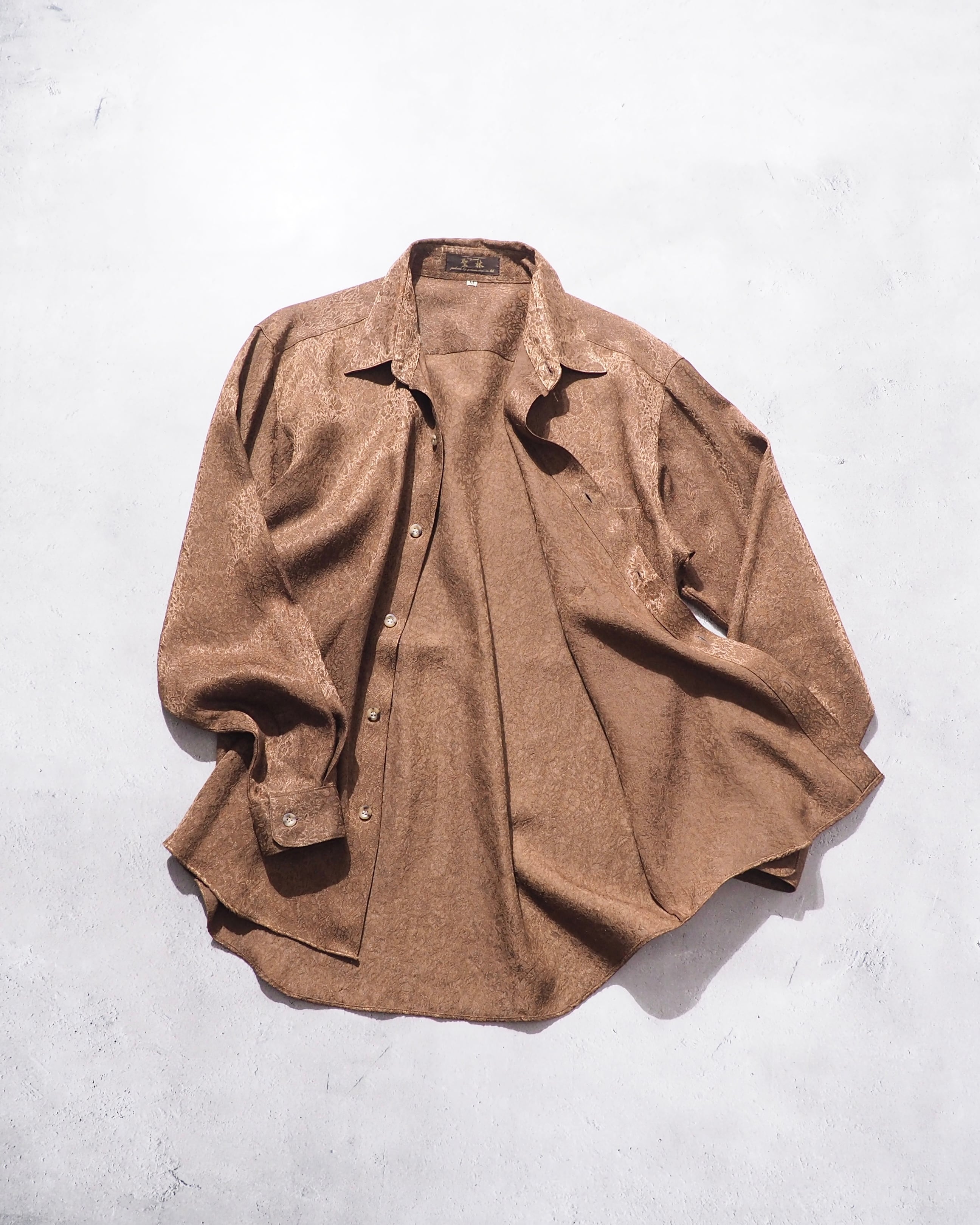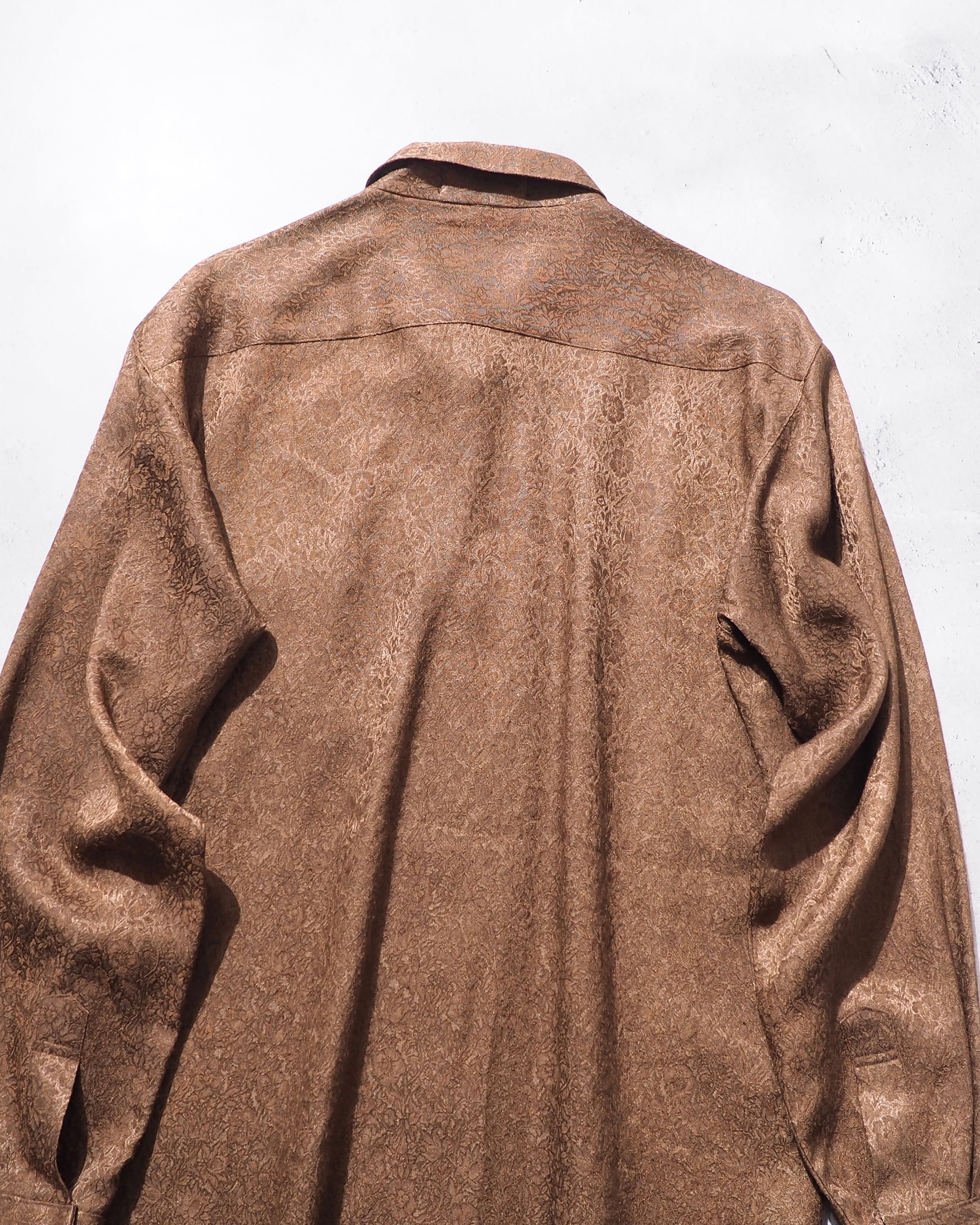 光沢かつドレープな生地感のライトブラウンボディにあしらわれた花々がラグジュアリーなシャツ。