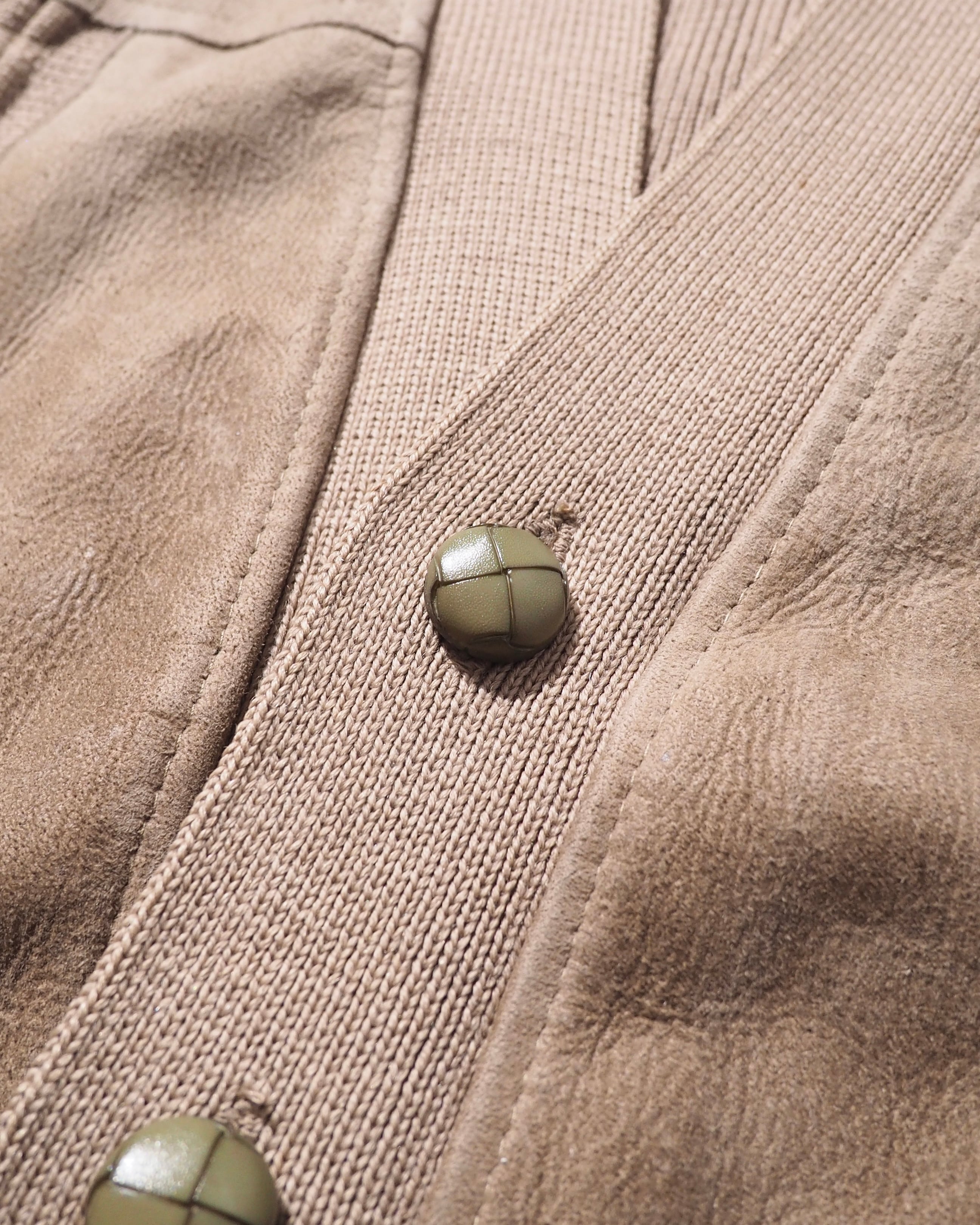 経年変化によるものか、やや燻みがかった色合いが無骨ながらも品を感じますね。オリーブグリーンの釦も可愛らしい。