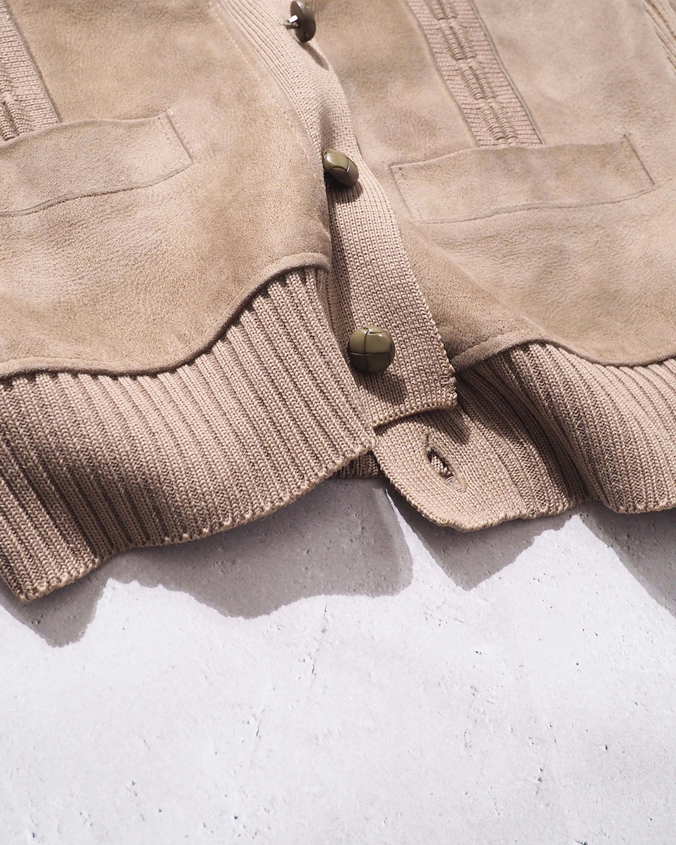 トーンダウンされたライトベージュのウールボディに組み込まれたスエードレザーがヴィンテージな表情をみせる1着。しっとりやわらかな、上質な質感のリアルレザーを採用。