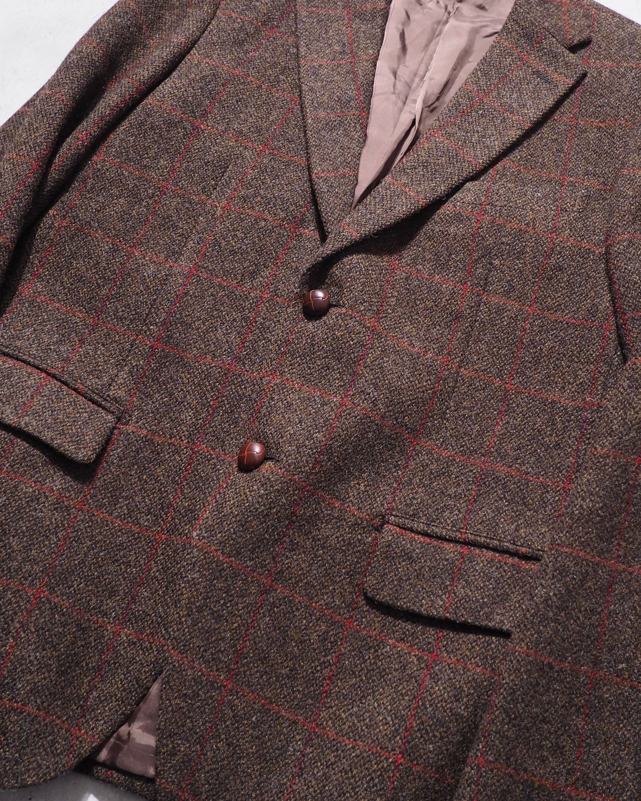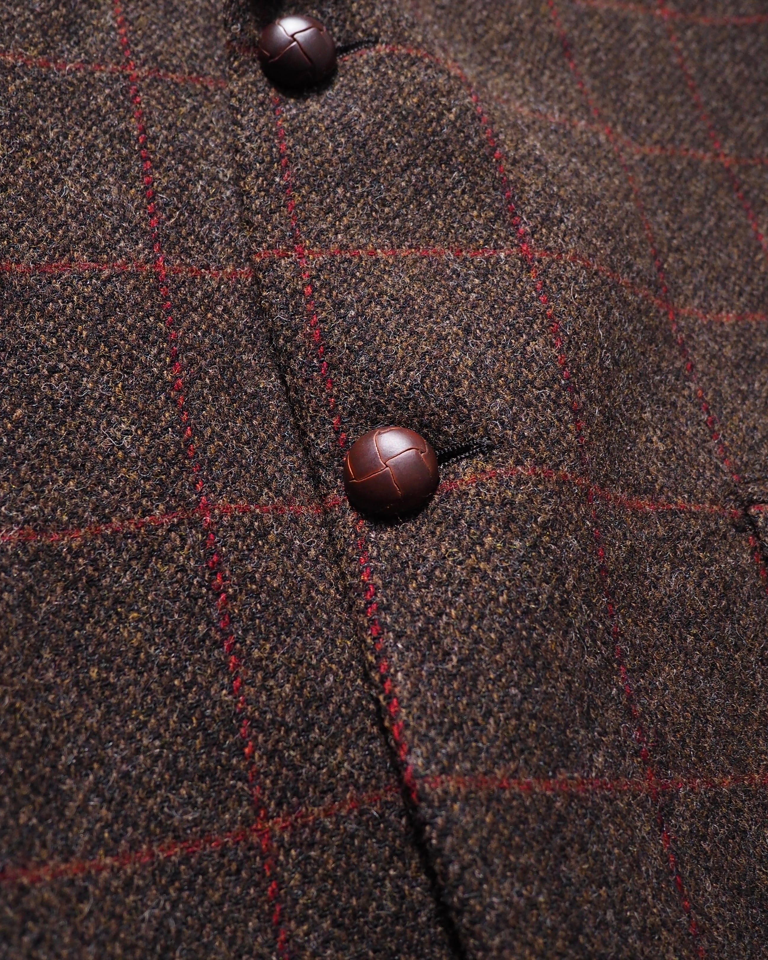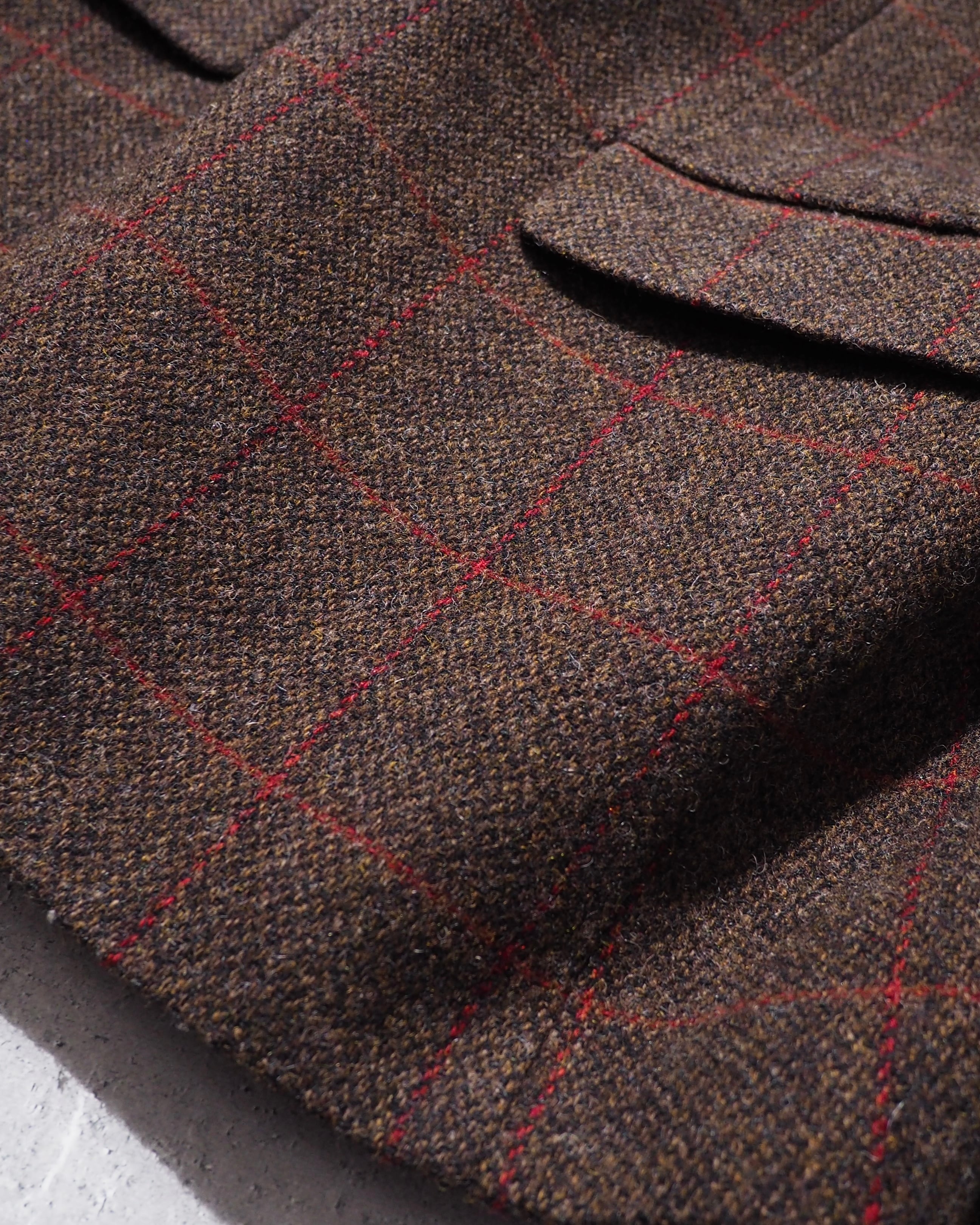 風合いの良いライトブラウンのウールツイードに走る点線ブロックステッチがトラッドな逸品。フロントを留める牛革釦もアイコニックですね。