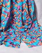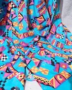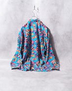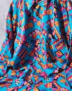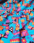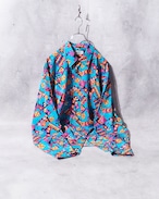 爽やかなターコイズブルーのボディに転写されたカラフルな幾何学模様が可愛らしいアートシャツ。光が当たると浮かび上がる隠れ模様もラグジュアリー、とろみのあるドレープな生地感もオツです ☺︎