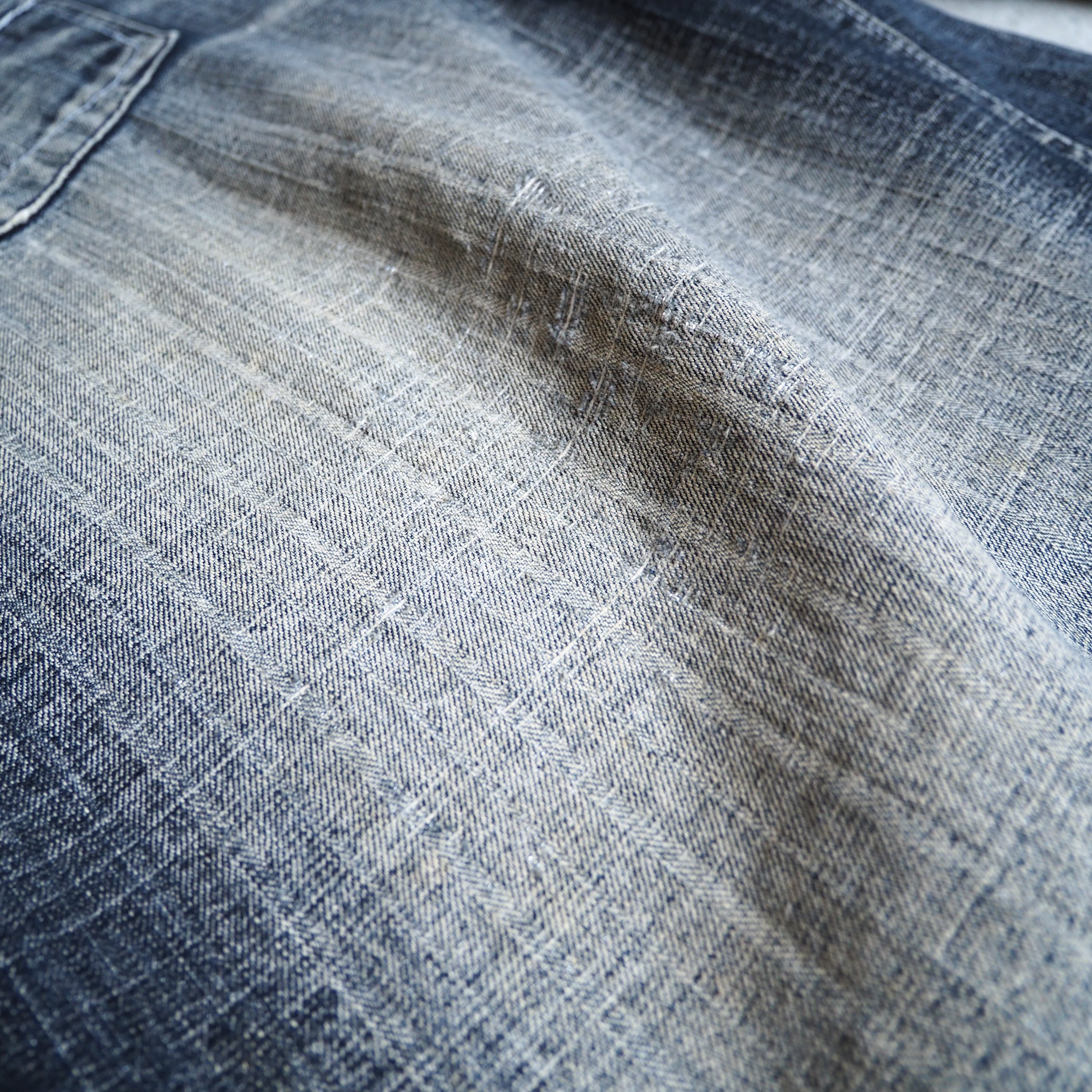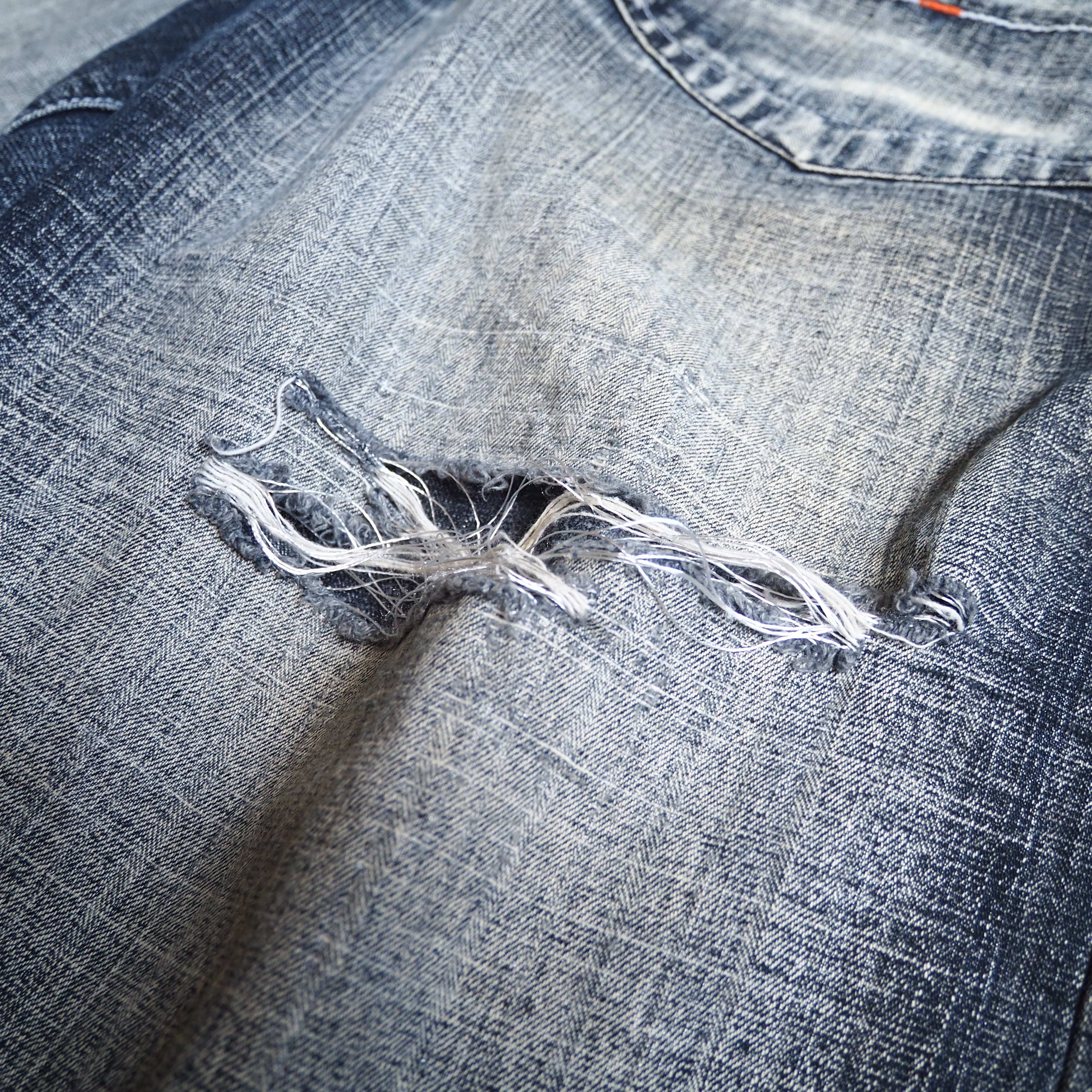 美しいフェードと襤褸ダメージ加工が施されたバギーショーツ。