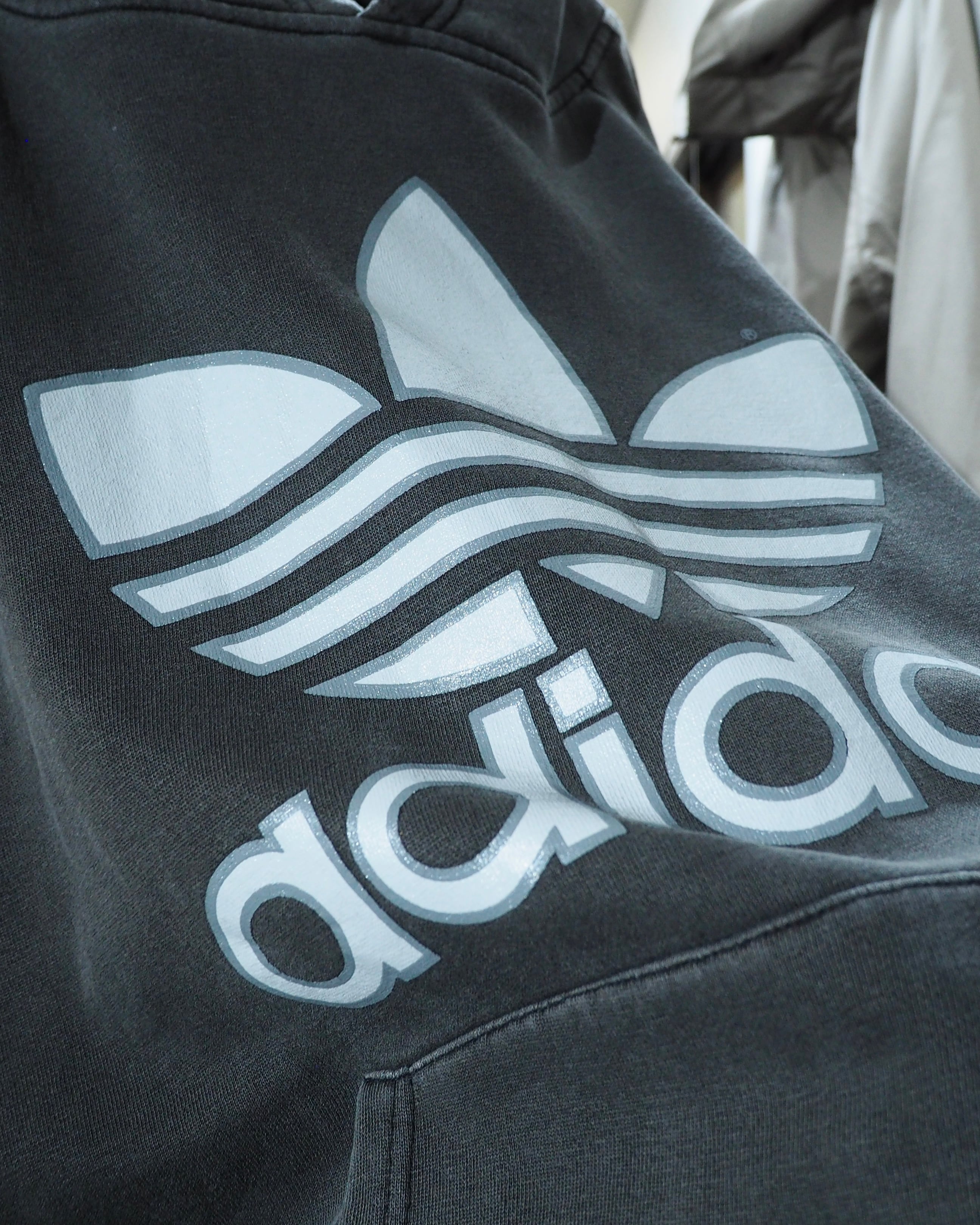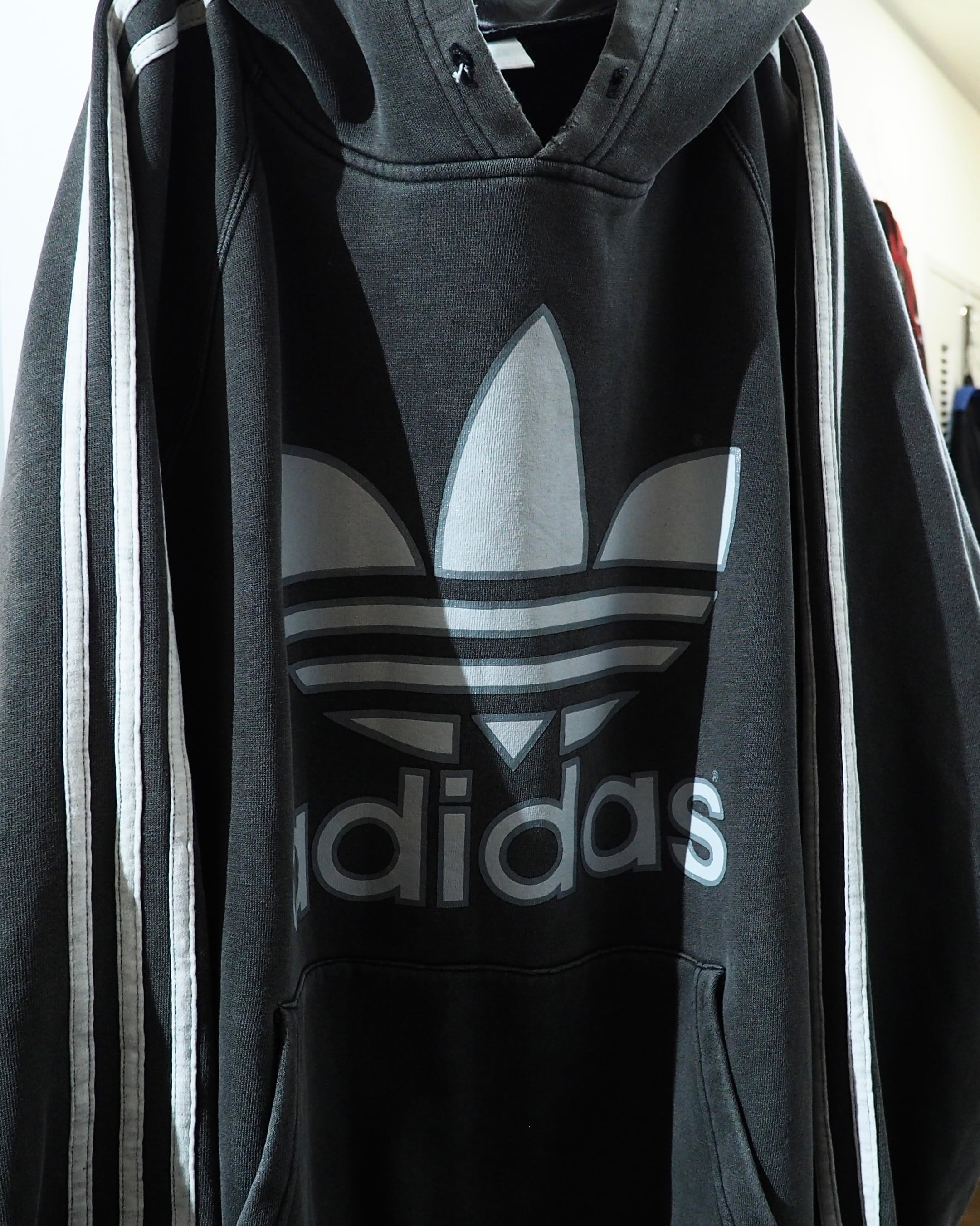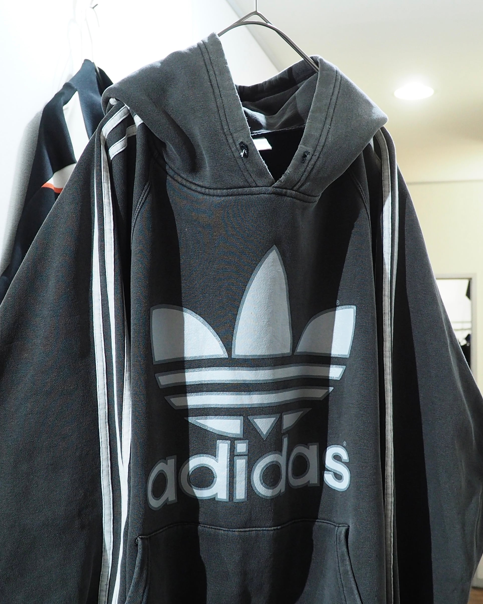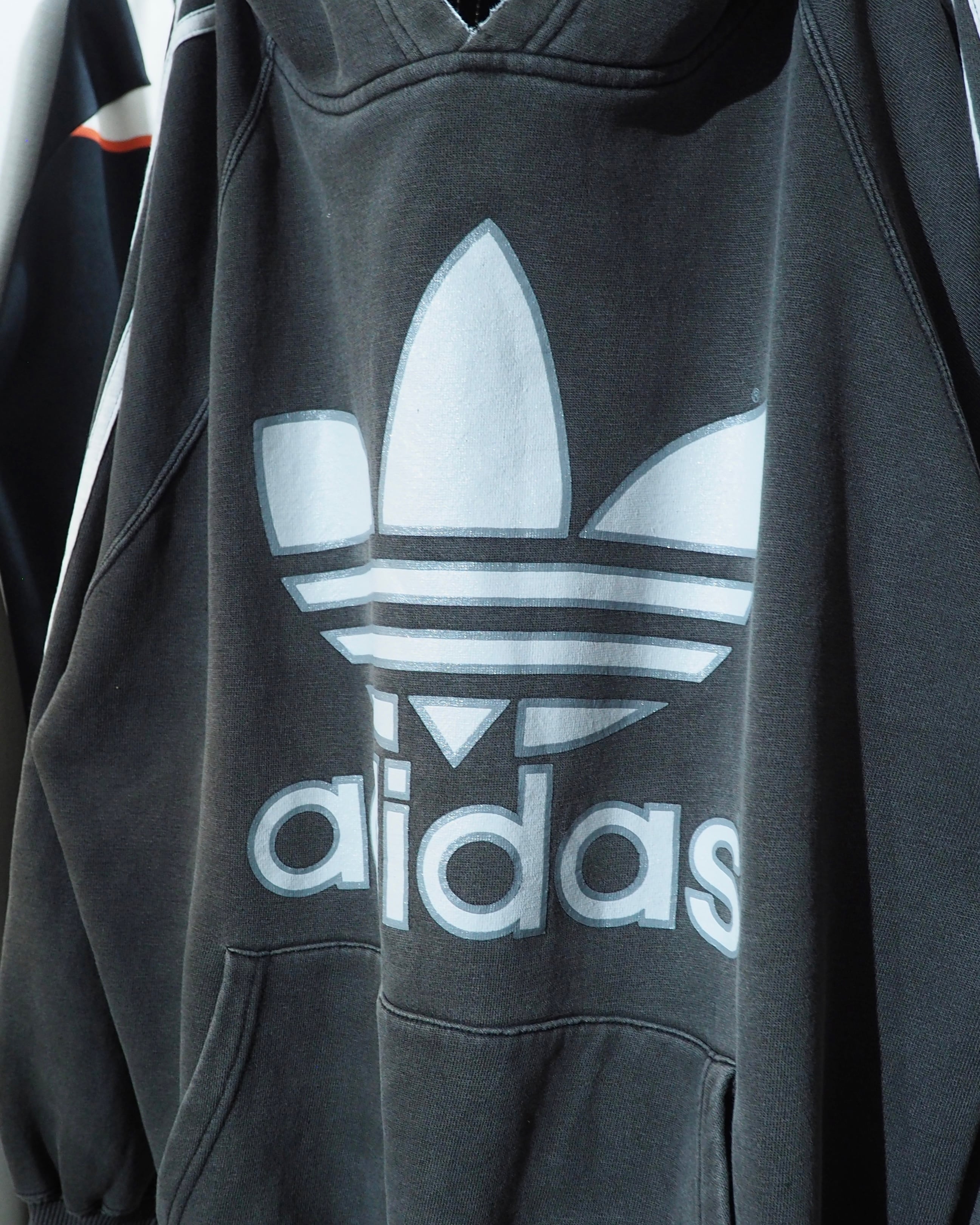 経年変化によりフェードに色落ちしたボディに転写されたトレフォイルロゴプリント×スリーライン刺繍が雰囲気の良いオールドアディダスのフーディ。
