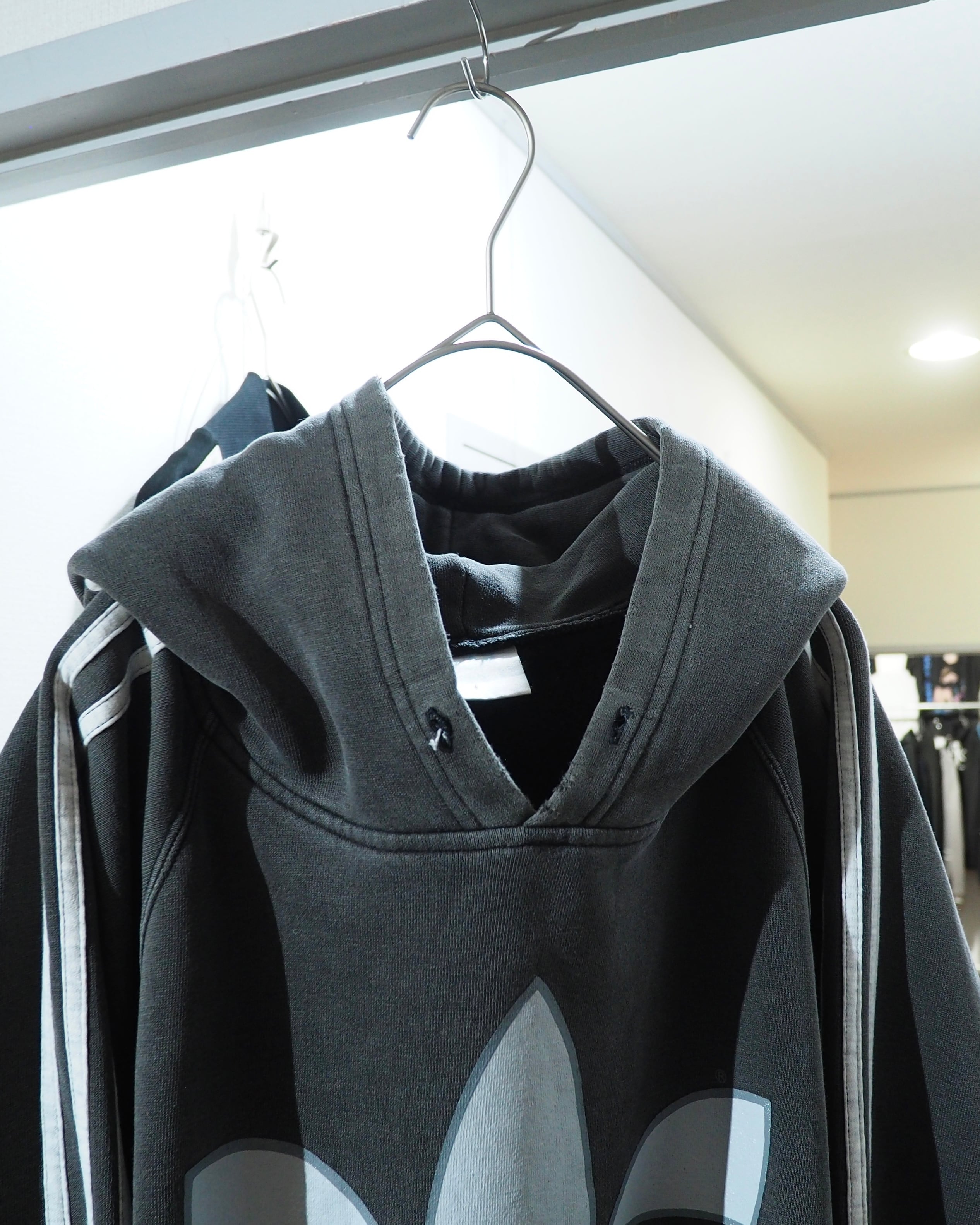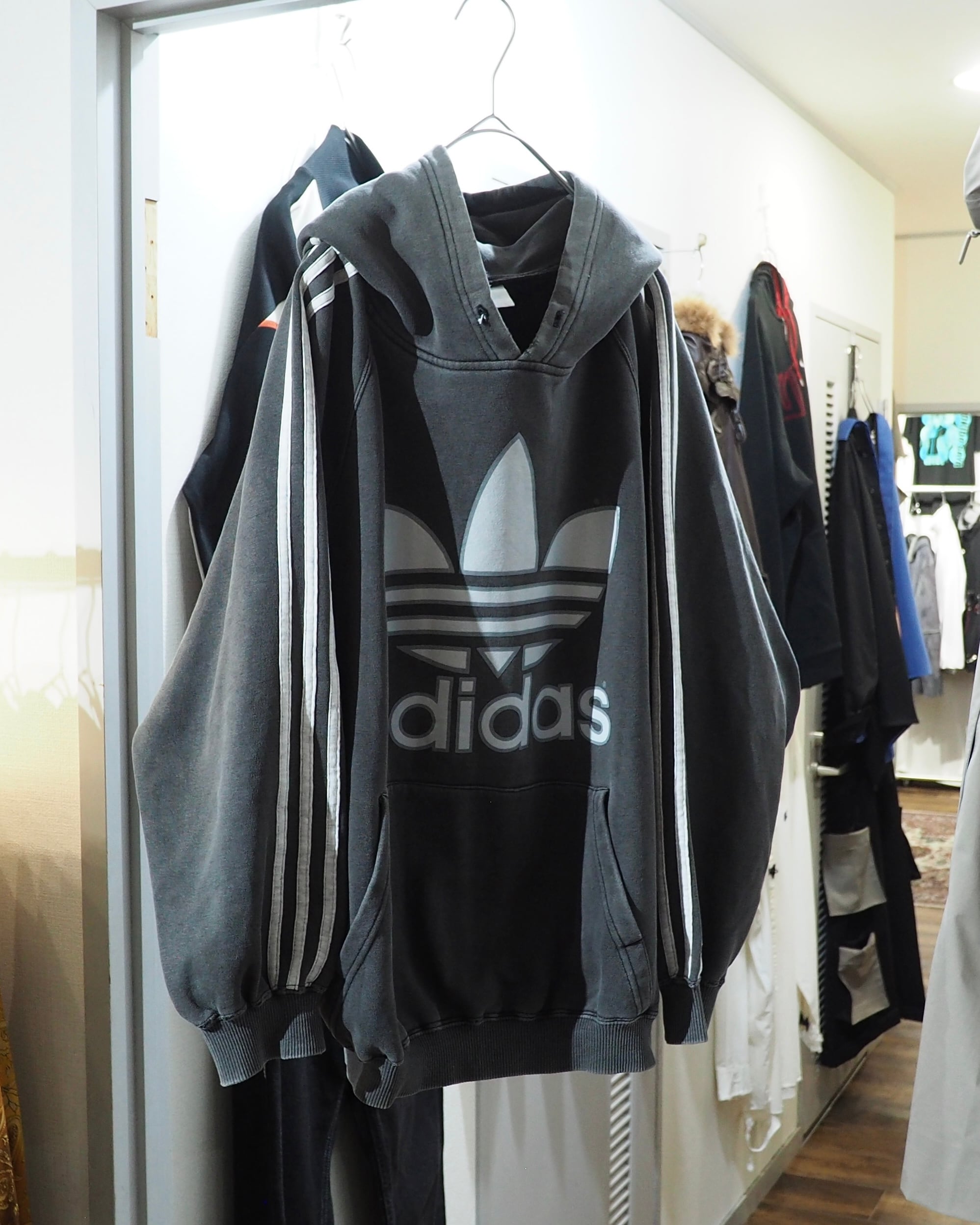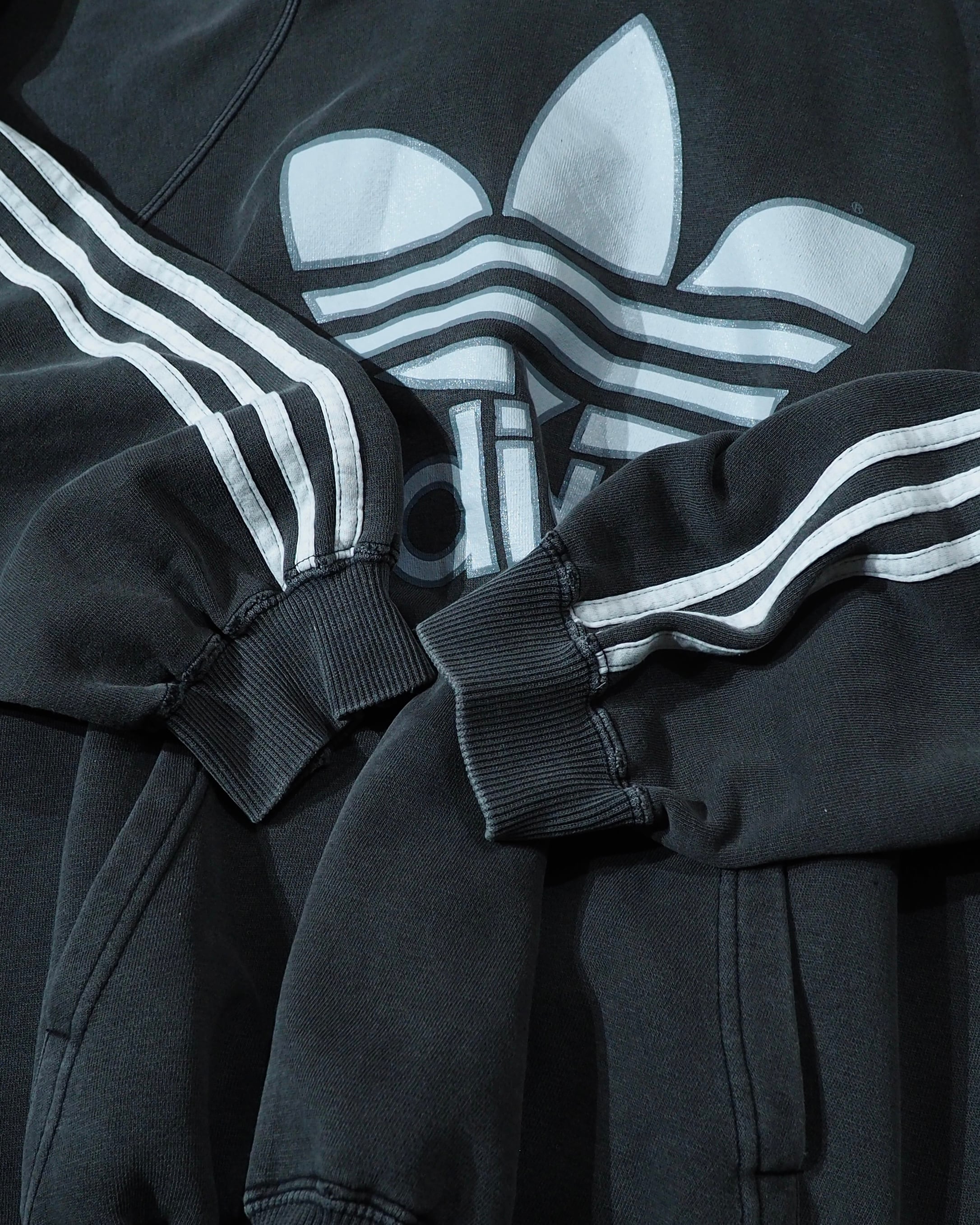 経年変化によりフェードに色落ちしたボディに転写されたトレフォイルロゴプリント×スリーライン刺繍が雰囲気の良いオールドアディダスのフーディ。