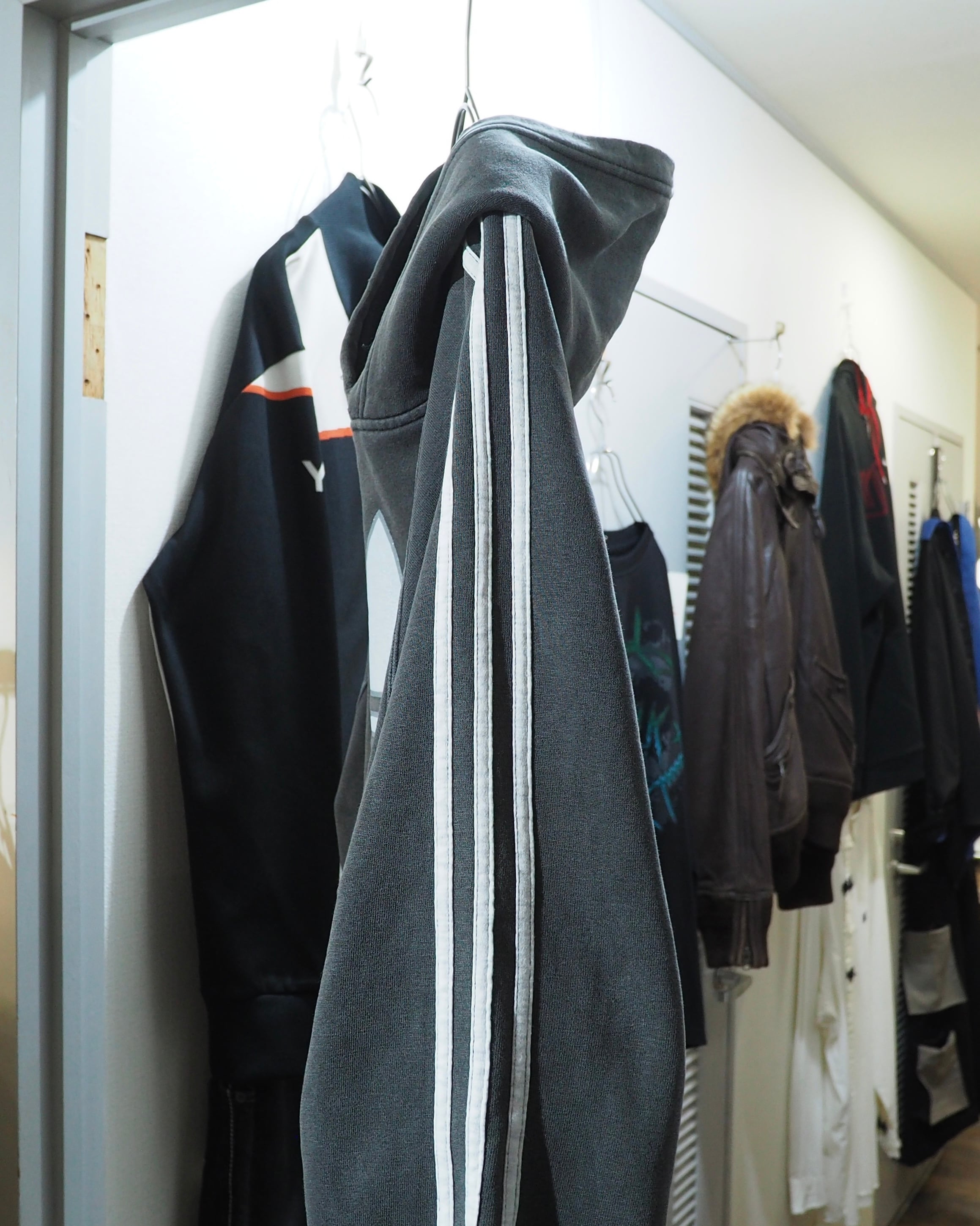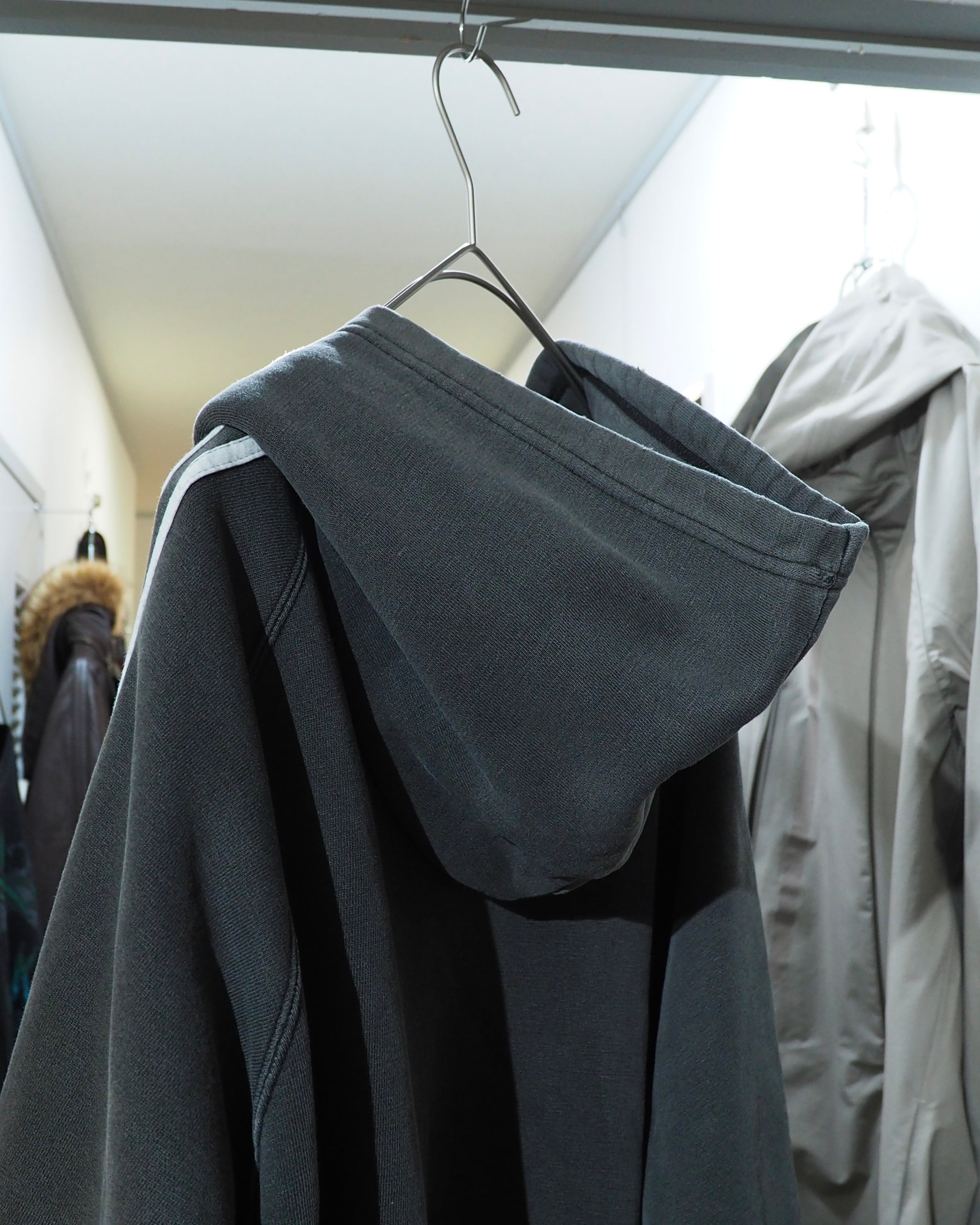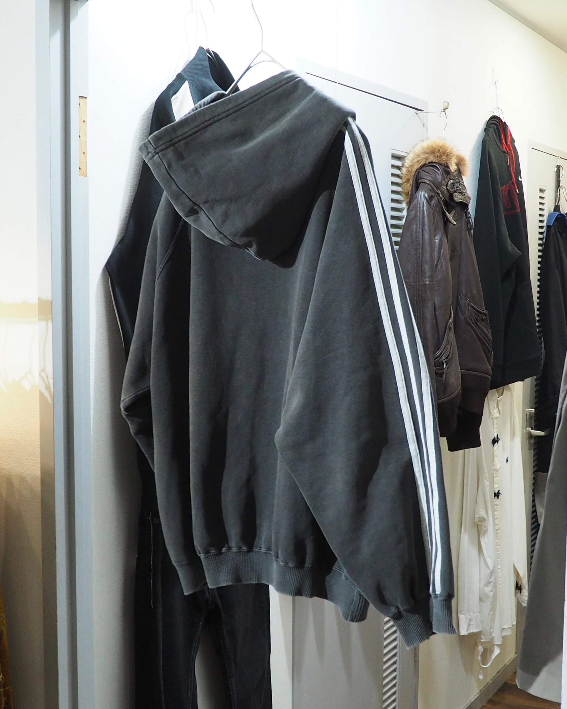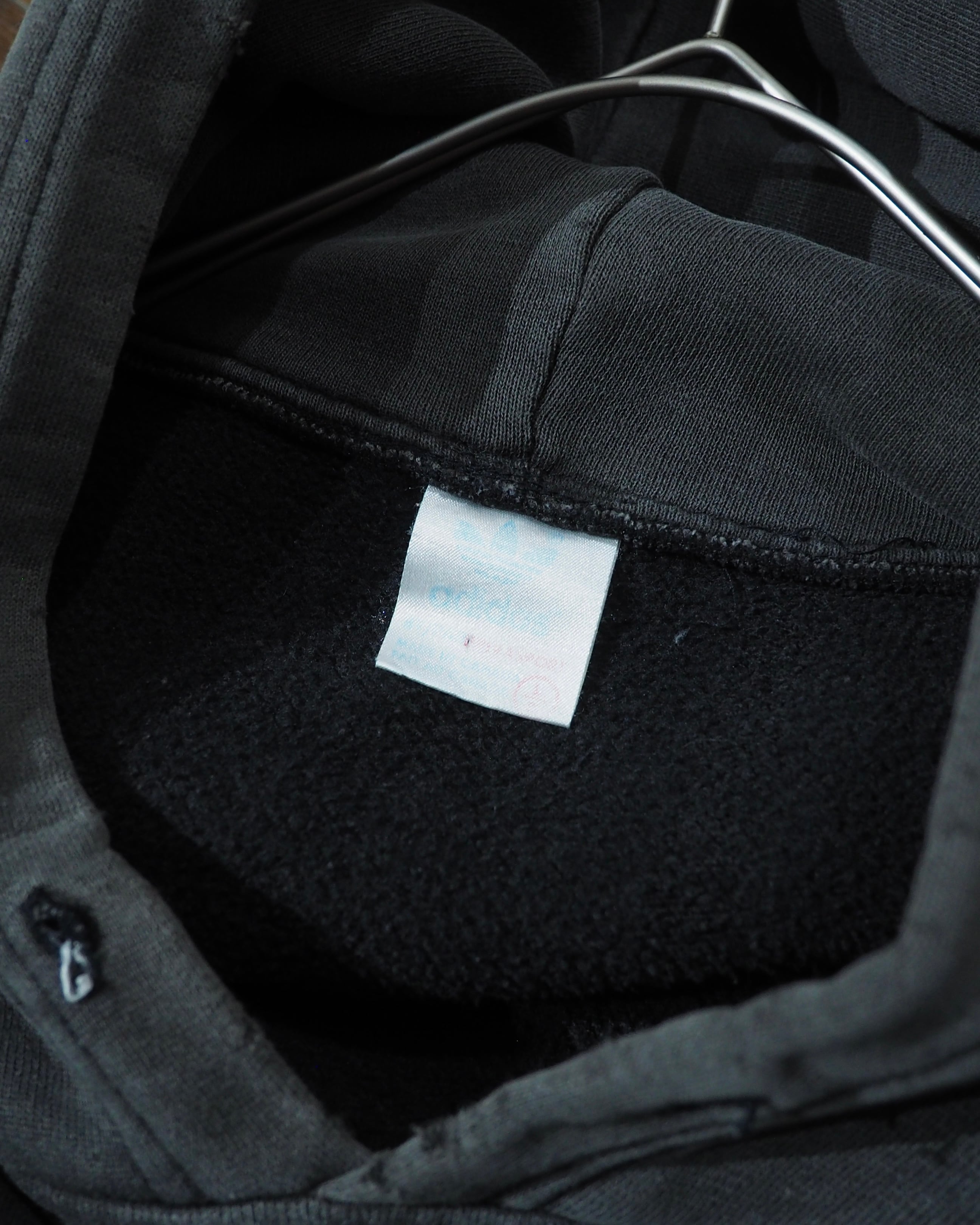 経年変化によりフェードに色落ちしたボディに転写されたトレフォイルロゴプリント×スリーライン刺繍が雰囲気の良いオールドアディダスのフーディ。