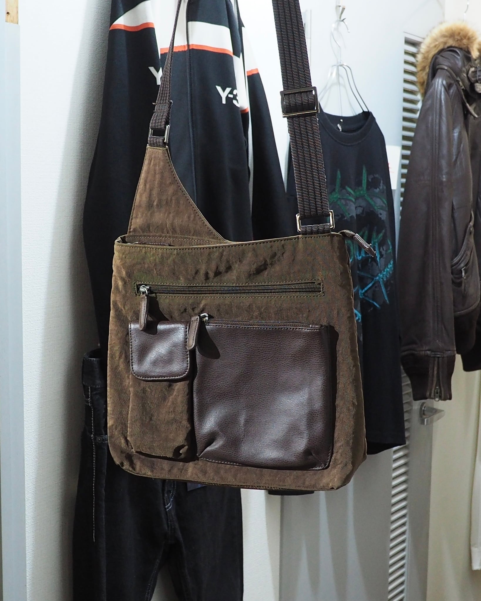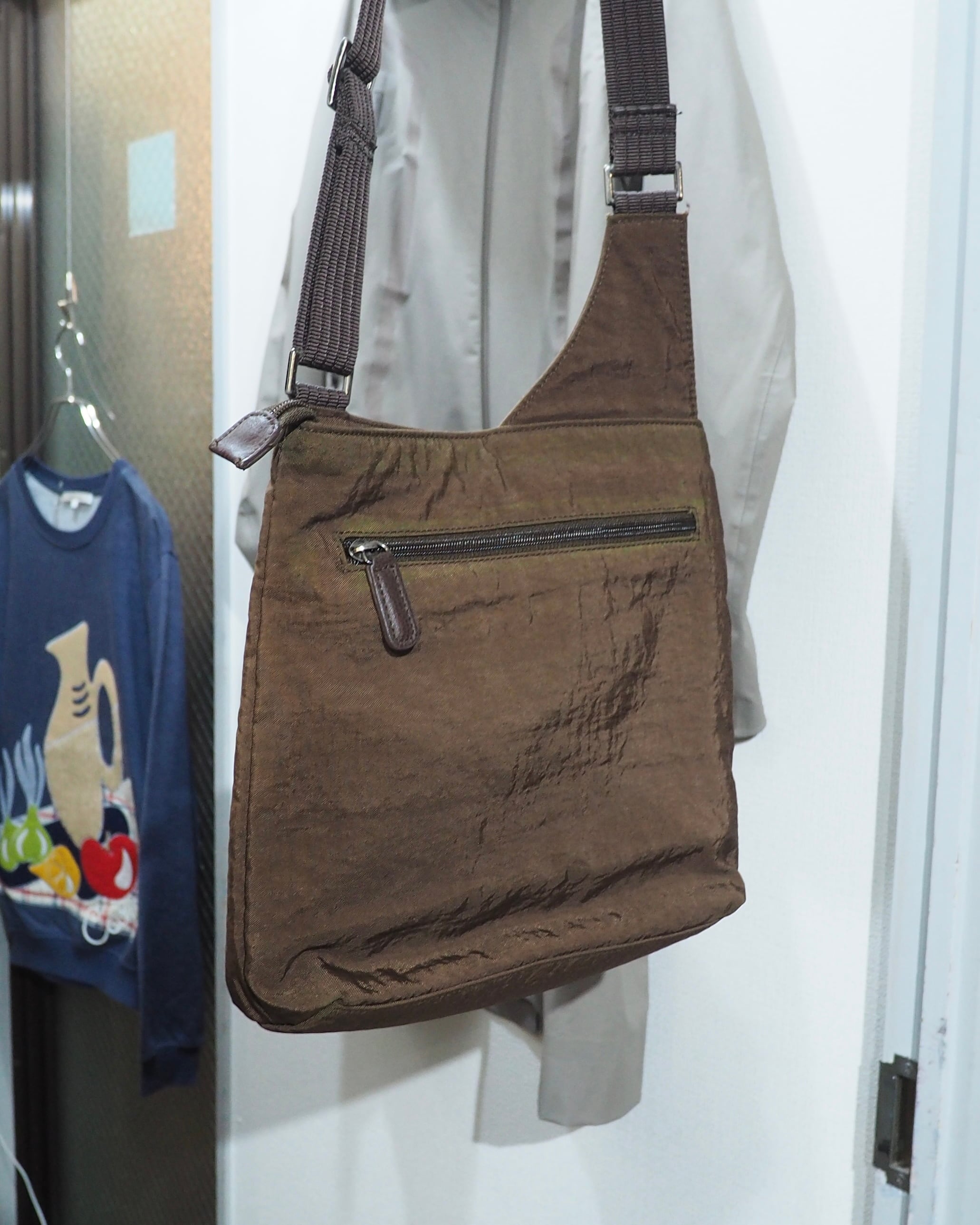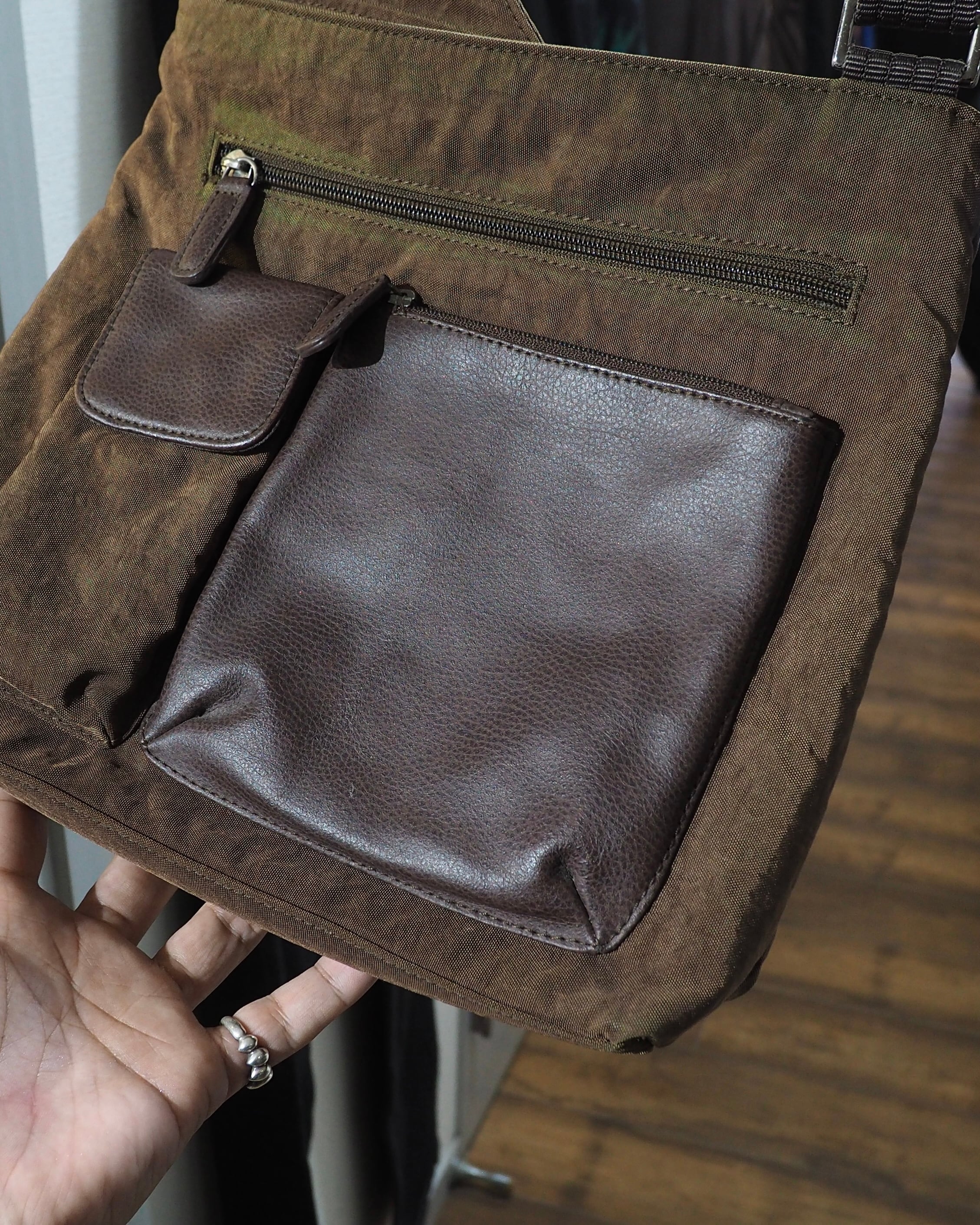 染色されたシボ感のあるナイロンボディに組み込まれたレザーパーツがオツなショルダーバッグ。某ハイブランドを彷彿させるシルエット。シンプルに良い。