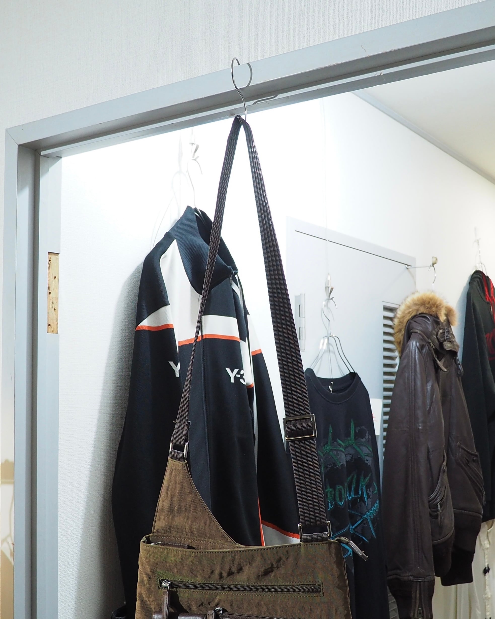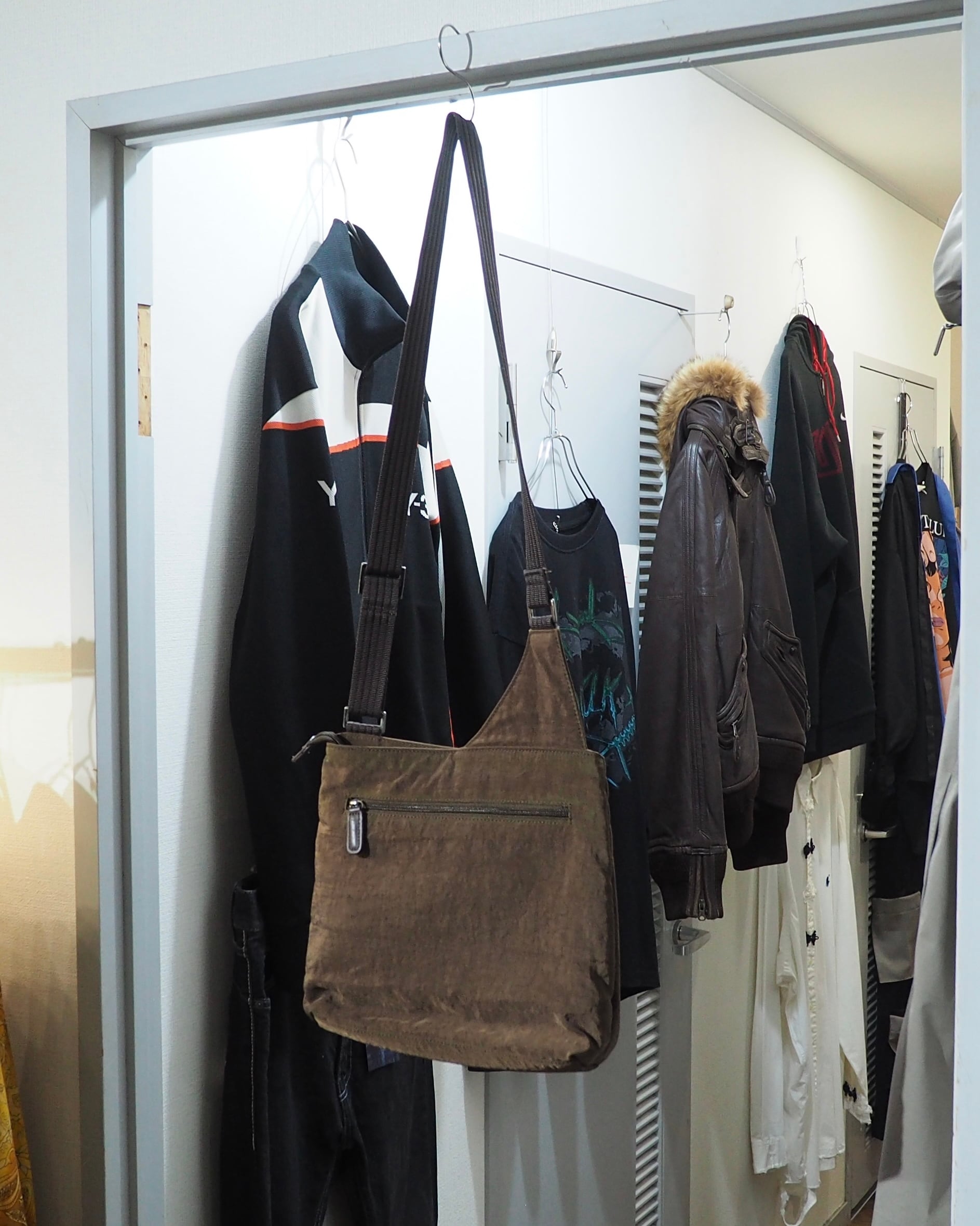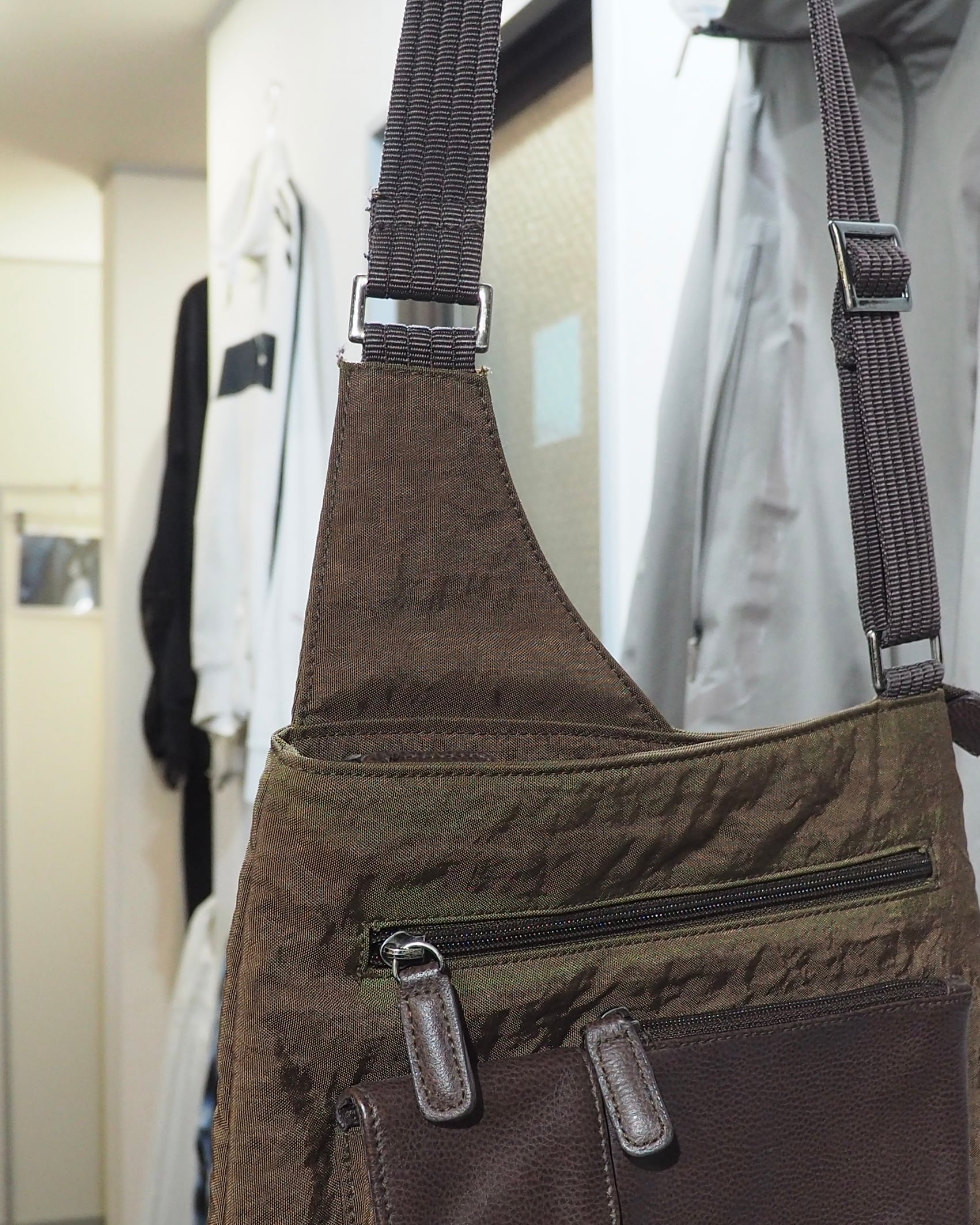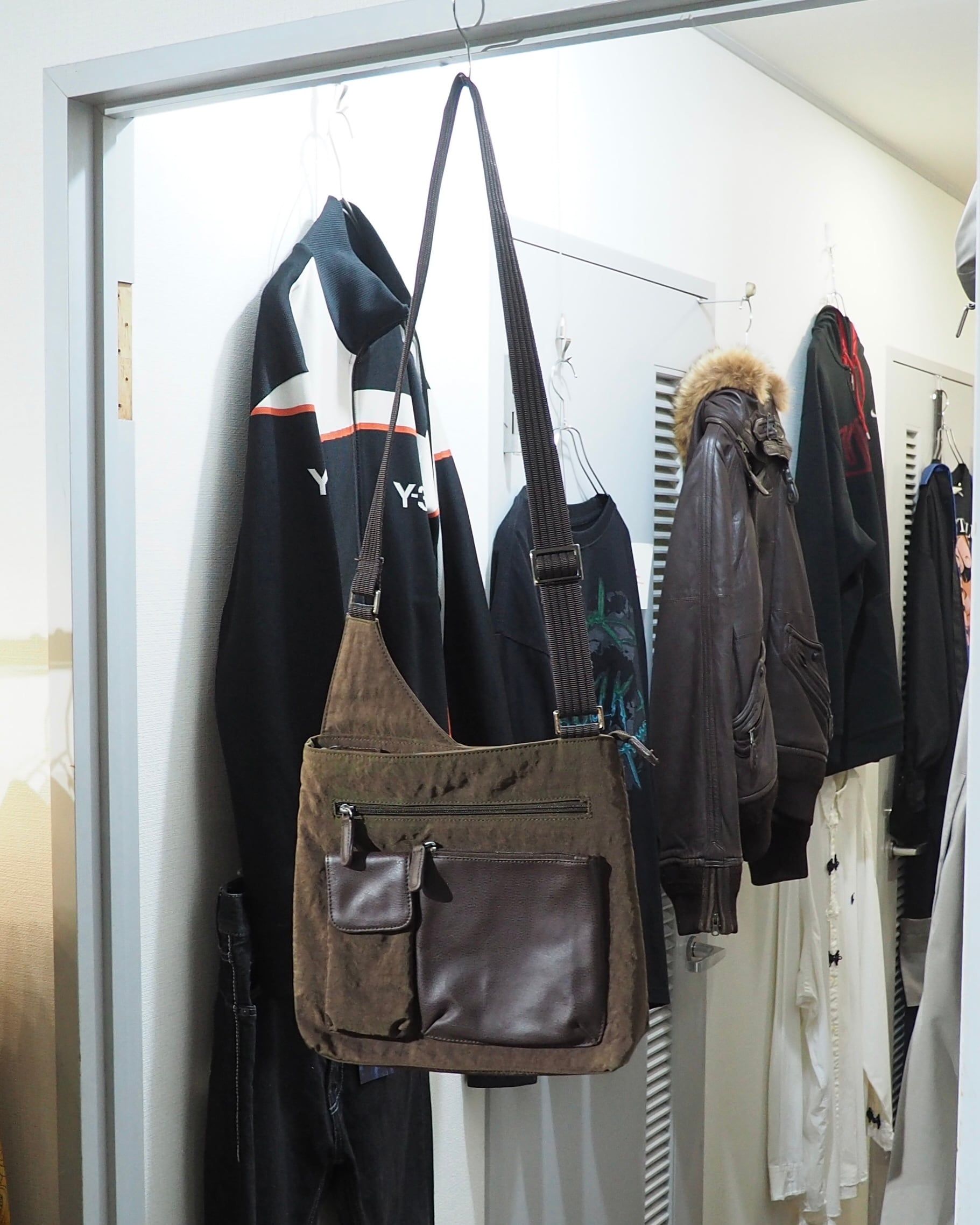 染色されたシボ感のあるナイロンボディに組み込まれたレザーパーツがオツなショルダーバッグ。某ハイブランドを彷彿させるシルエット。シンプルに良い。