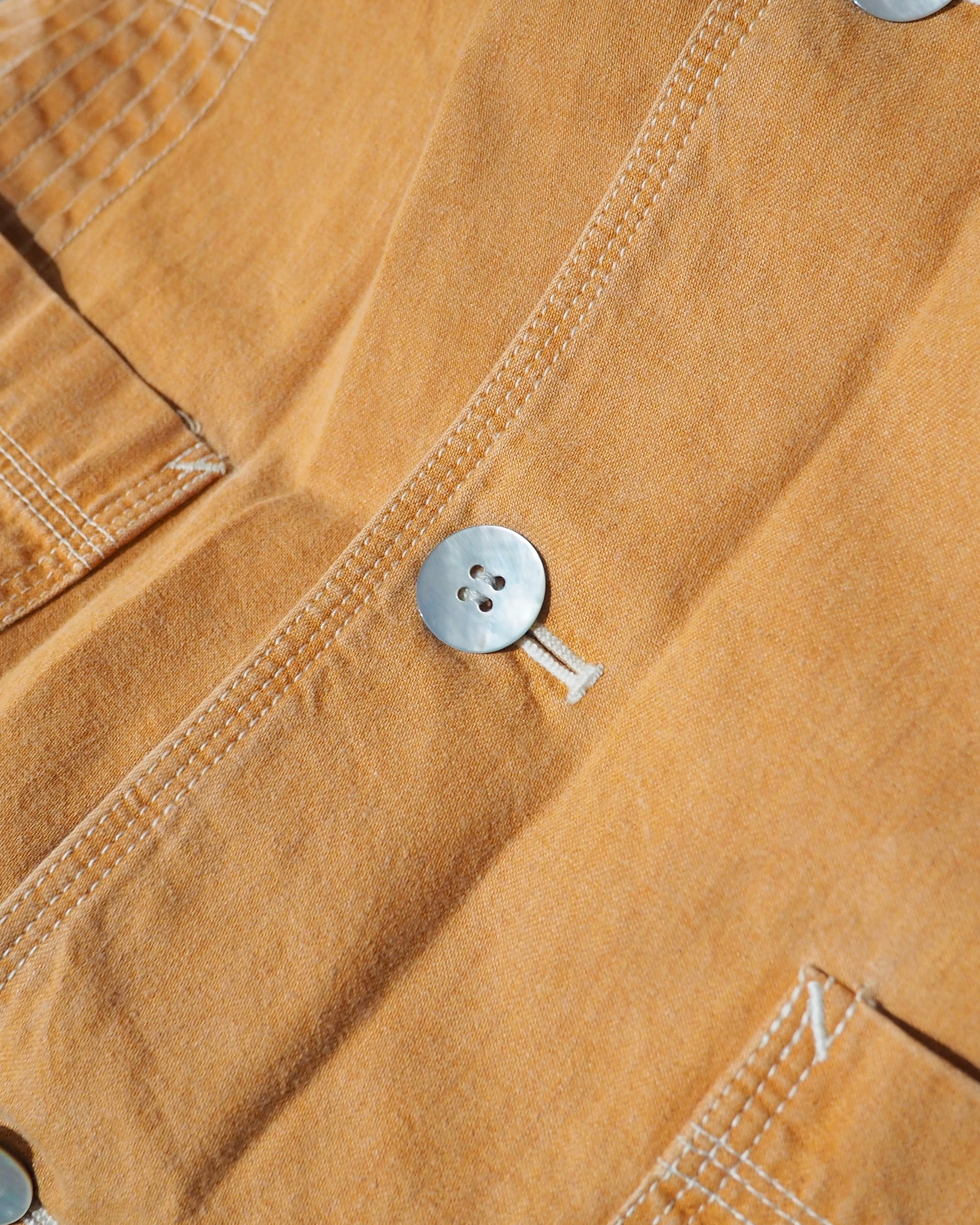 釦には光沢のあるシェルボタンを採用し、カジュアルなデザインとお色のボディにさりげなく上品な表情を落とし込んで。