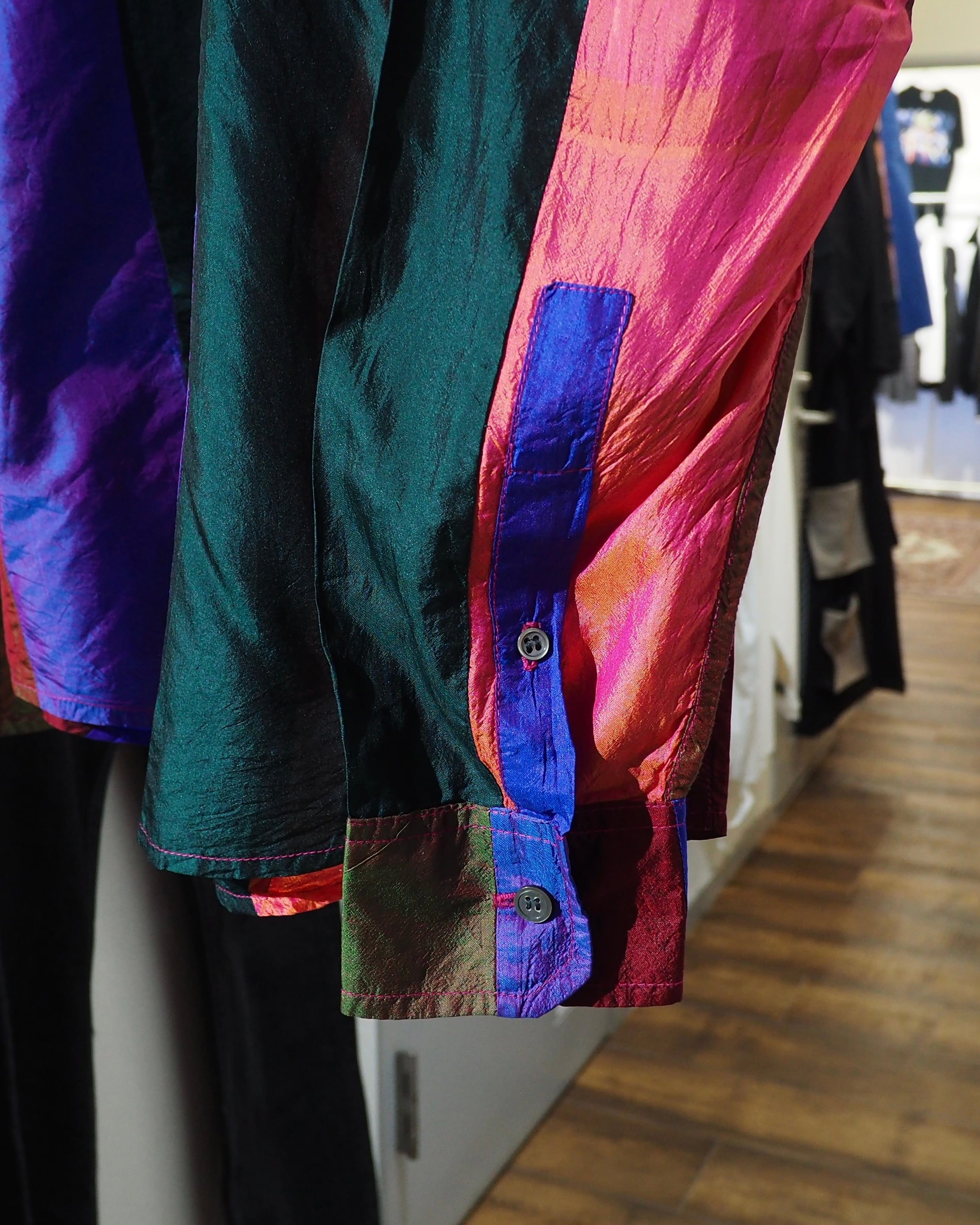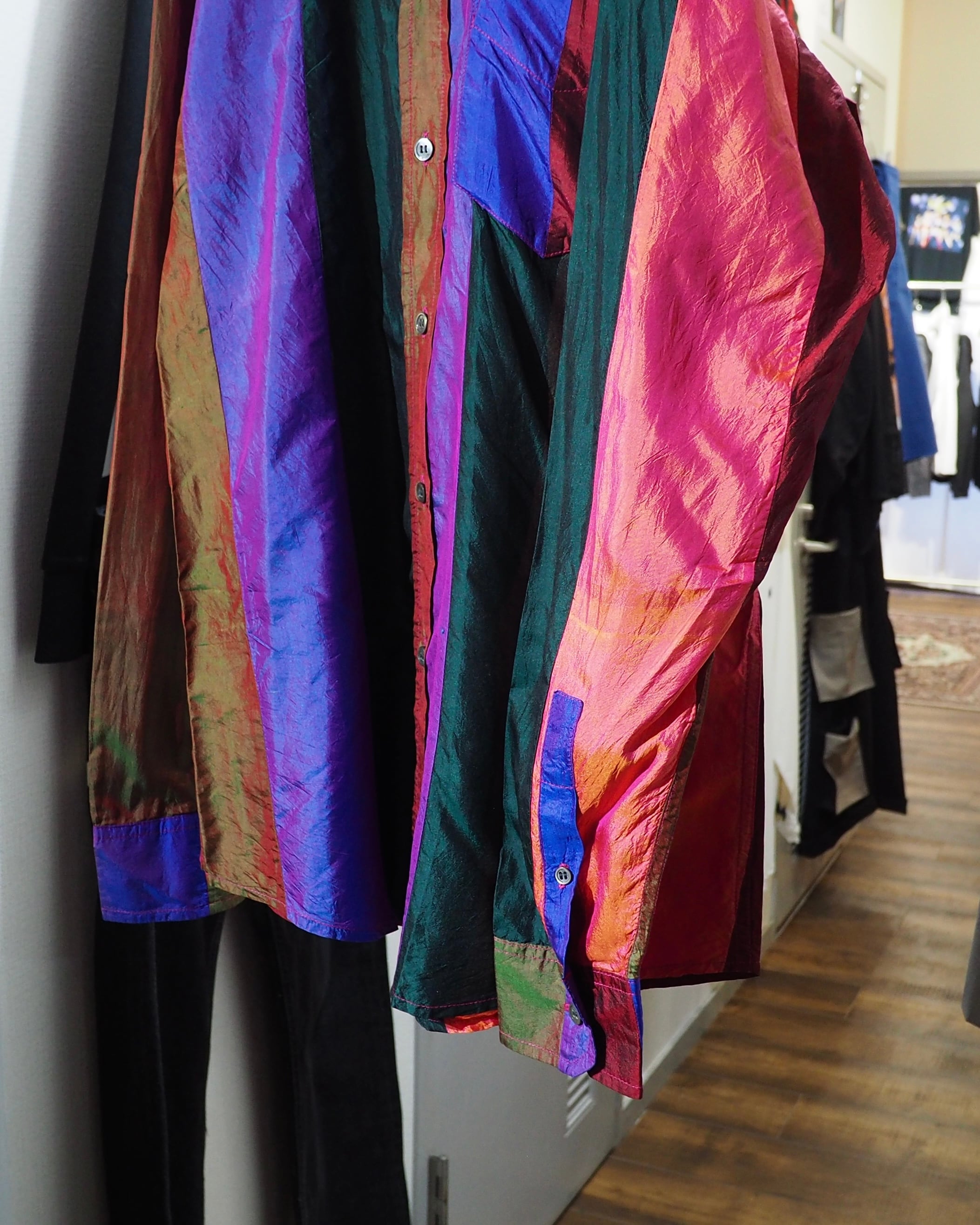 シルク特有の滑らかな落ち感と、角度によって玉虫のように輝く発色。ドレスシャツの端正なシルエットをベースにしながら、配色と素材のコントラストでしっかりと個性を主張してくれます。
