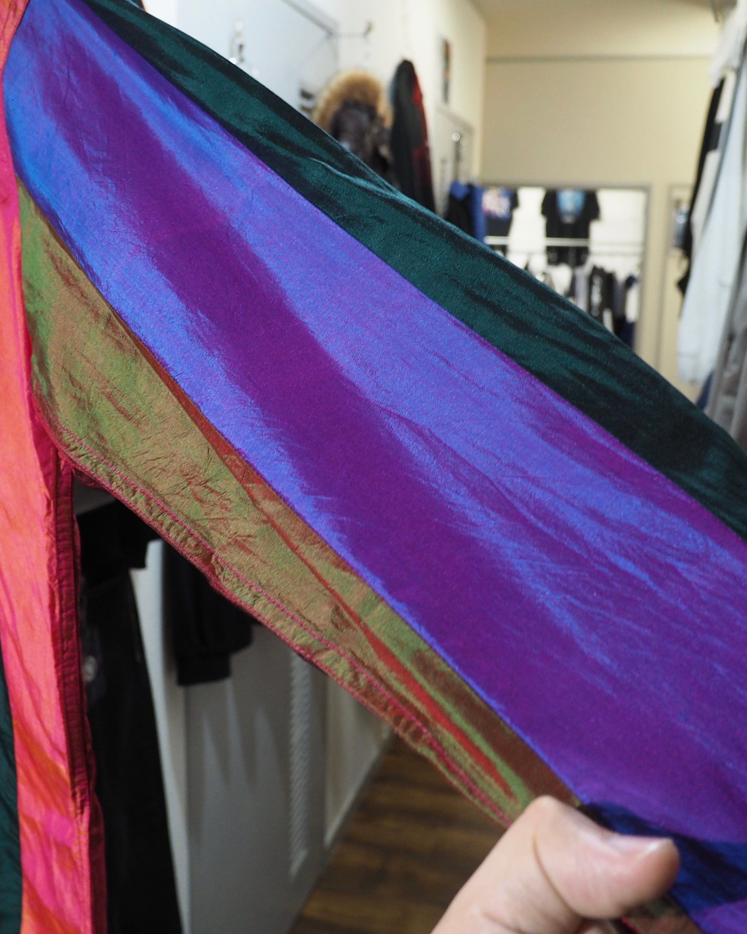 目を惹くのは、光の当たり方で表情を変える艶やかなシルク生地。
