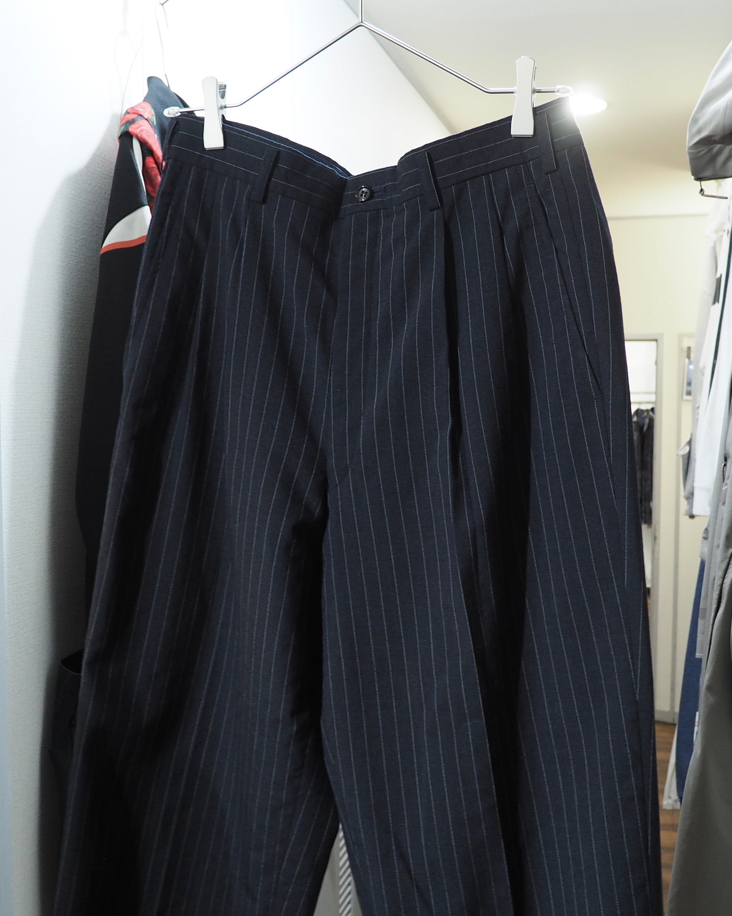 同生地で構成されたスラックスは美しいストレートシルエットに幅広ワイドなデザイン。
