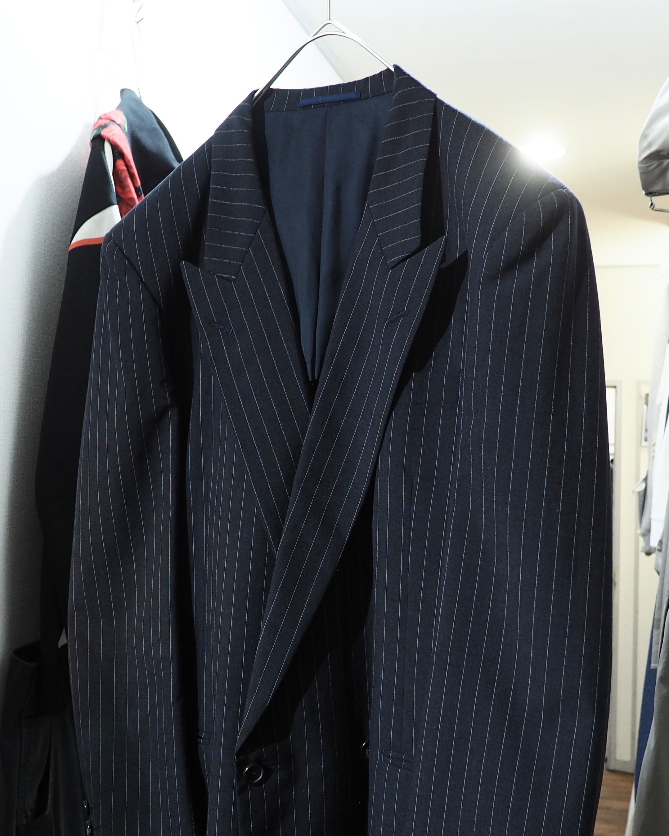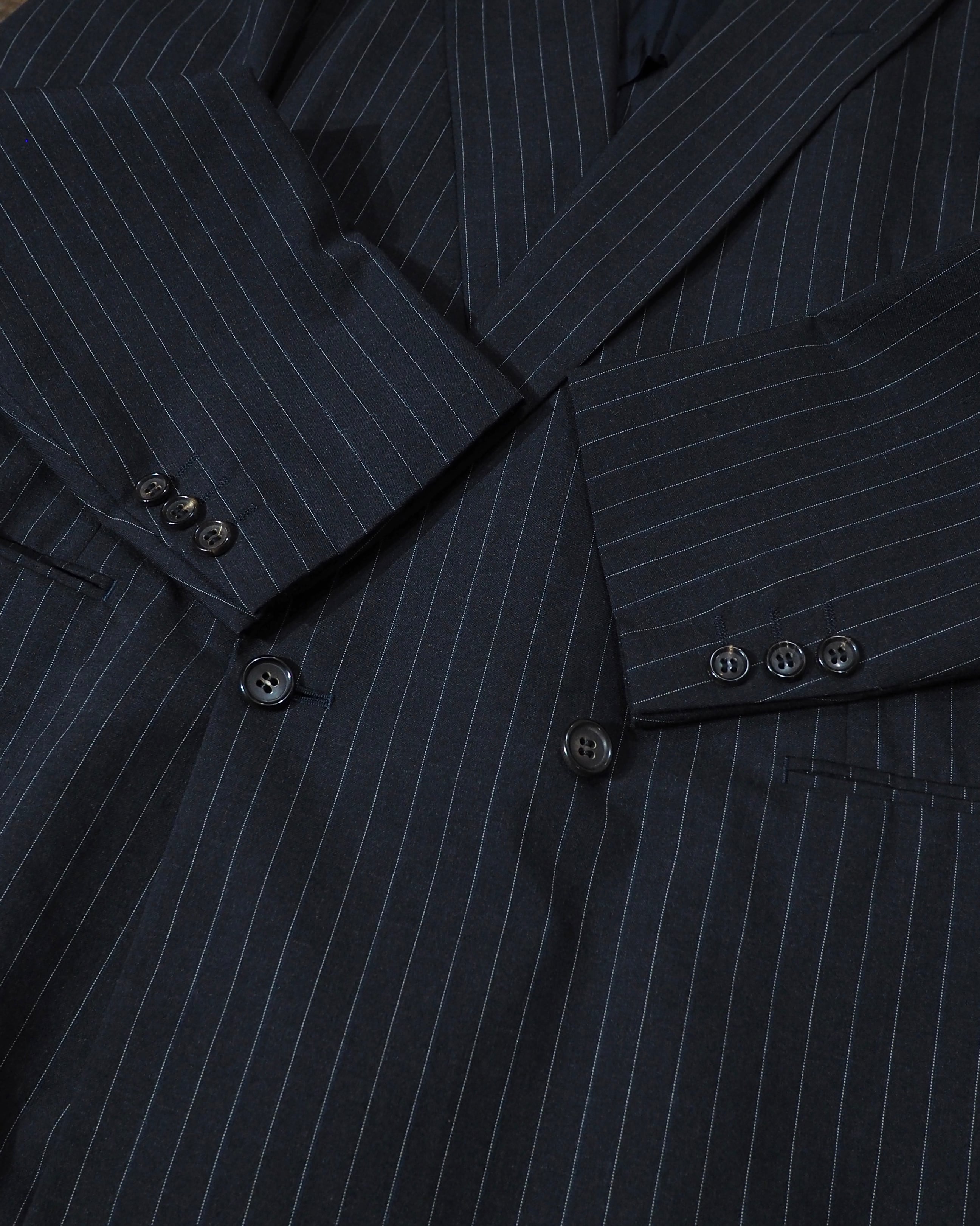 黒に限りなく近い深いグレーのボディに、繊細に走るピンストライプ。