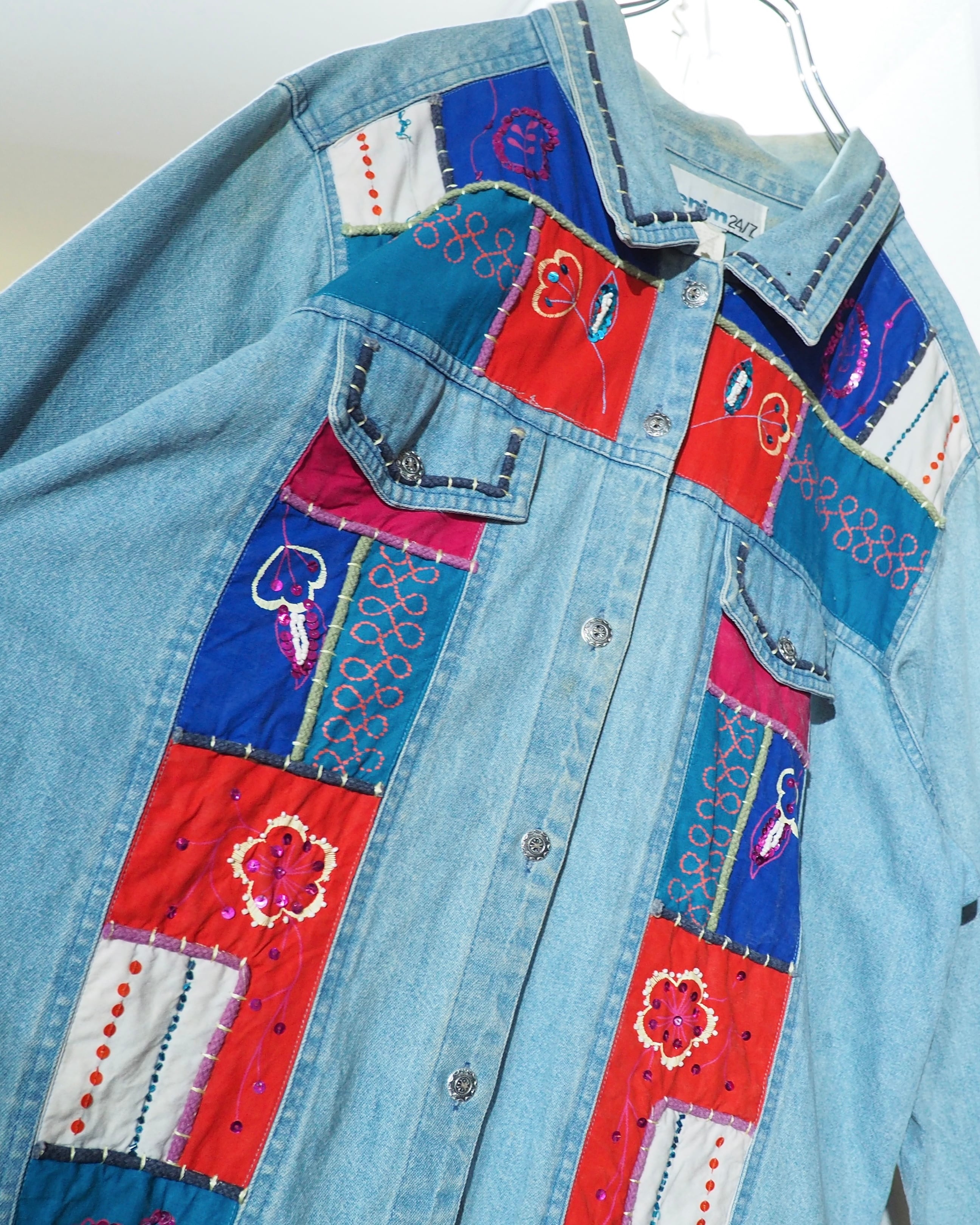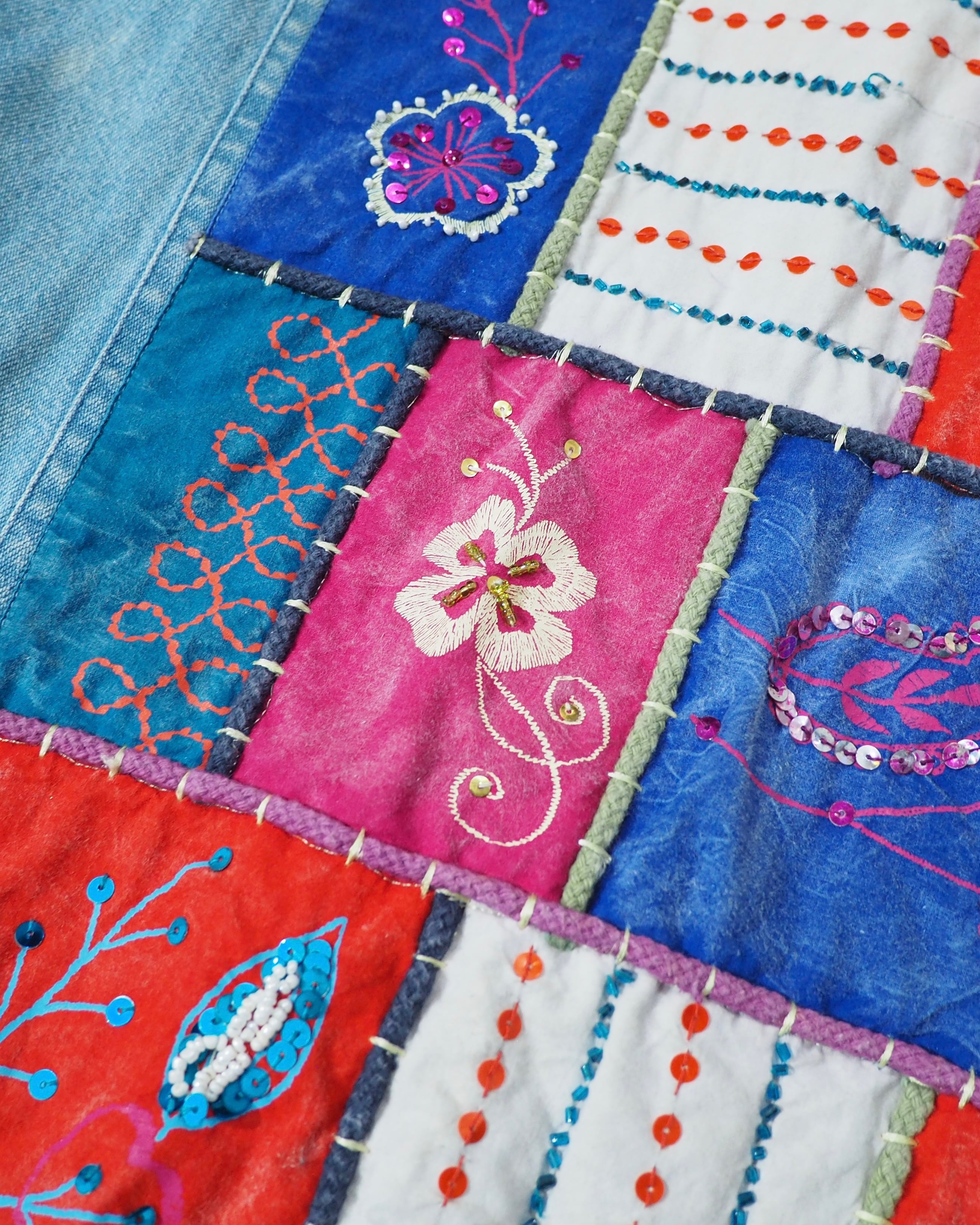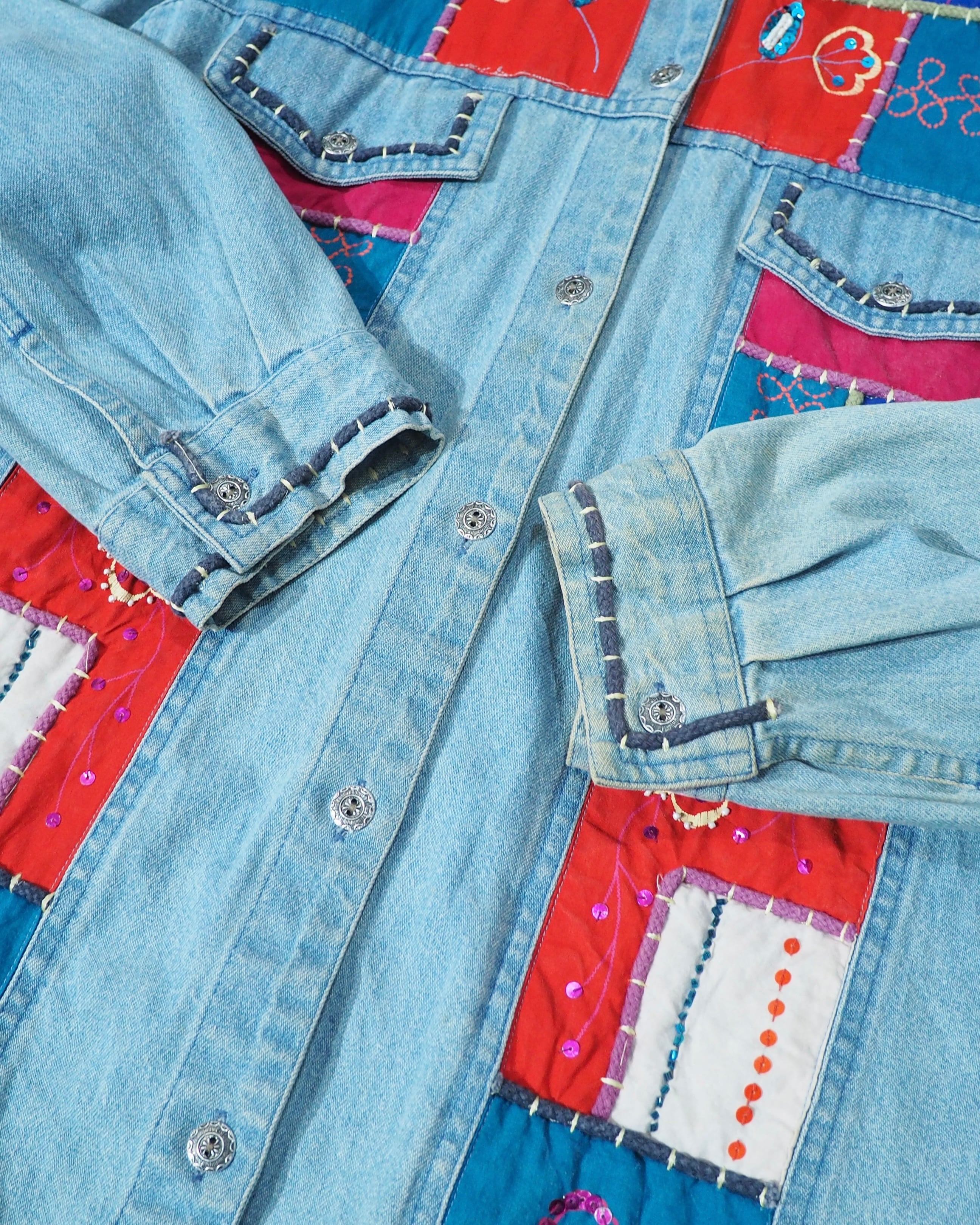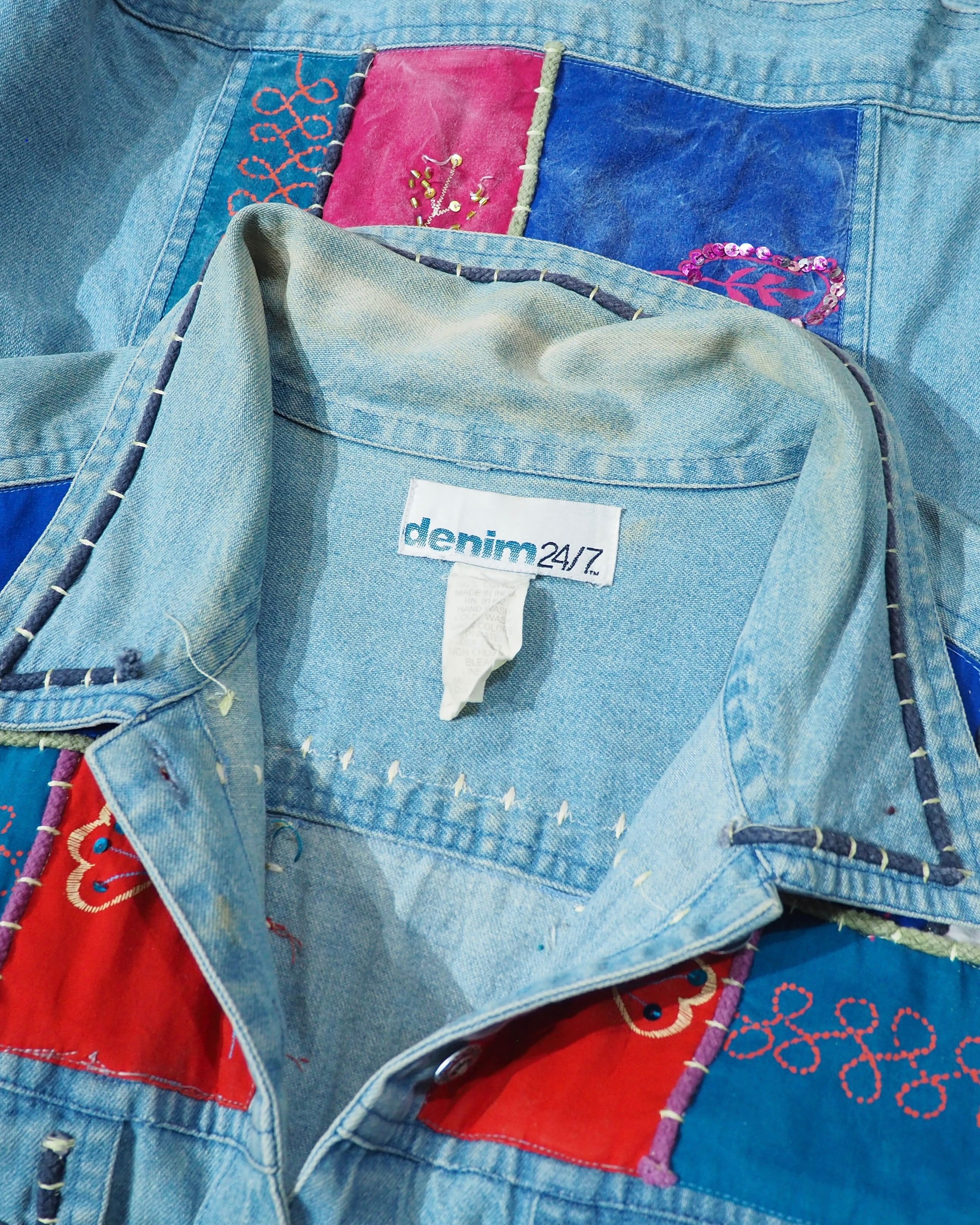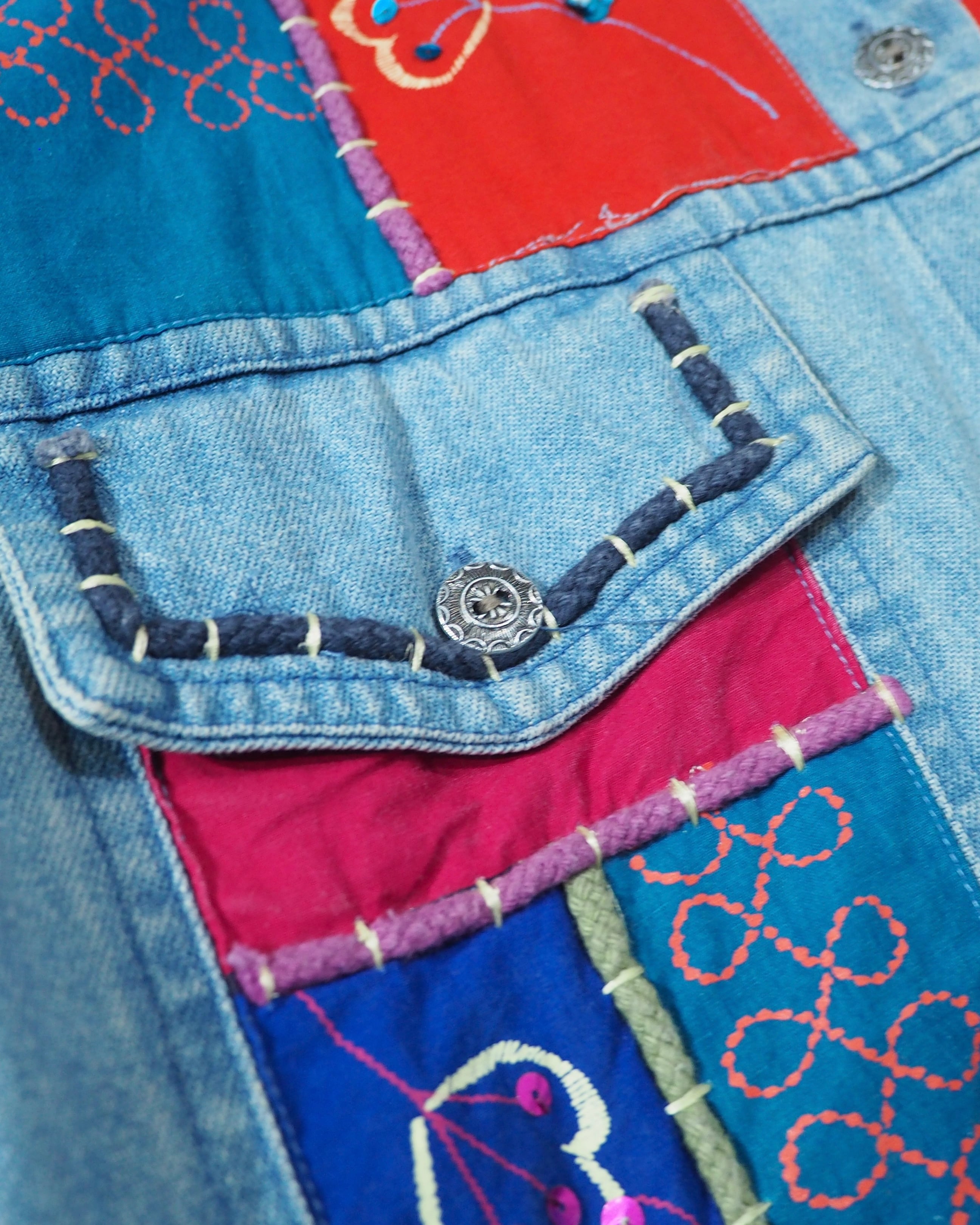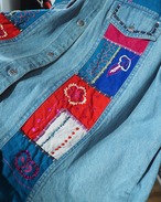 フェードによってやわらかく褪せたインディゴデニムに、色鮮やかなパッチワーク刺繍を贅沢に乗せたデニムジャケット。