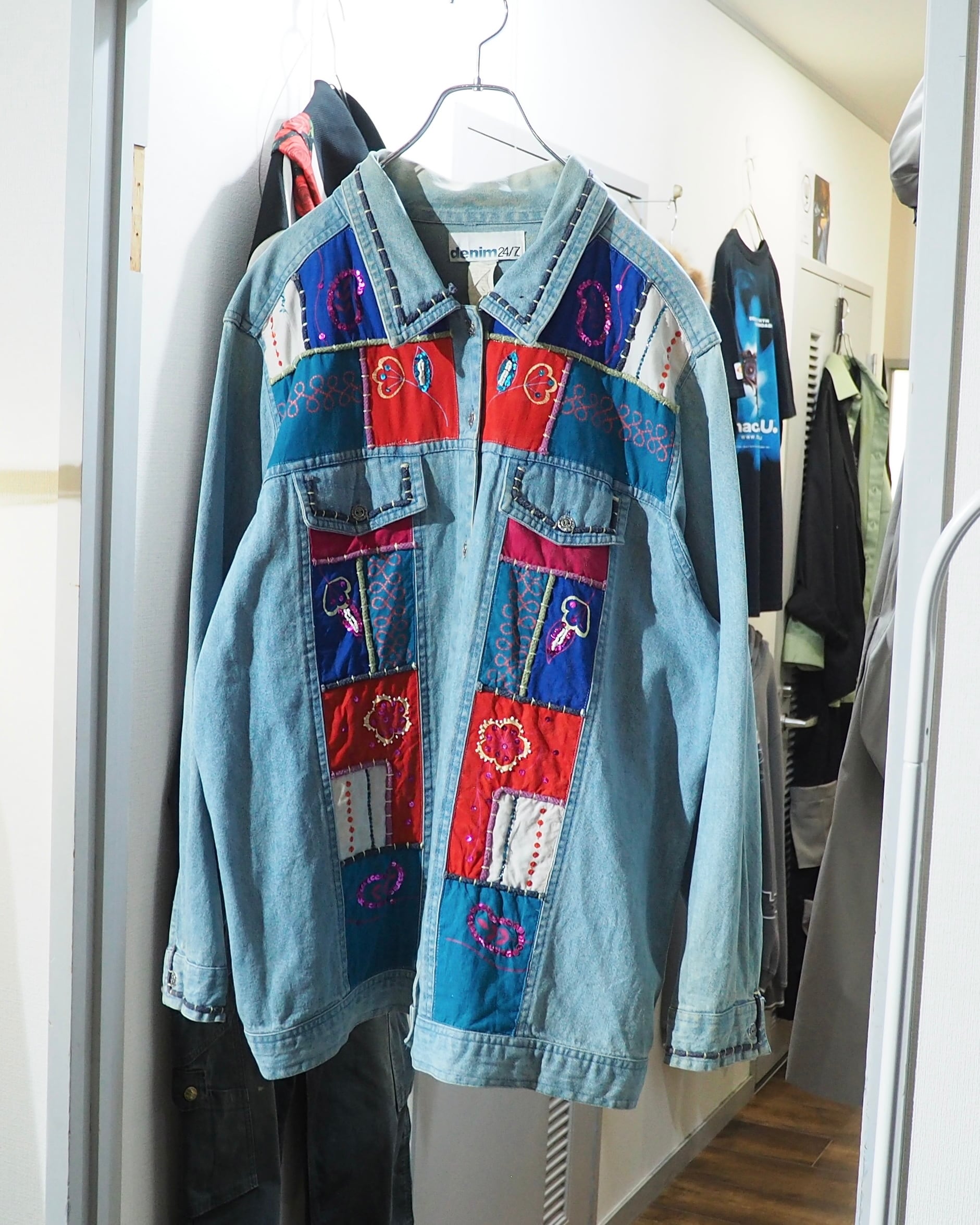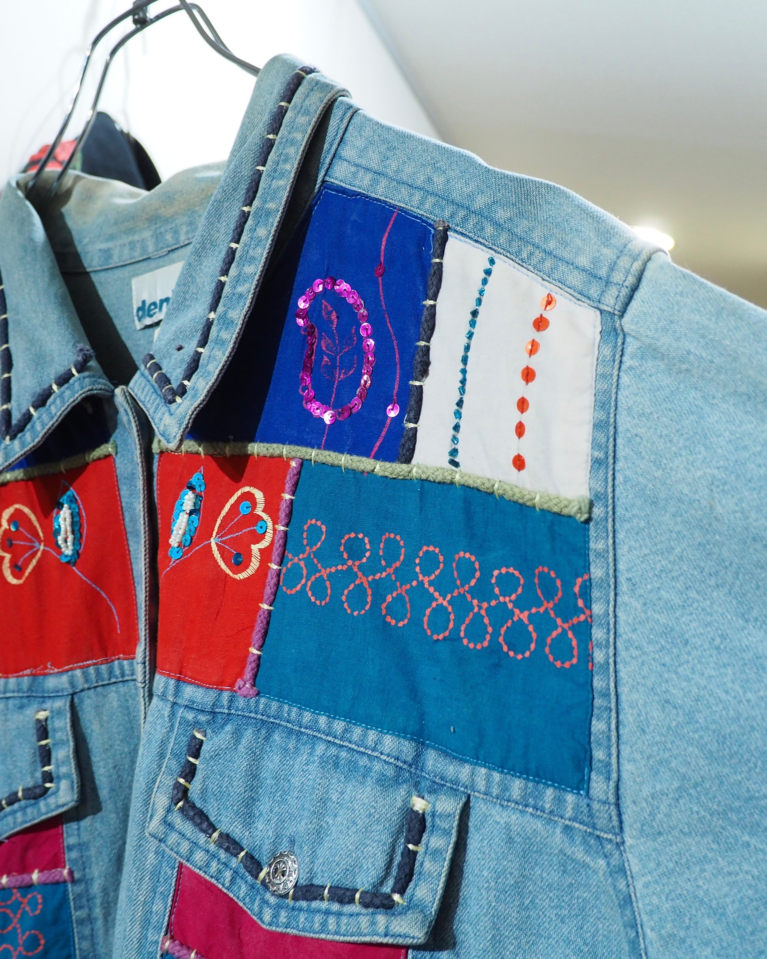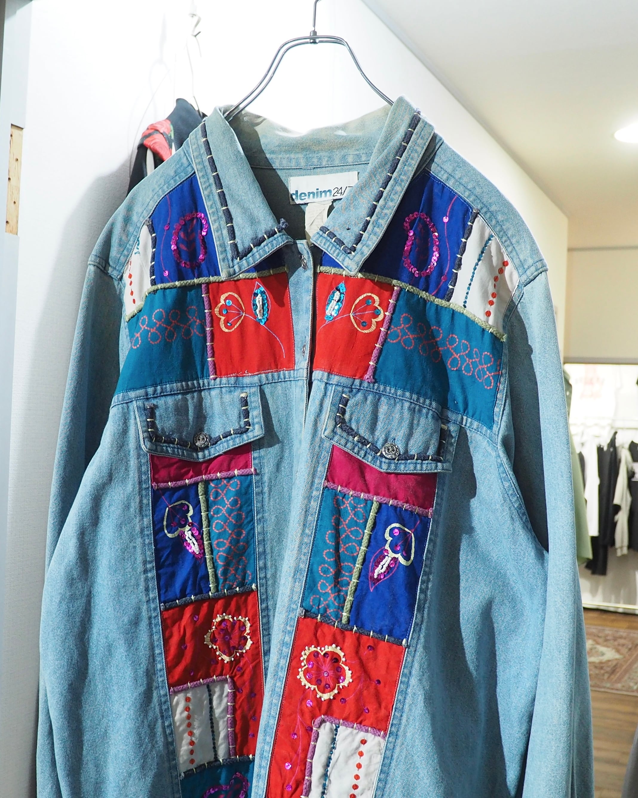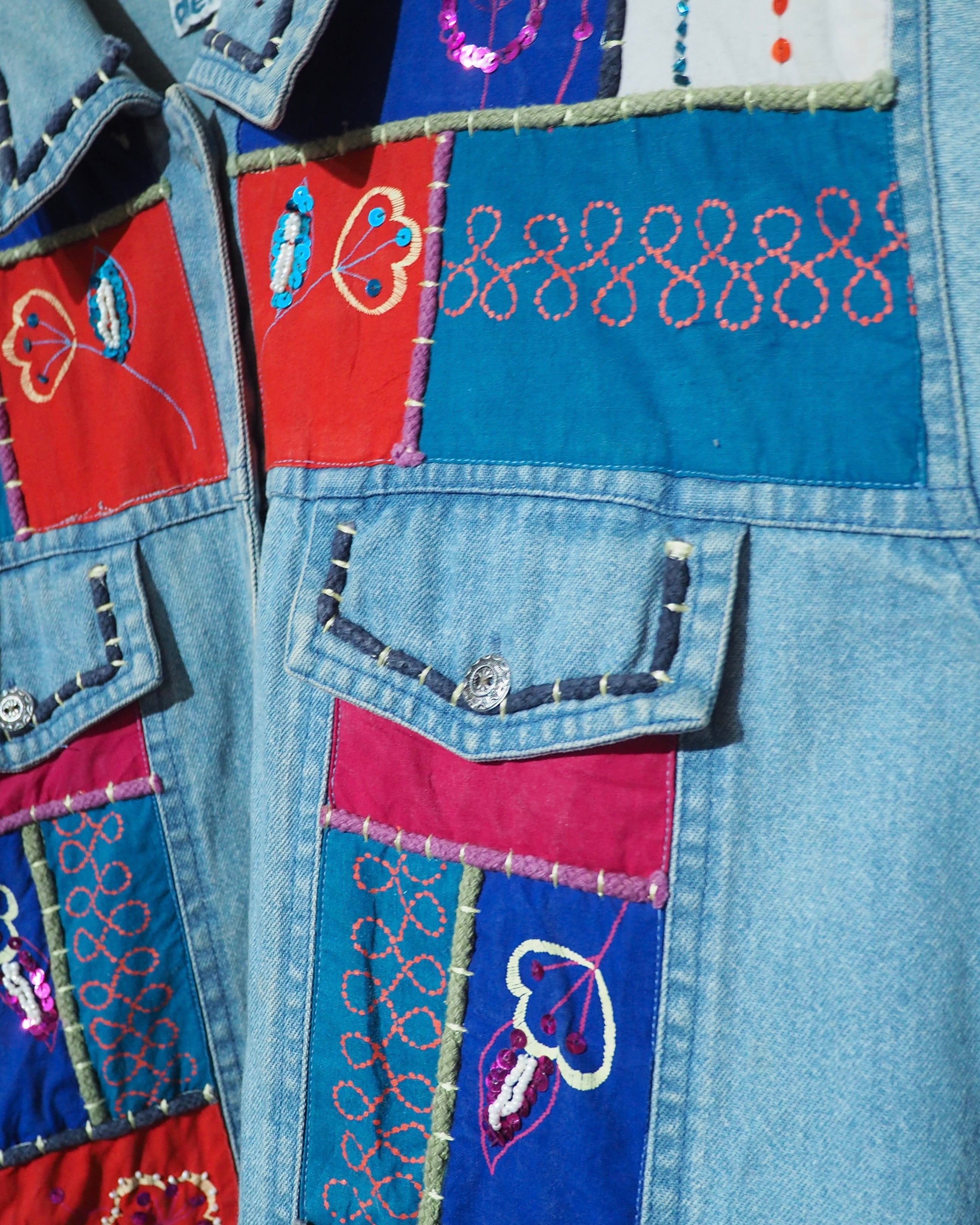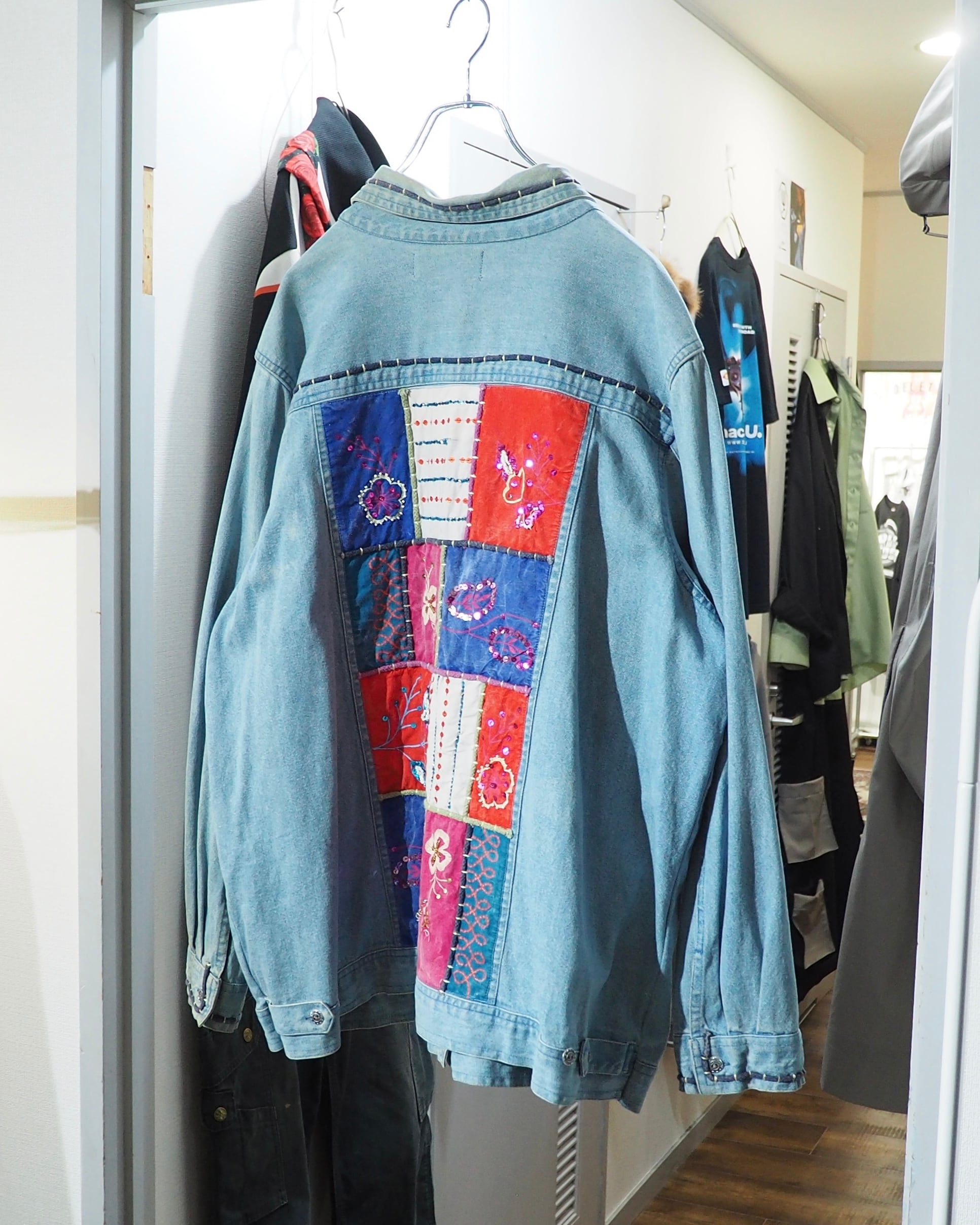 フェードによってやわらかく褪せたインディゴデニムに、色鮮やかなパッチワーク刺繍を贅沢に乗せたデニムジャケット。