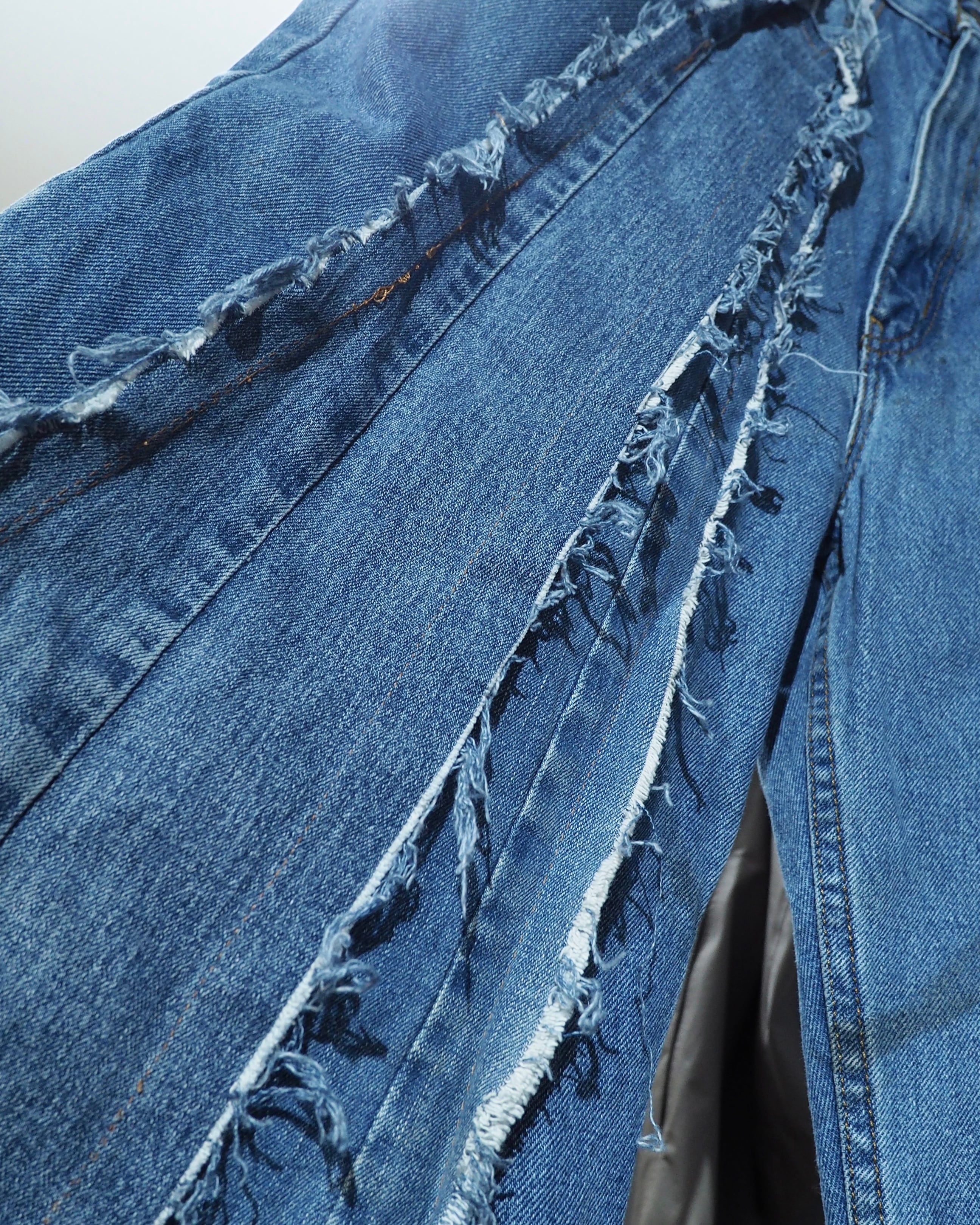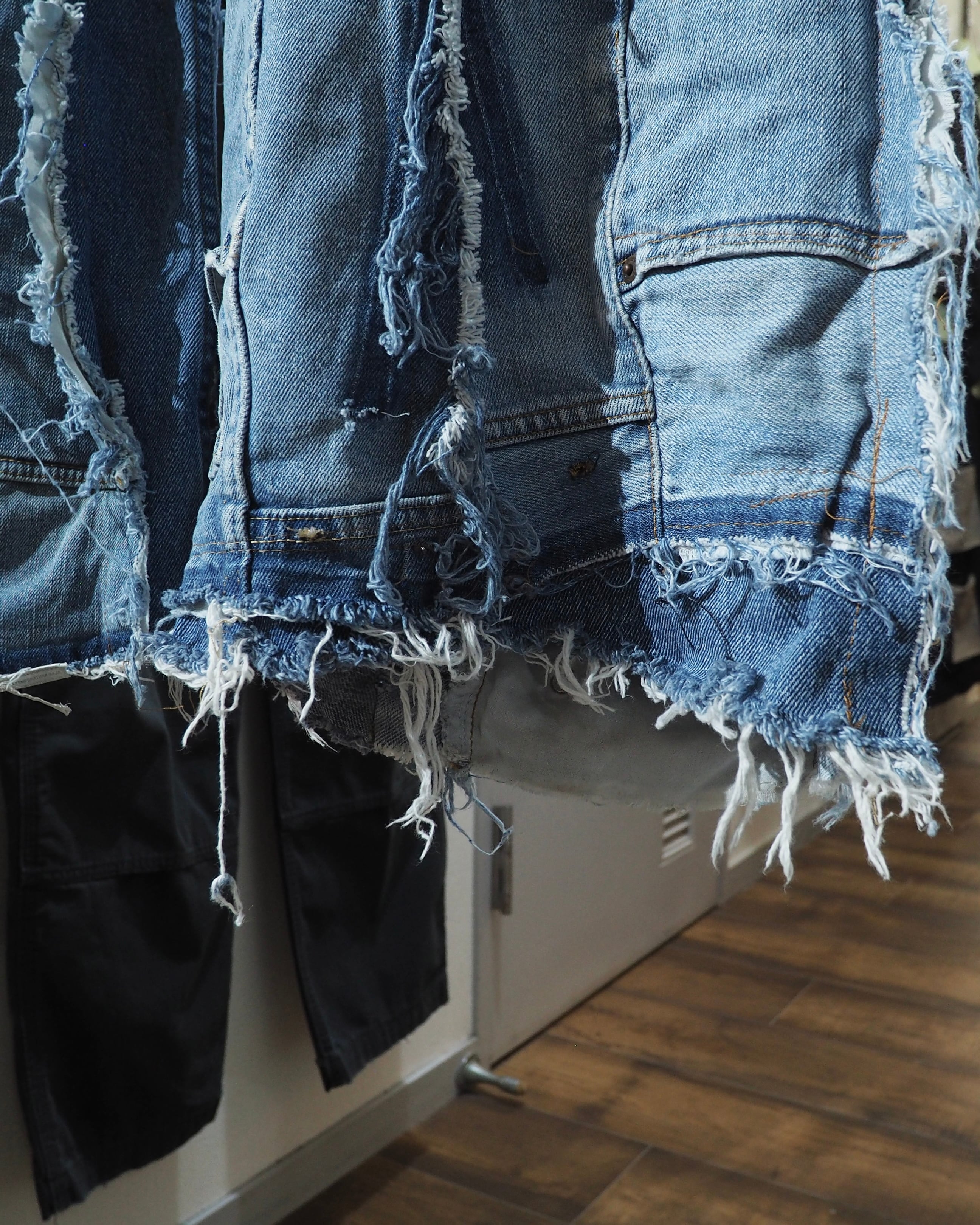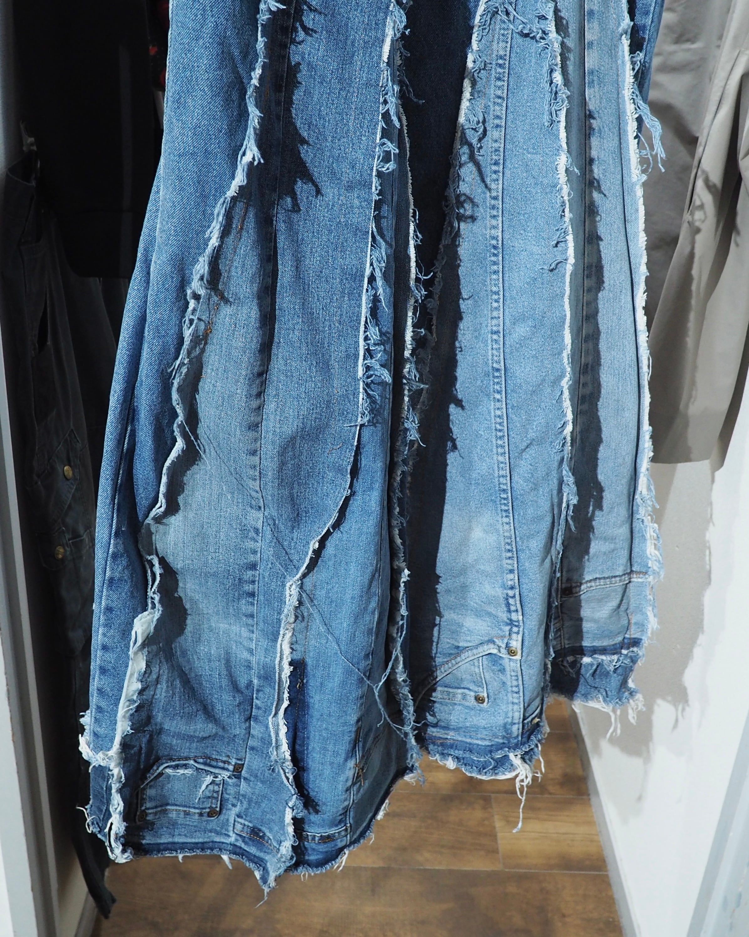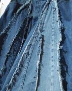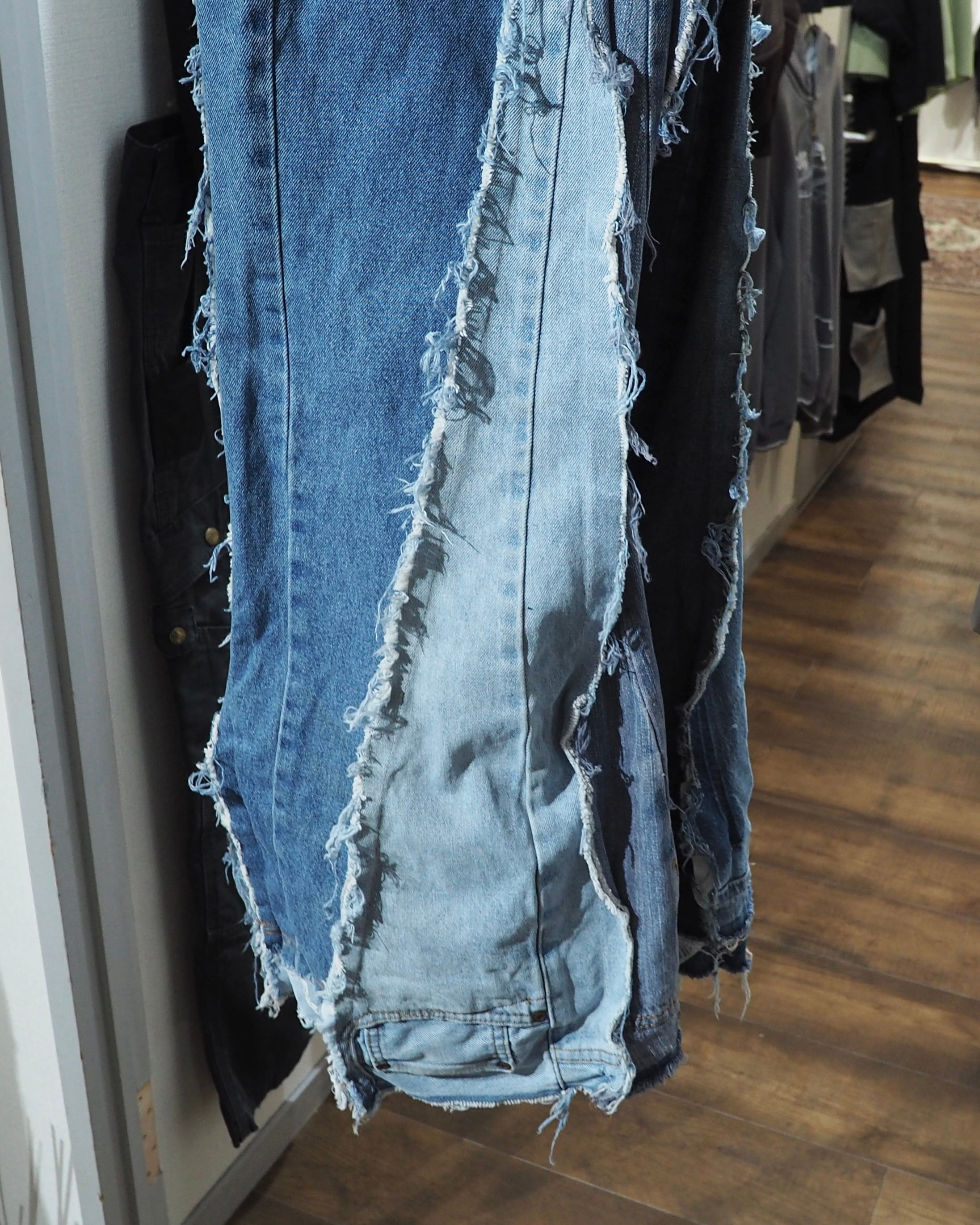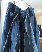 濃淡の異なるインディゴが織りなすコントラストに、断ち切りのフリンジディテールが随所に走り、ラフでありながらも計算された存在感を演出。立体的に広がるワイドバギーシルエットが、歩くたびに揺れ動き圧倒的な雰囲気を纏います。