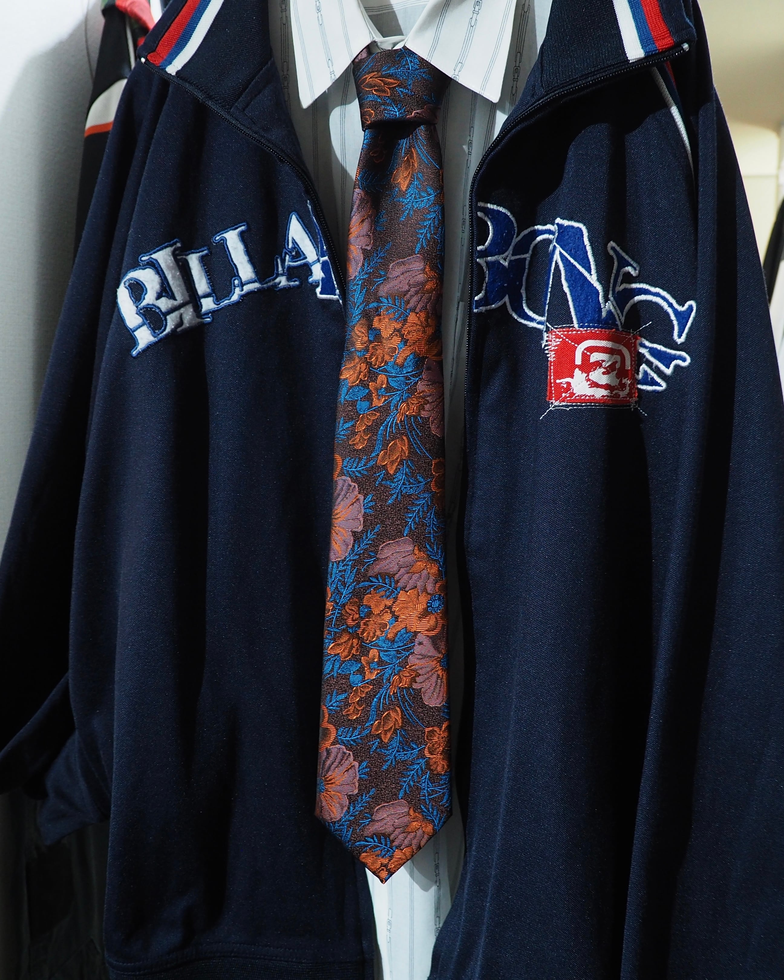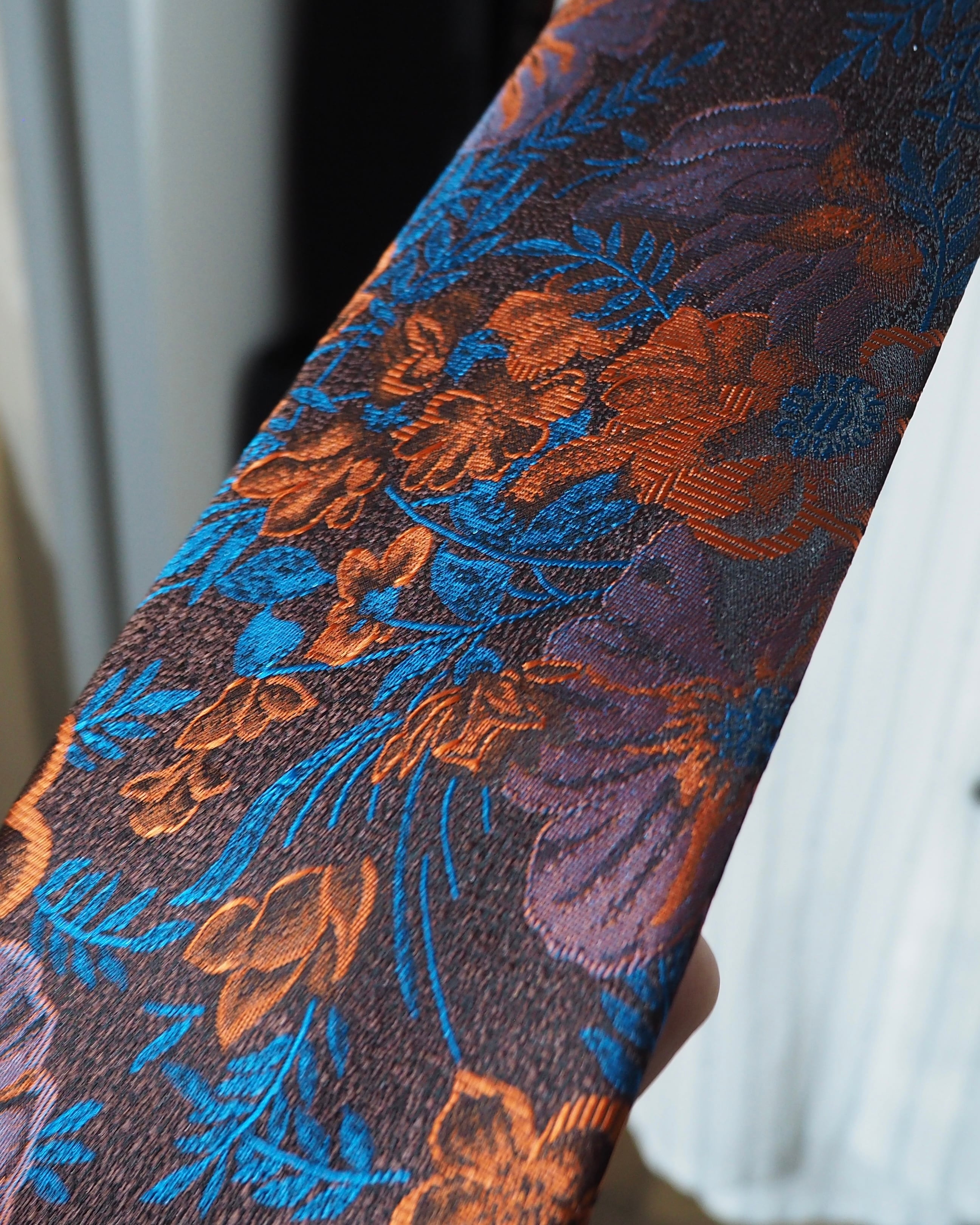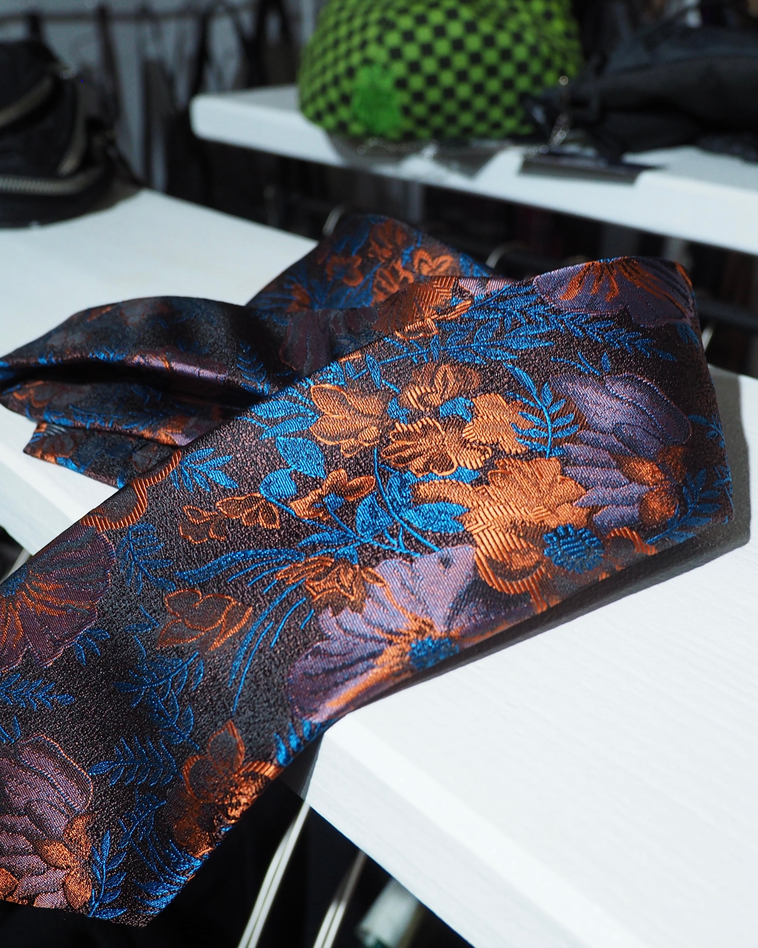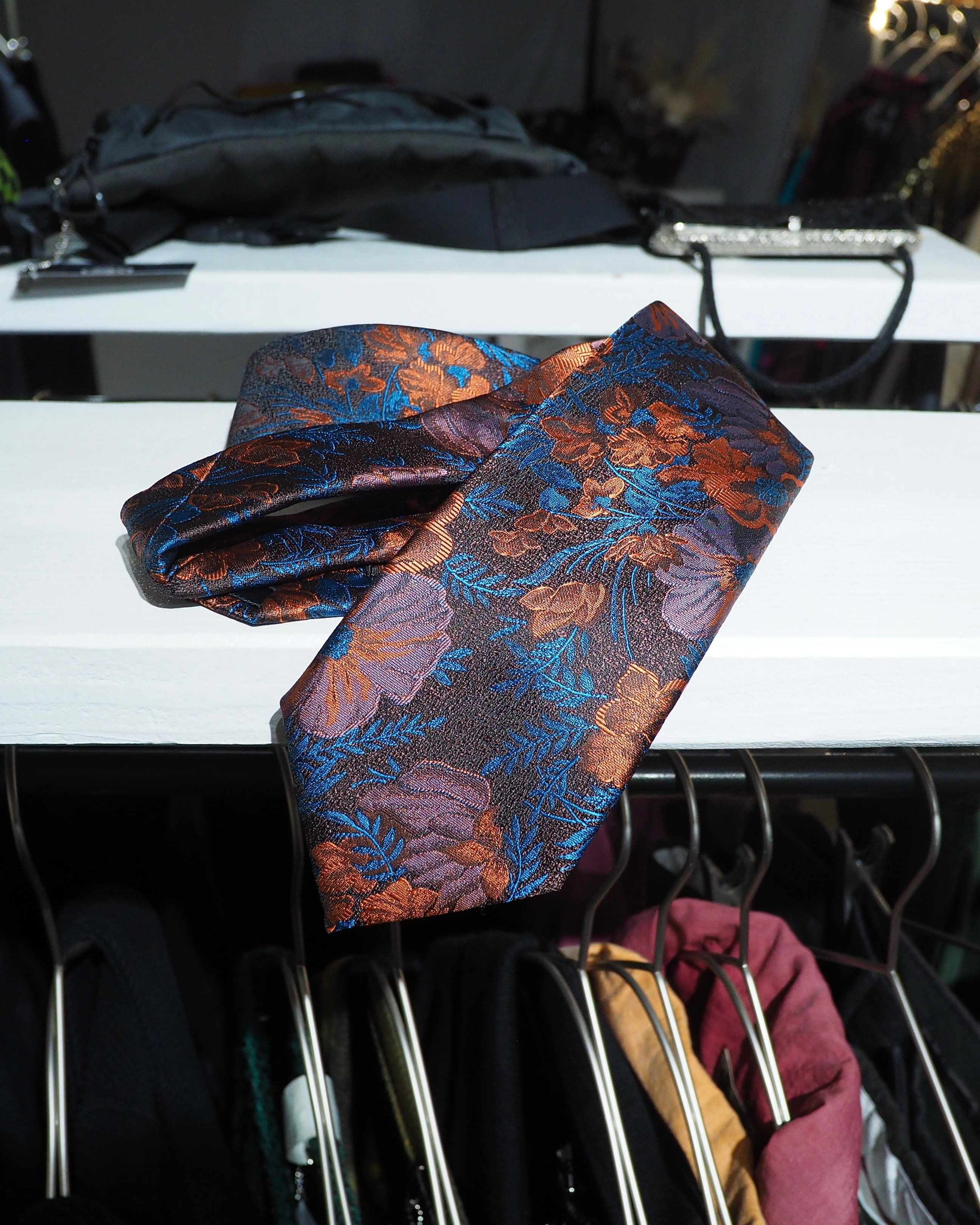 オレンジ、パープル、ライトブルーのお色で編成された花刺繍がラグジュアリモードなネクタイ。