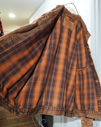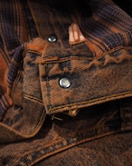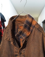 色鮮やかなダークオレンジの色目が美しいデニムジャケット。元々はブラックの個体を染め上げた唯一無二のスペシャルピースになります。裏地の同色オンブレチェックも雰囲気が良いですね。