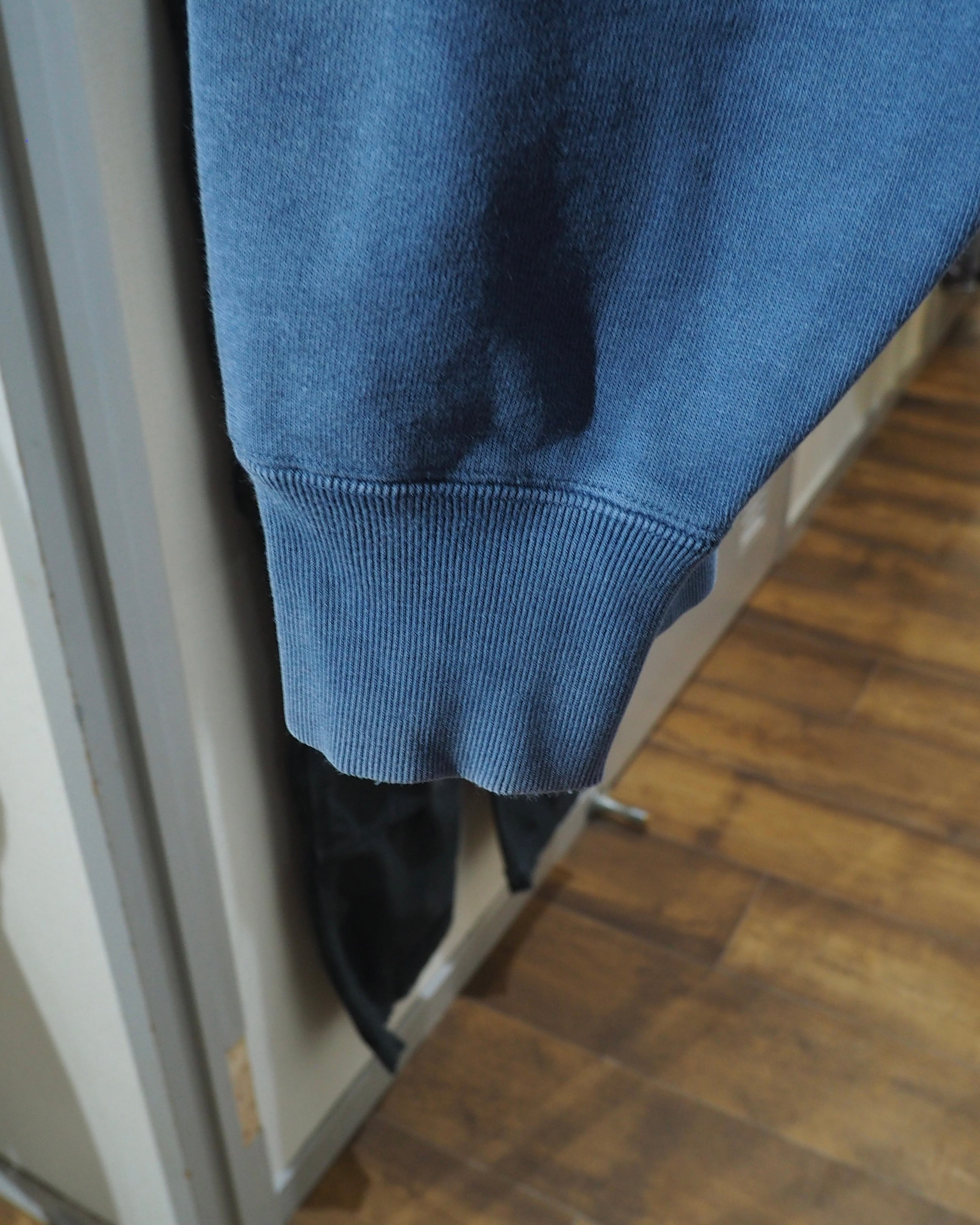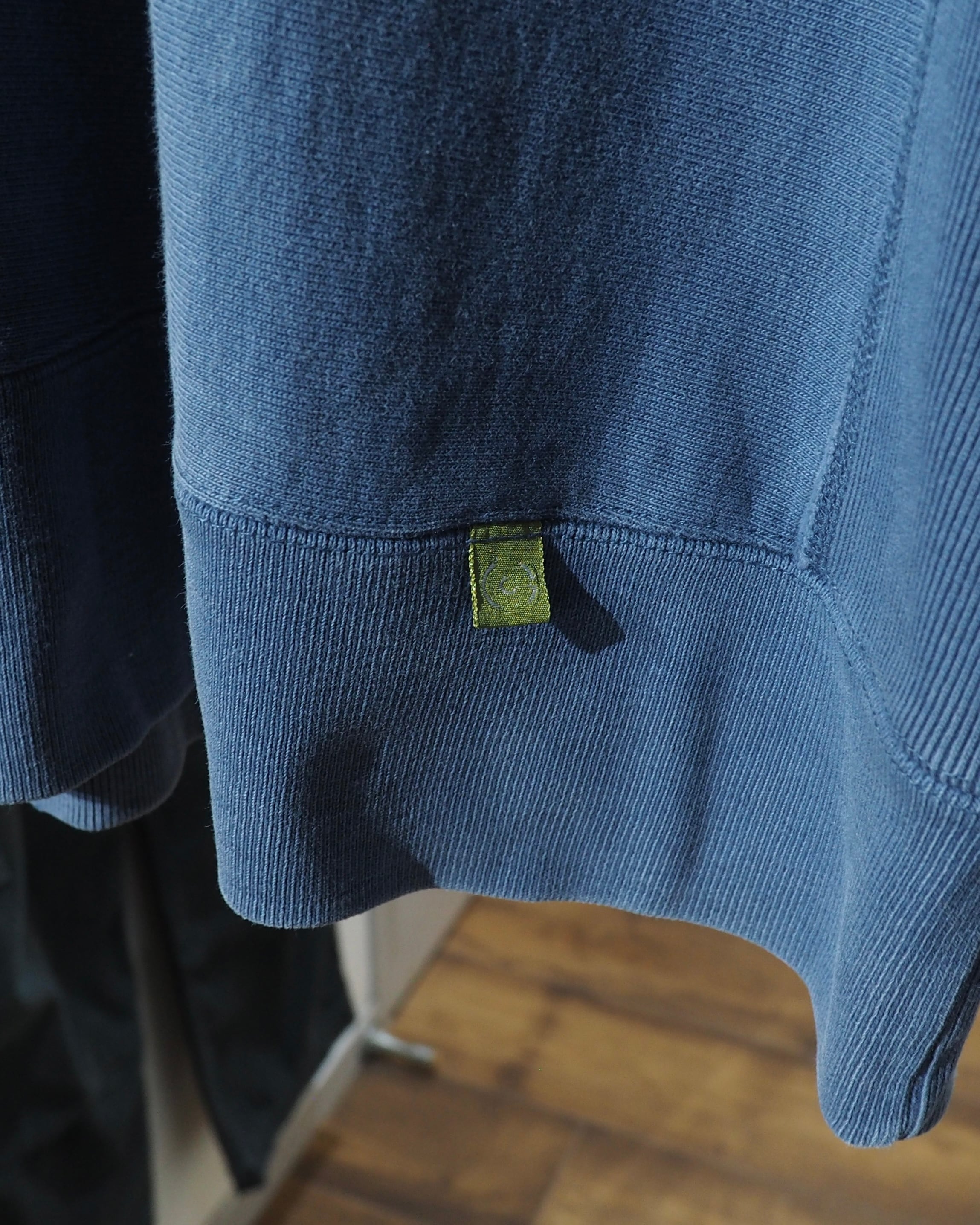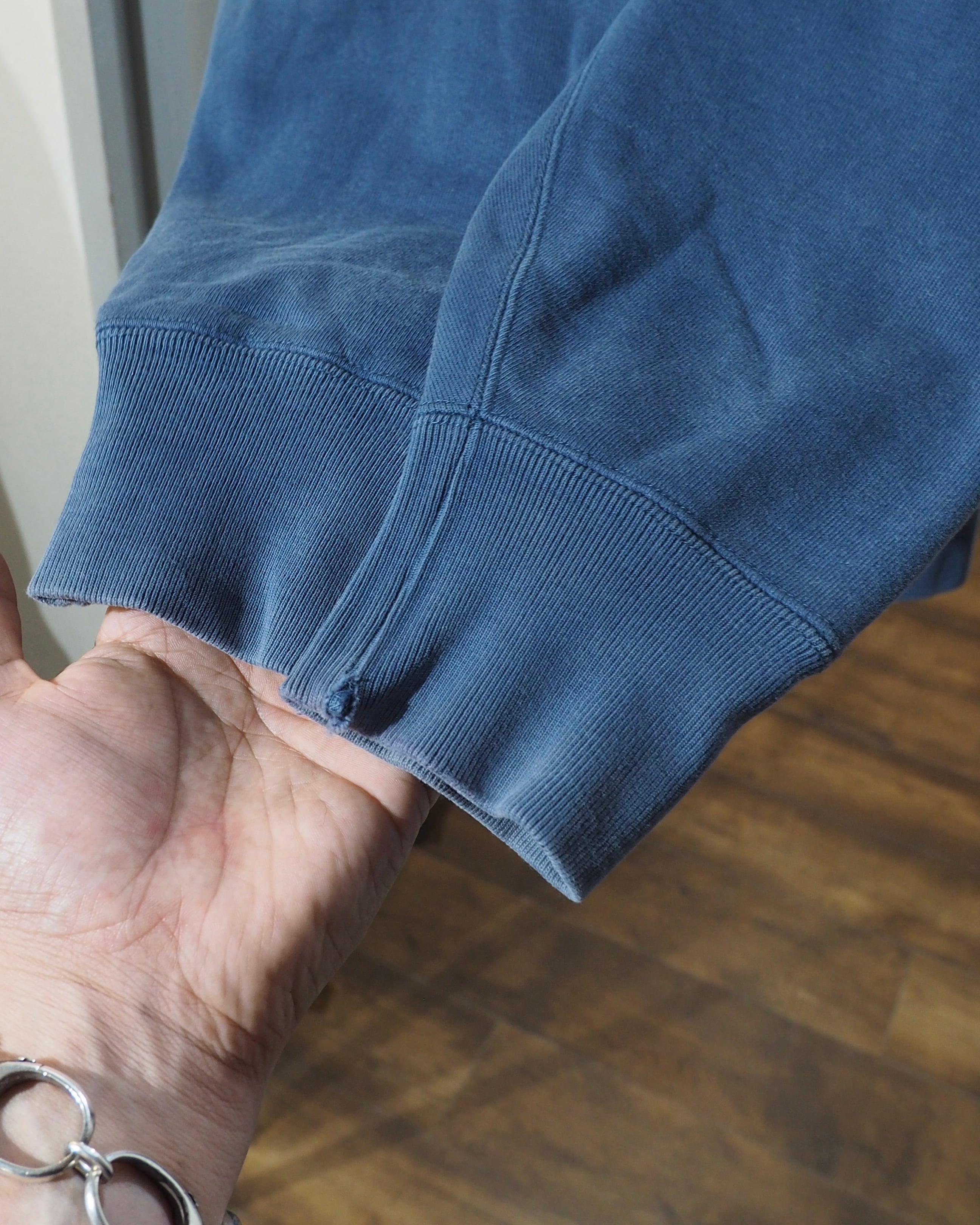 ブルーグリーン - ティール系の発色だったコットンボディが経年変化によりフェードに色落ちし、ややグレイッシュにトーンダウンした絶妙な色味へと昇華。いわゆる“褪せた青緑”のニュアンスカラーで、ヴィンテージライクな空気感が漂う一着です。