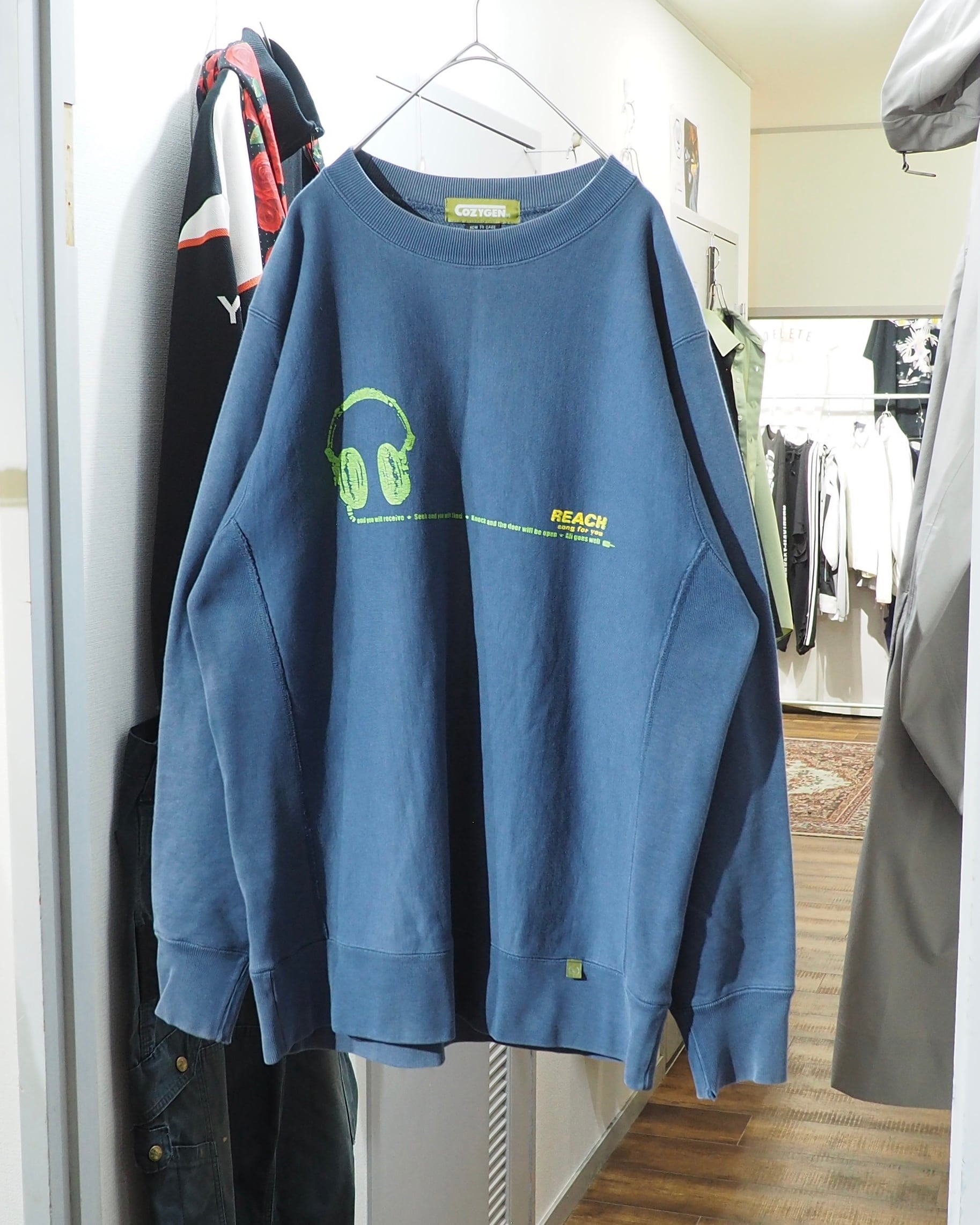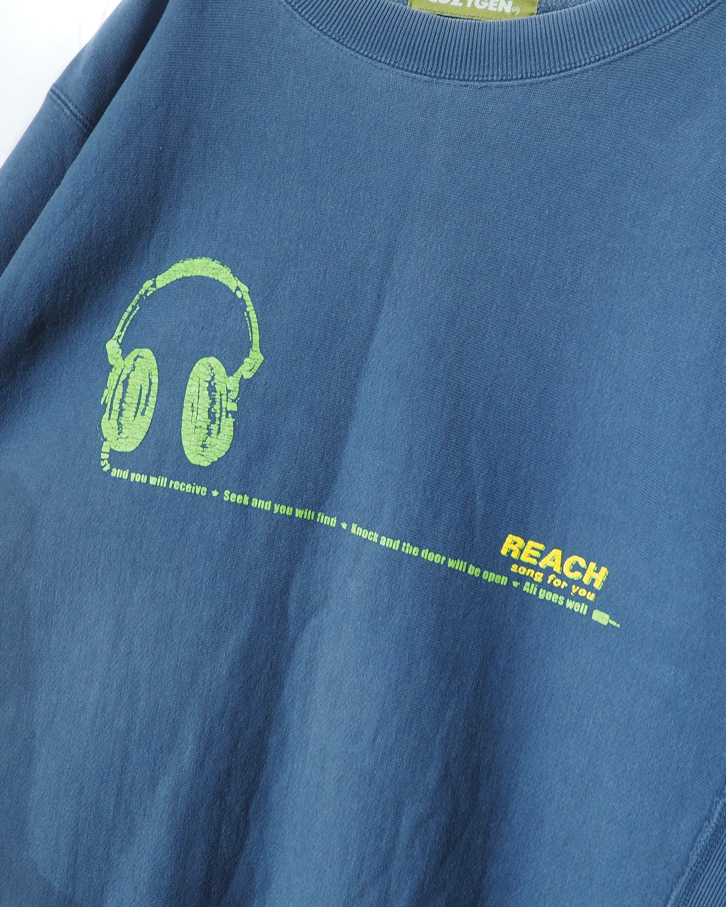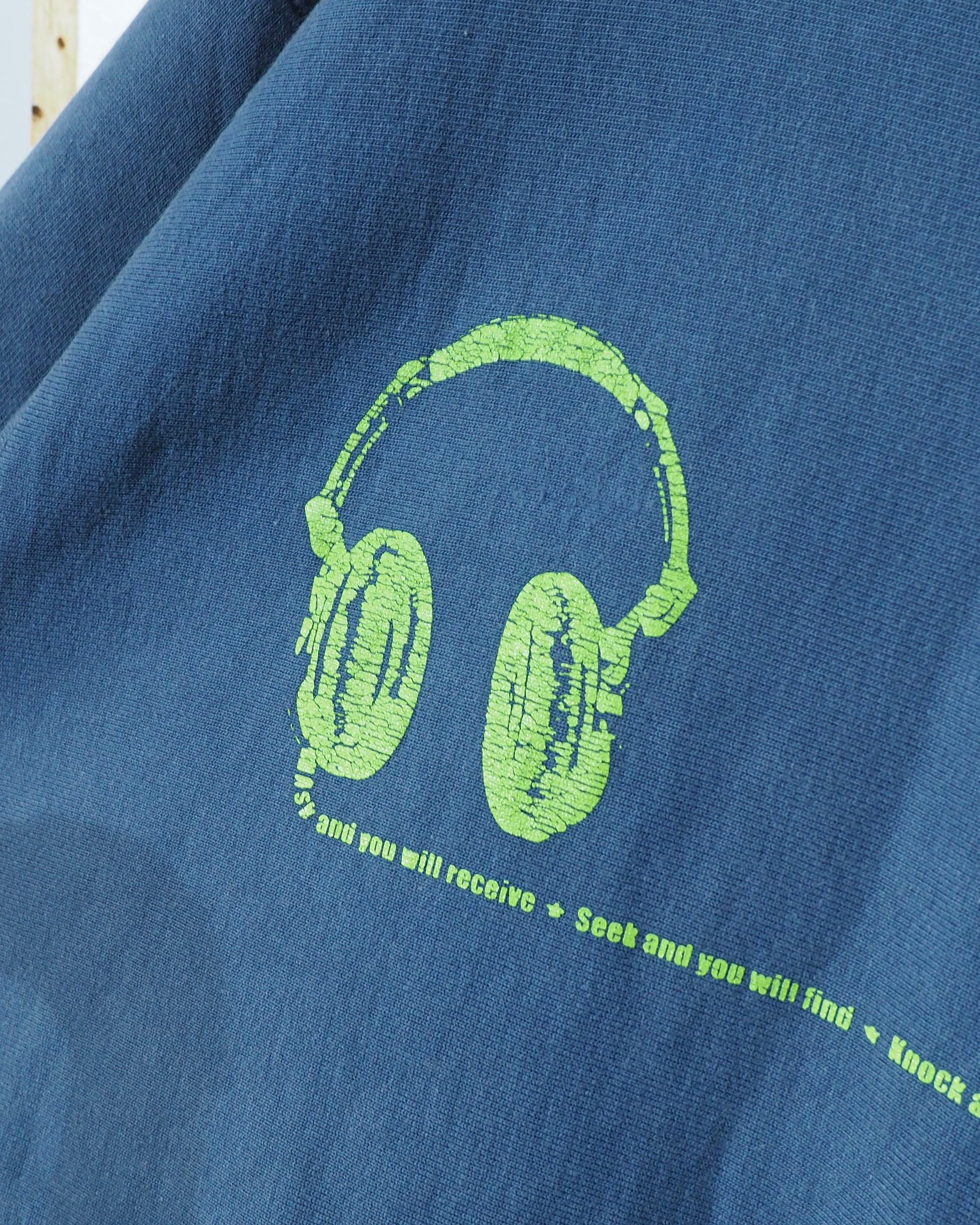 フロントにはヘッドホンモチーフのグラフィックとテキストプリント。やや退色したボディに対して、グリーン×イエローのプリントが程よいコントラストとなっています。