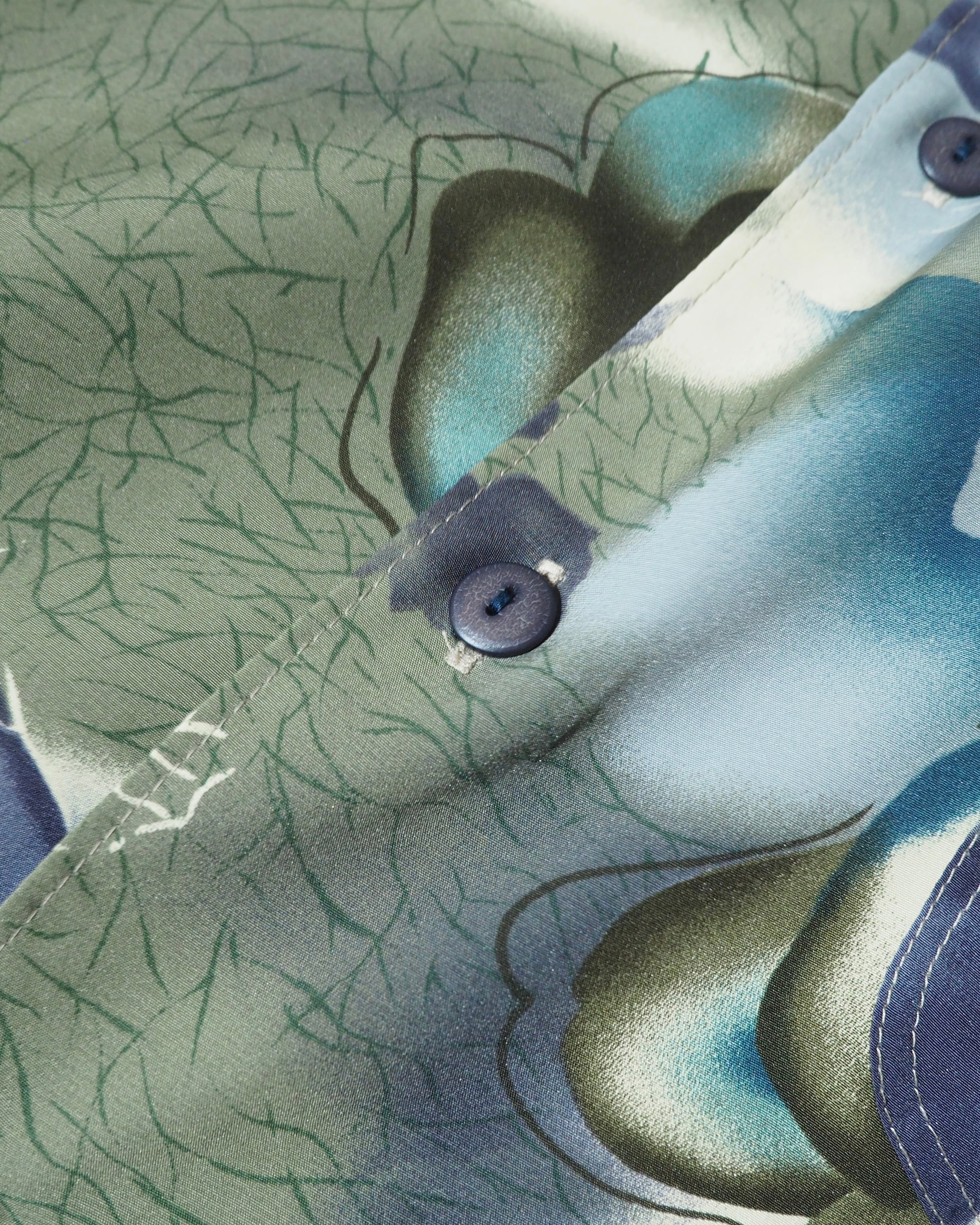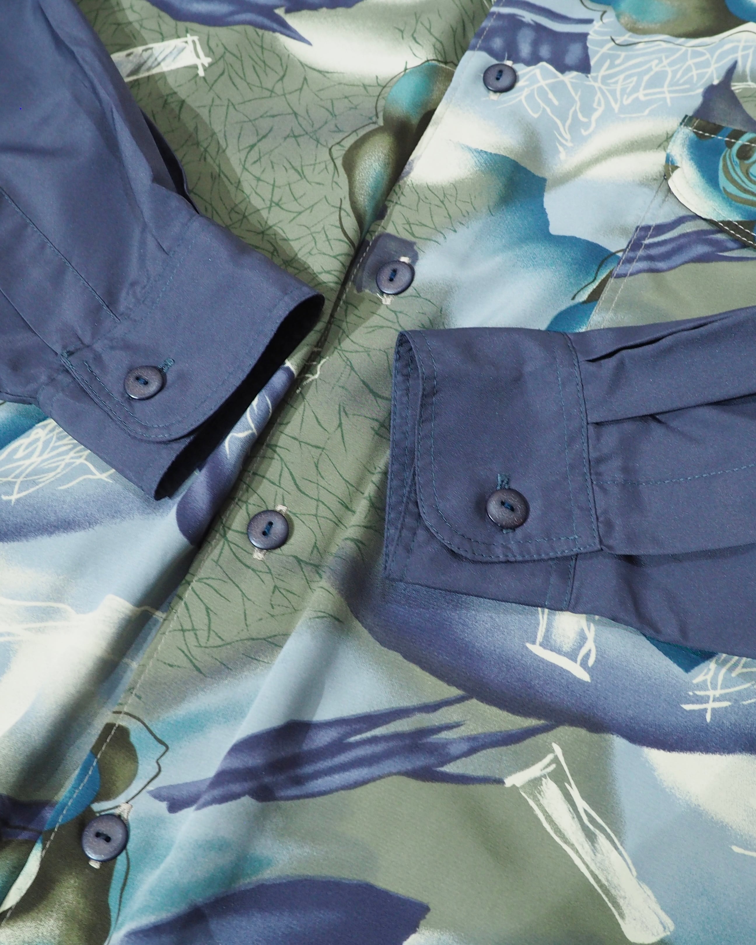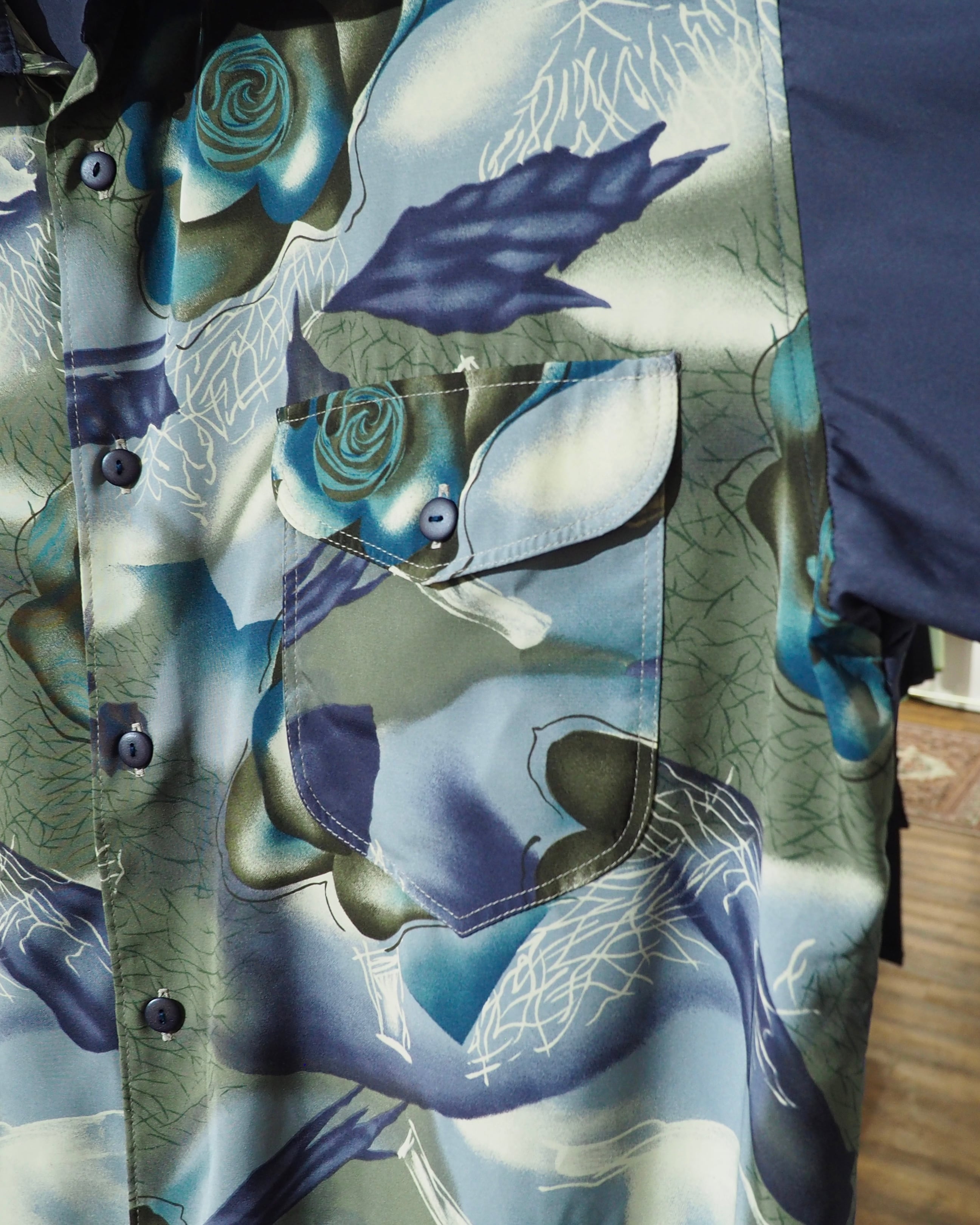 胸元にはフラップ付きポケットを配置し、ボタンもボディと色を統一することでミニマルに。柄の美しさを引き立てる、計算されたディテールワークが良い。