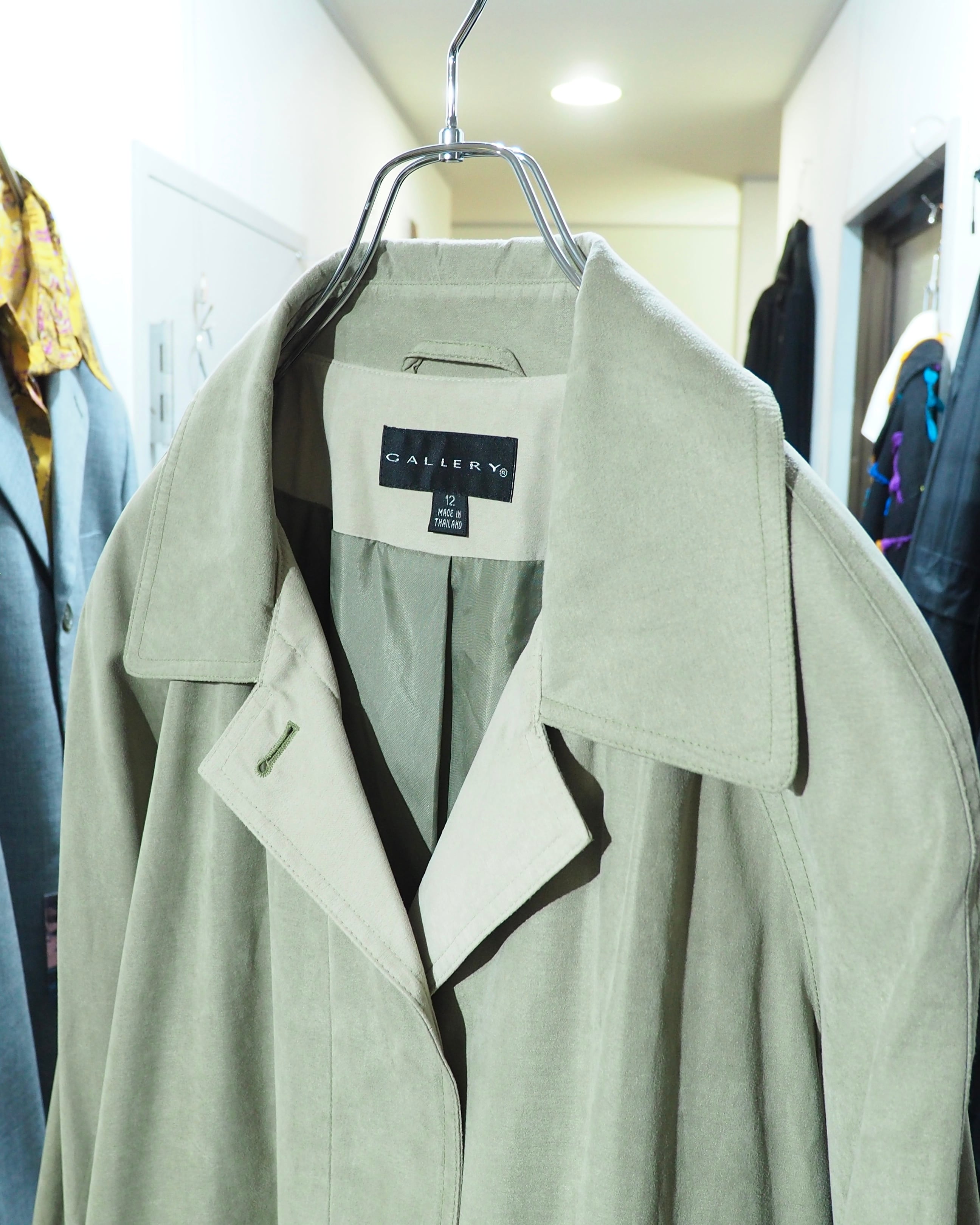 淡く、やわらかなピスタチオグリーンに、滑らかな肌触りのスエードが今袖を通したいロングコート。