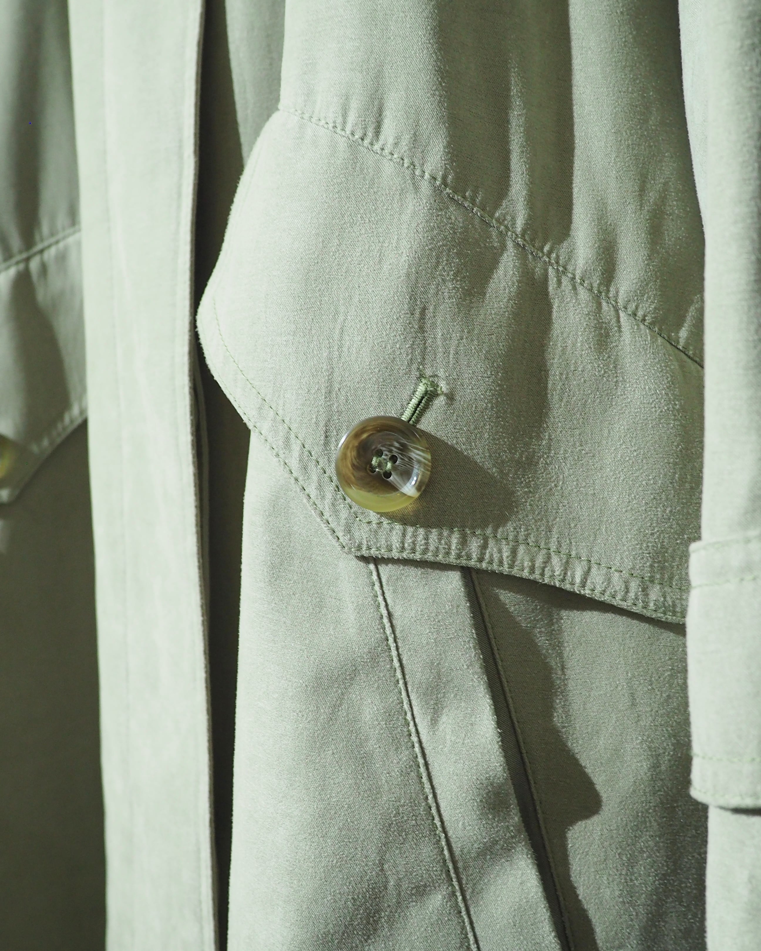 フロントはミニマルな比翼仕立て。表に主張しないディテールの中で、とろみのあるボタンの柔らかな存在感がさりげないアクセントに。