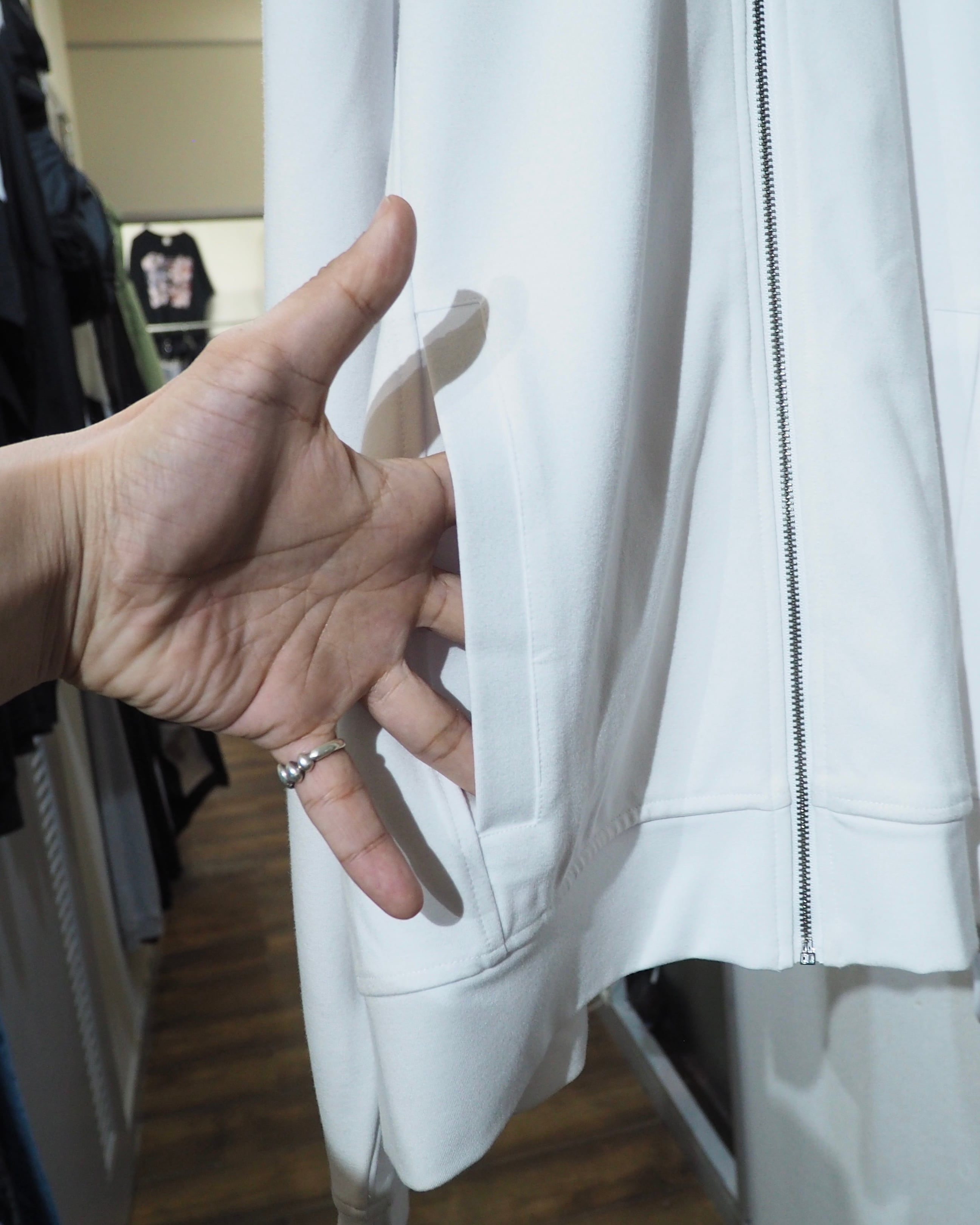 お色は、まっさらなオールホワイト。余計な装飾を削ぎ落としたミニマルな佇まいの中に、フロントのメタリックジップがさりげないアクセントとして光ります。