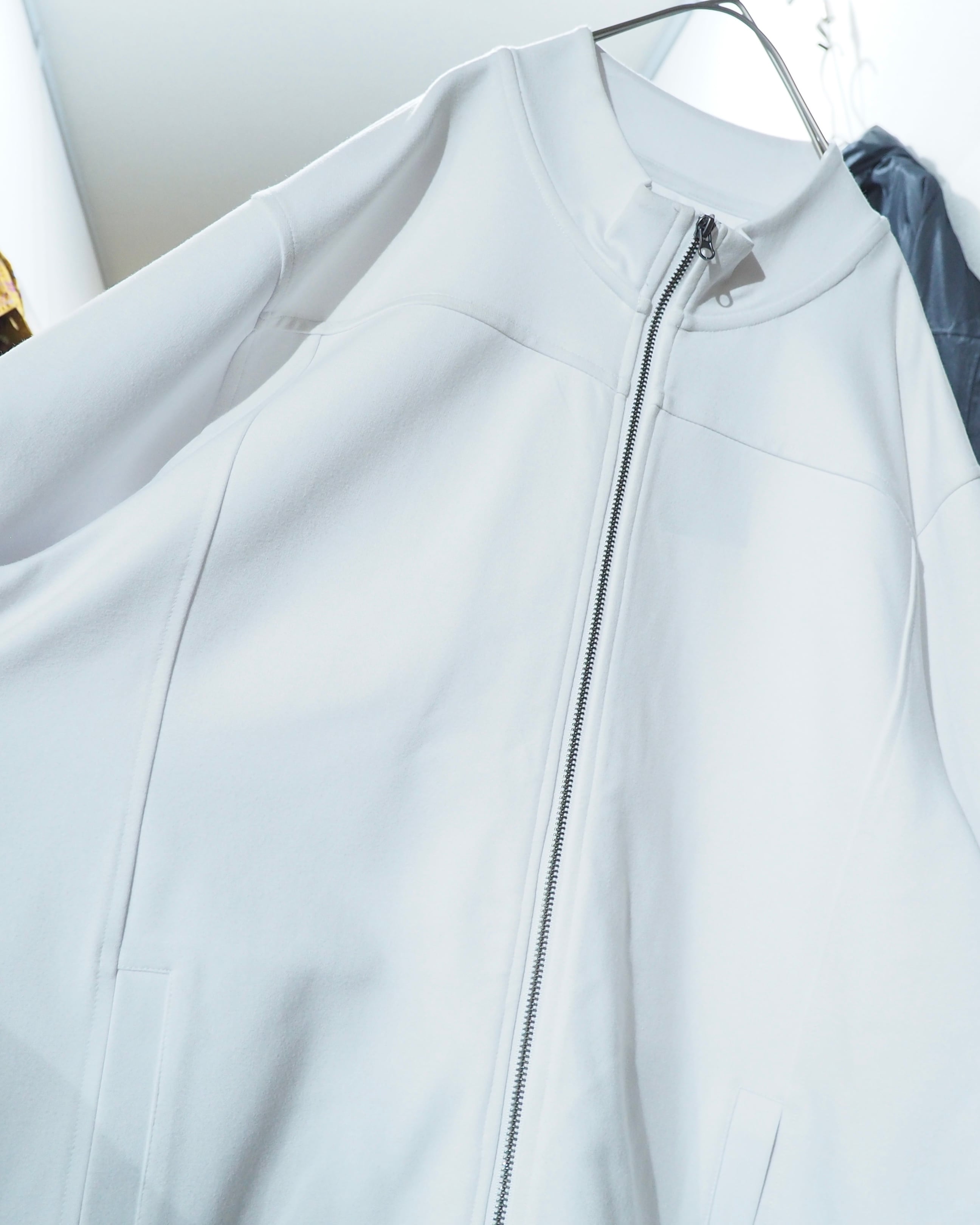 伸びのある、しなやかな伸縮性に光沢感のある、レーヨン×ナイロン×スパンデクスの混紡生地で仕立てられたトラックジャケット。手に取った瞬間に伝わる、滑らかでラグジュアリーな質感が堪りません。
