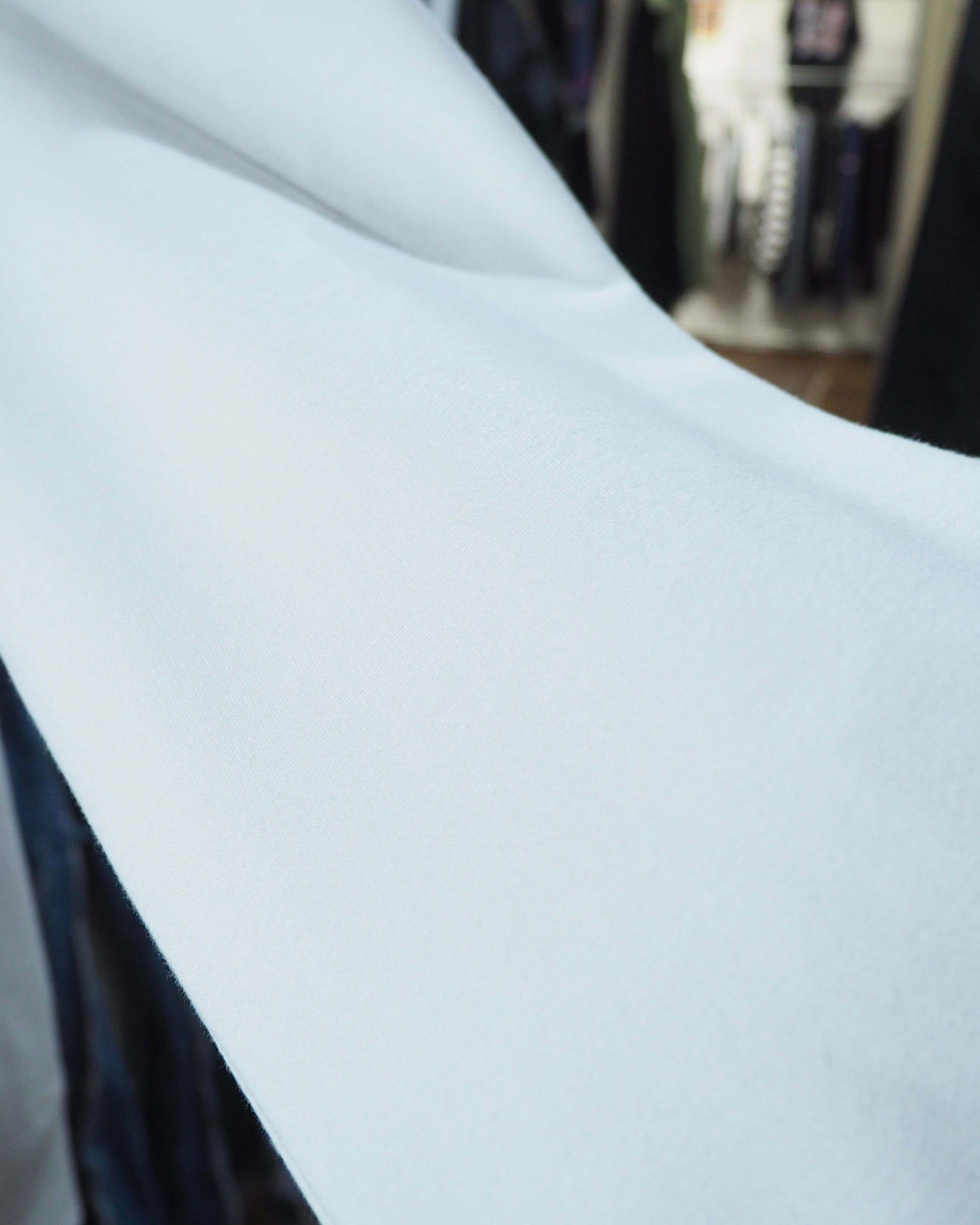 ややゆとりを持たせたシルエットに、この生地特有の落ち感が加わることで、羽織るだけで自然と完成されるバランスに。クリーンでありながらどこかモードな空気を纏う一着です。