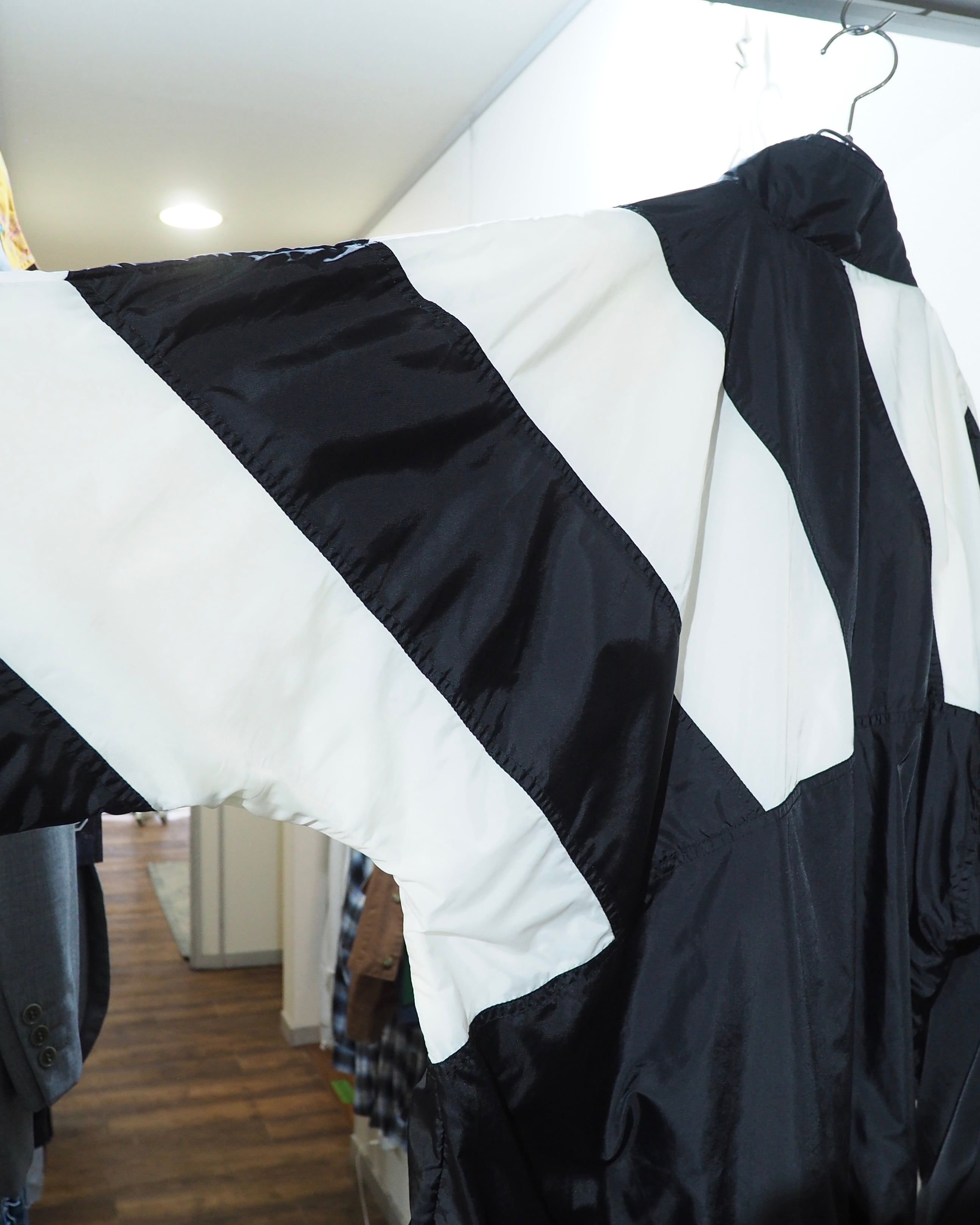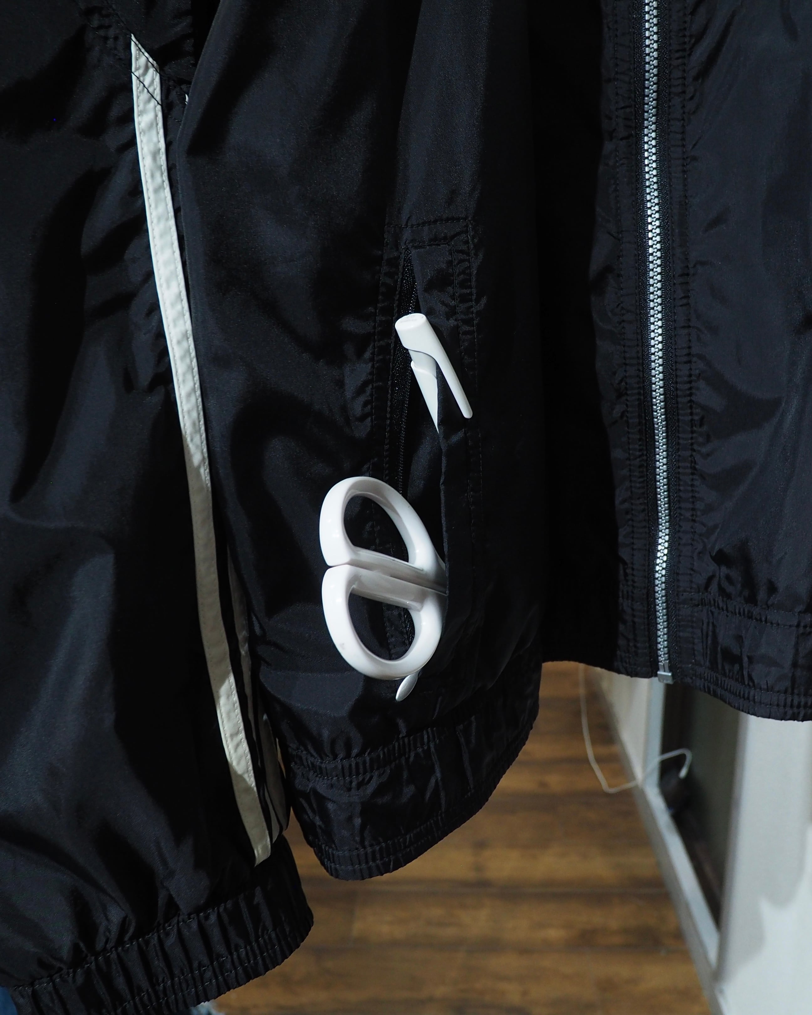 光沢感のあるブラックナイロンに組み合わされたホワイトパネル。袖を拡げると分かるのですが、パフォーマンスロゴを現したデザインとなっています。