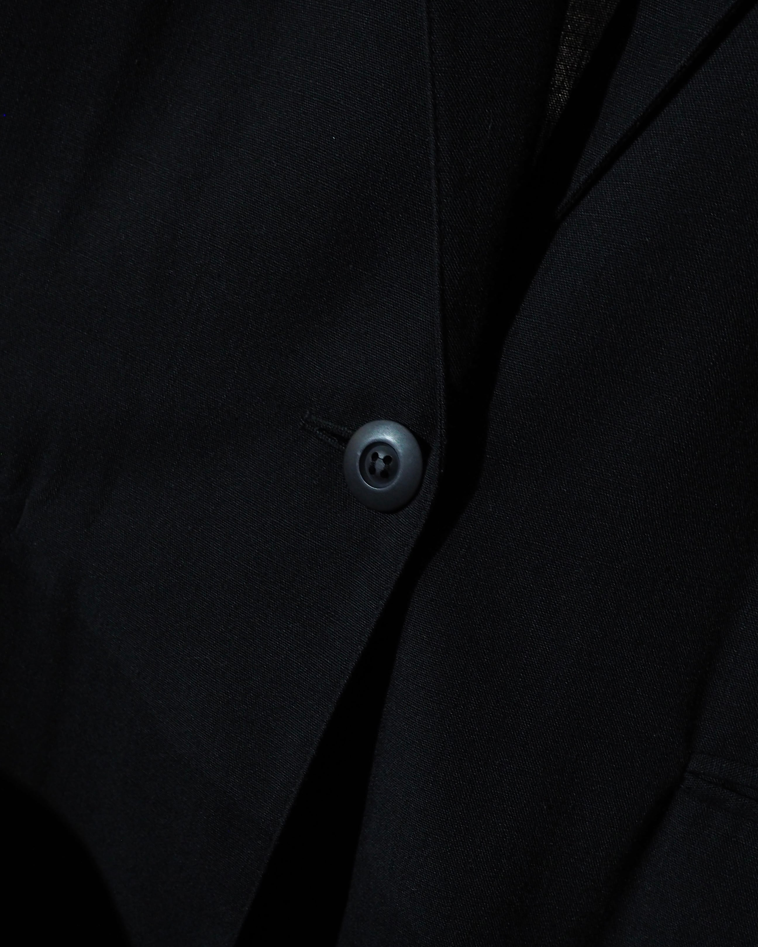 オーバーダイされた様な深く沈み込む単色ブラックのお色が雰囲気のある逸品。フロントを留める釦も同色で統一されており、シンプルなデザインですが洗練されたミニマルな表情をみせてくれます。