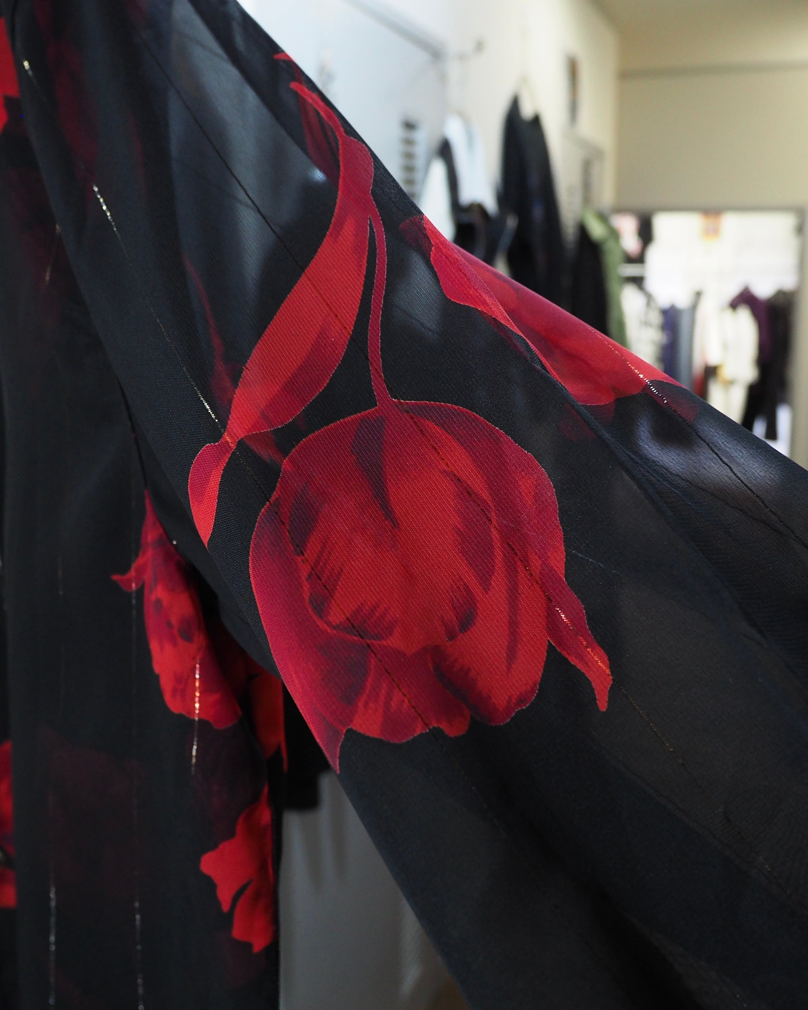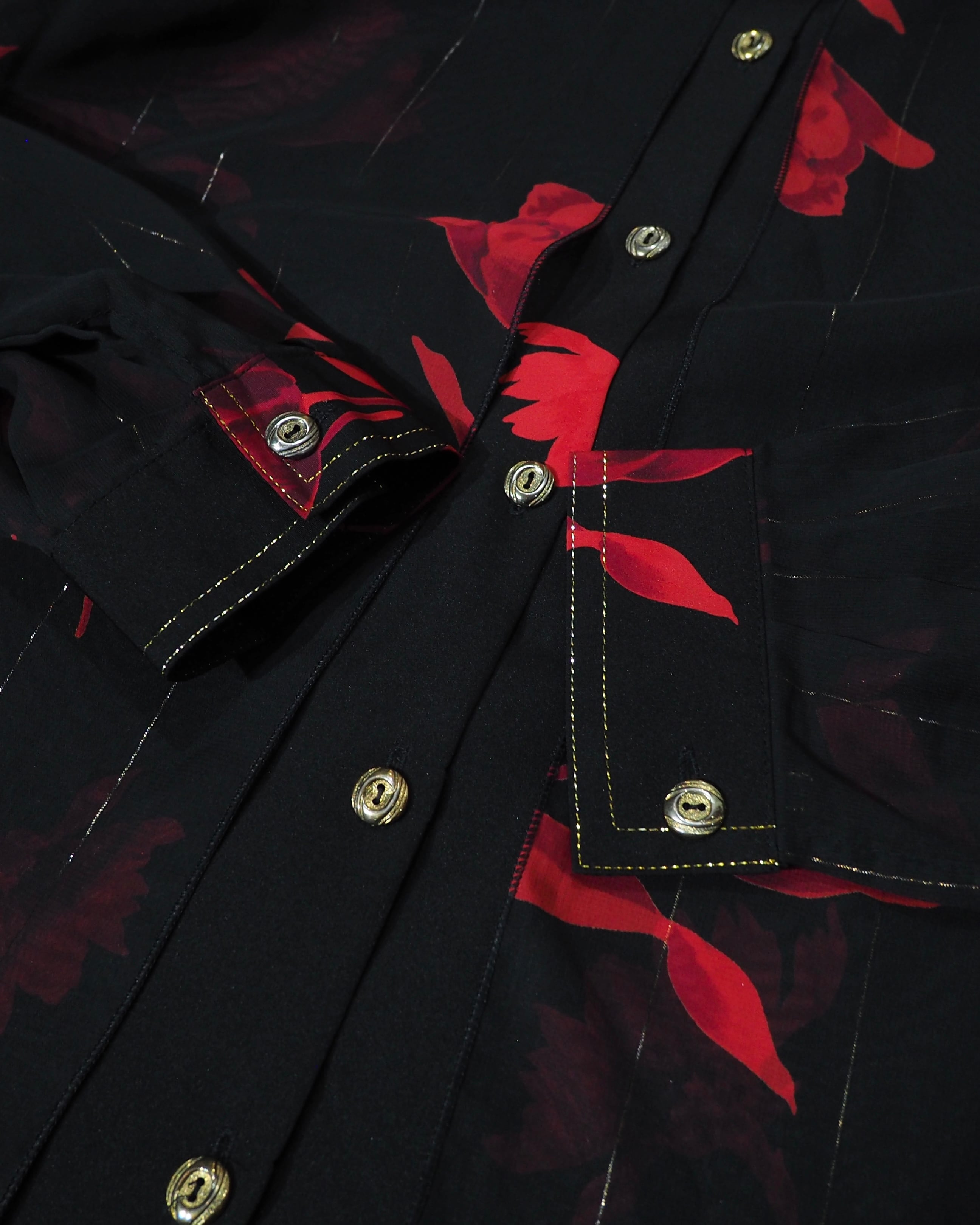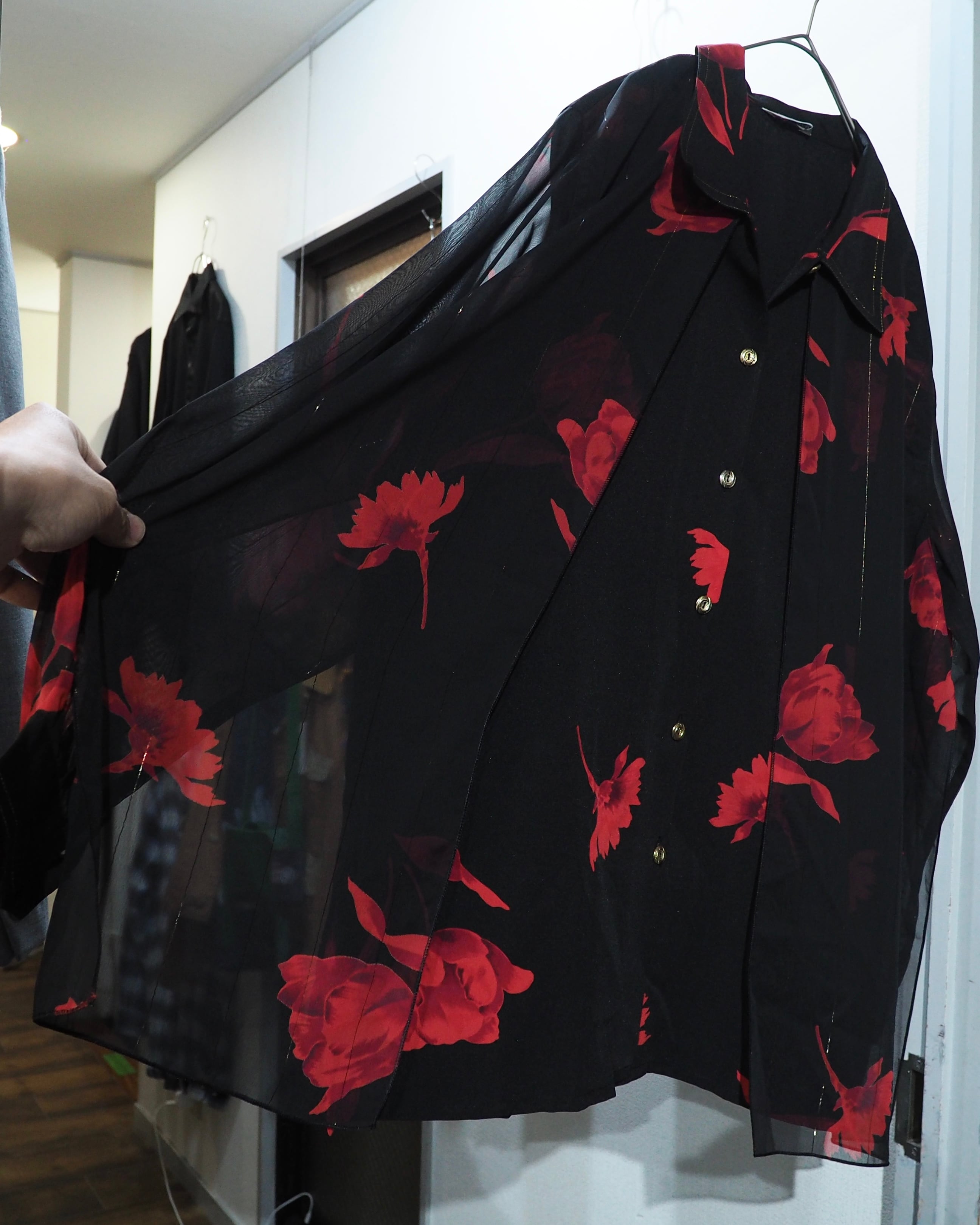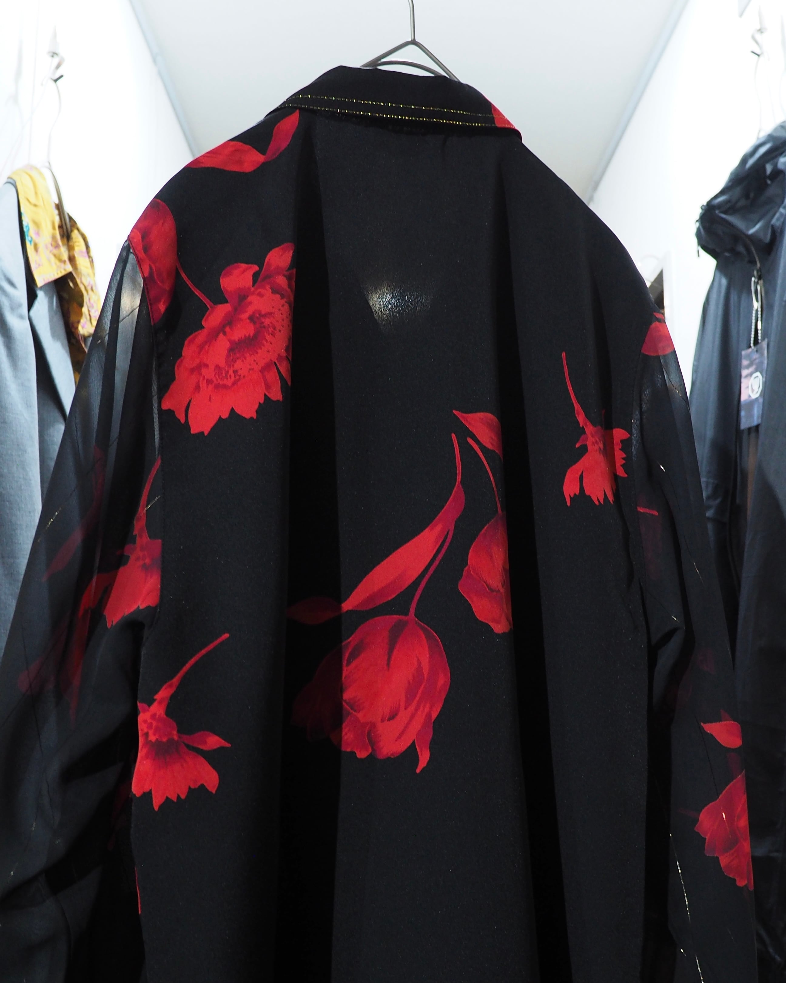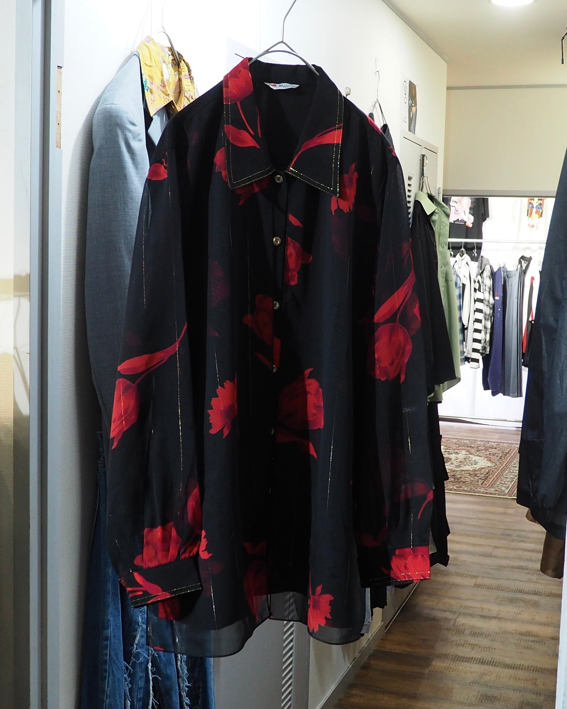 とろみかつドレープ感のあるブラックボディに転写された花々がラグジュアリー×モードなシャツ。