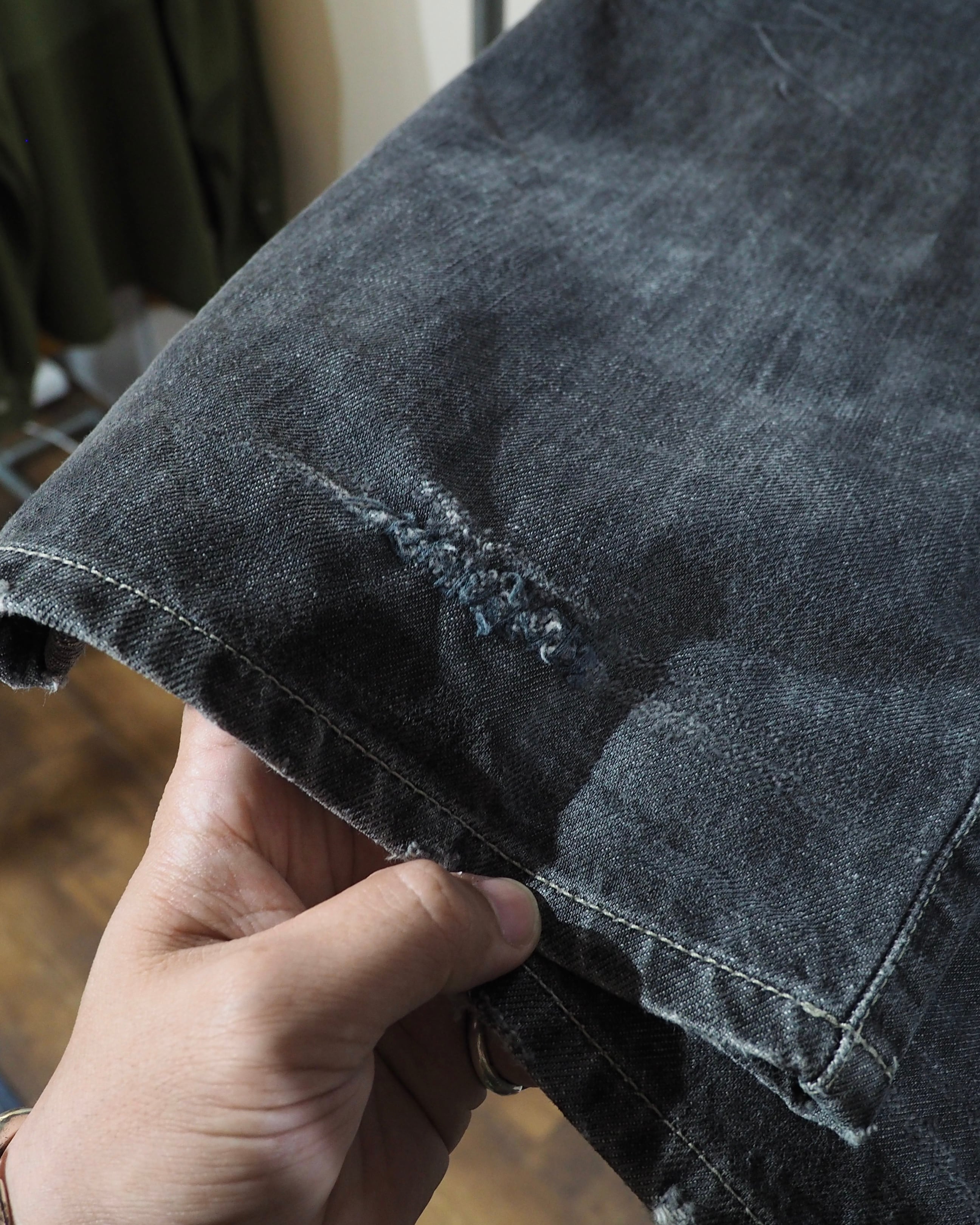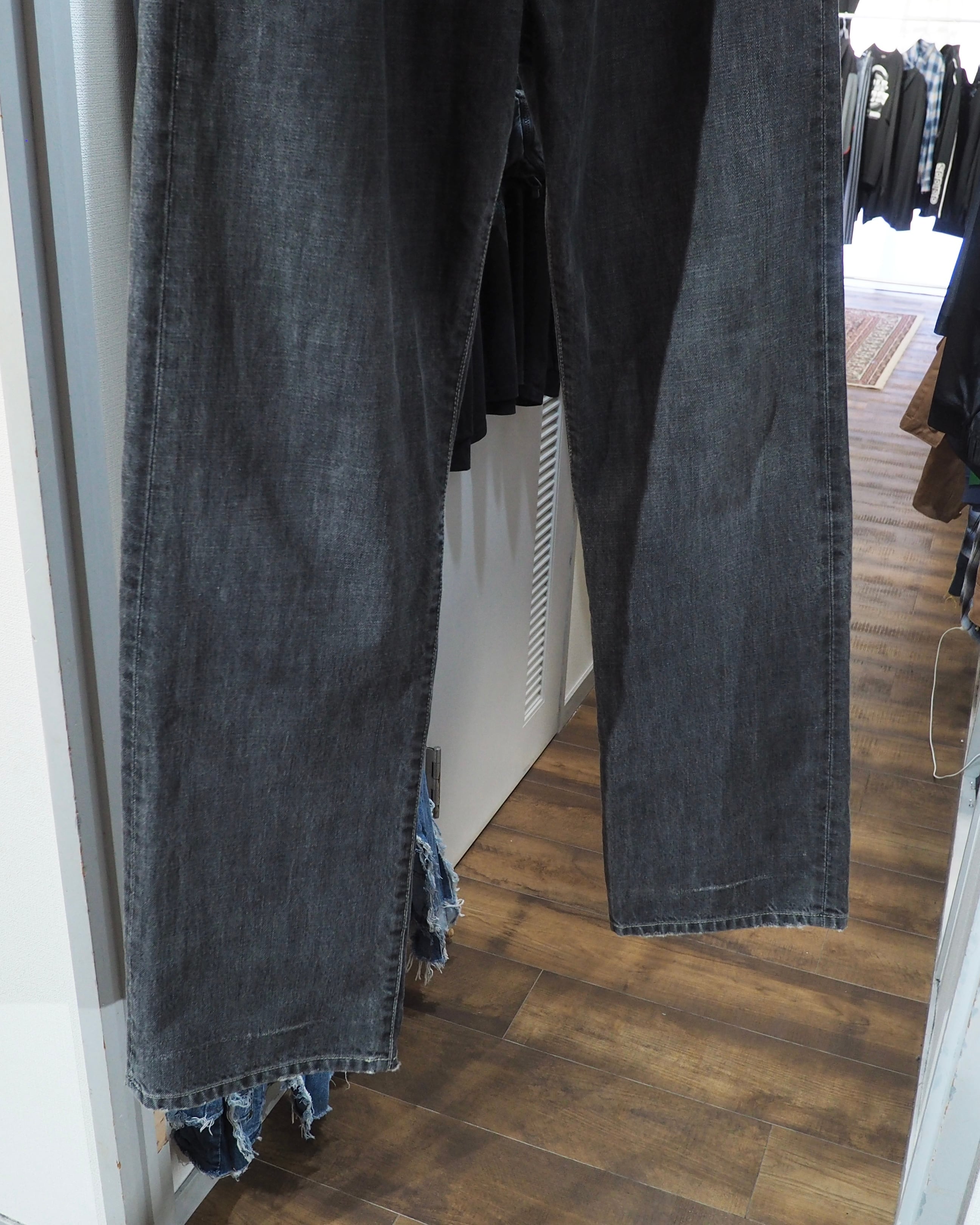 こちらは、経年変化によるトーンダウンされたフェードと、裾やボディの襤褸感が絶妙な美しさ、いなたさを魅せるデニムパンツ。