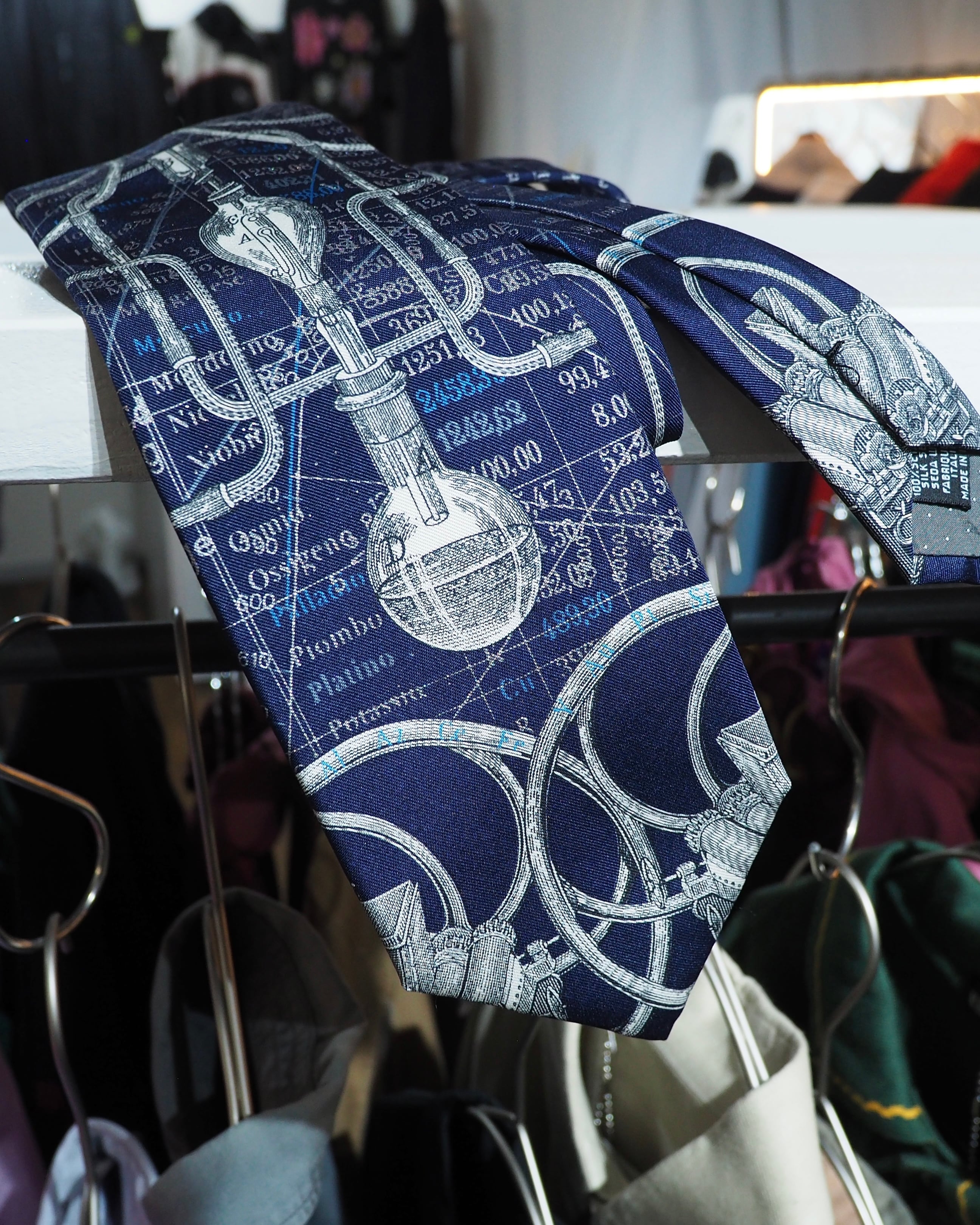 何よりも目を惹くのは、全面に描かれた精緻なグラフィックプリント。数式や設計図を思わせる知的なパターンに、流れるような曲線モチーフが重なり合うことで、フェレらしい“構築美×芸術性”を体現。クラシックなスーツスタイルに差し込めば、一気にモードな空気感へと昇華されます。