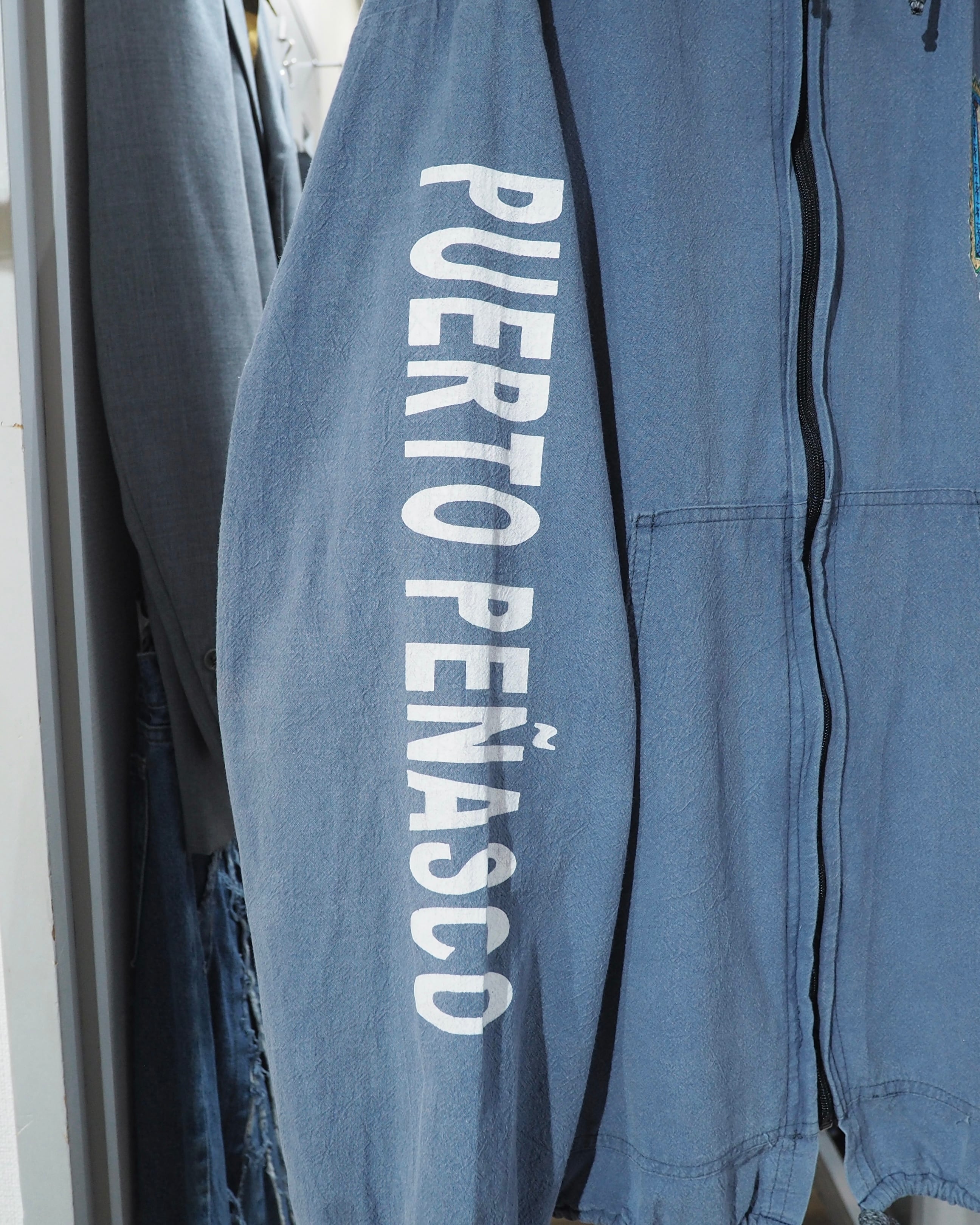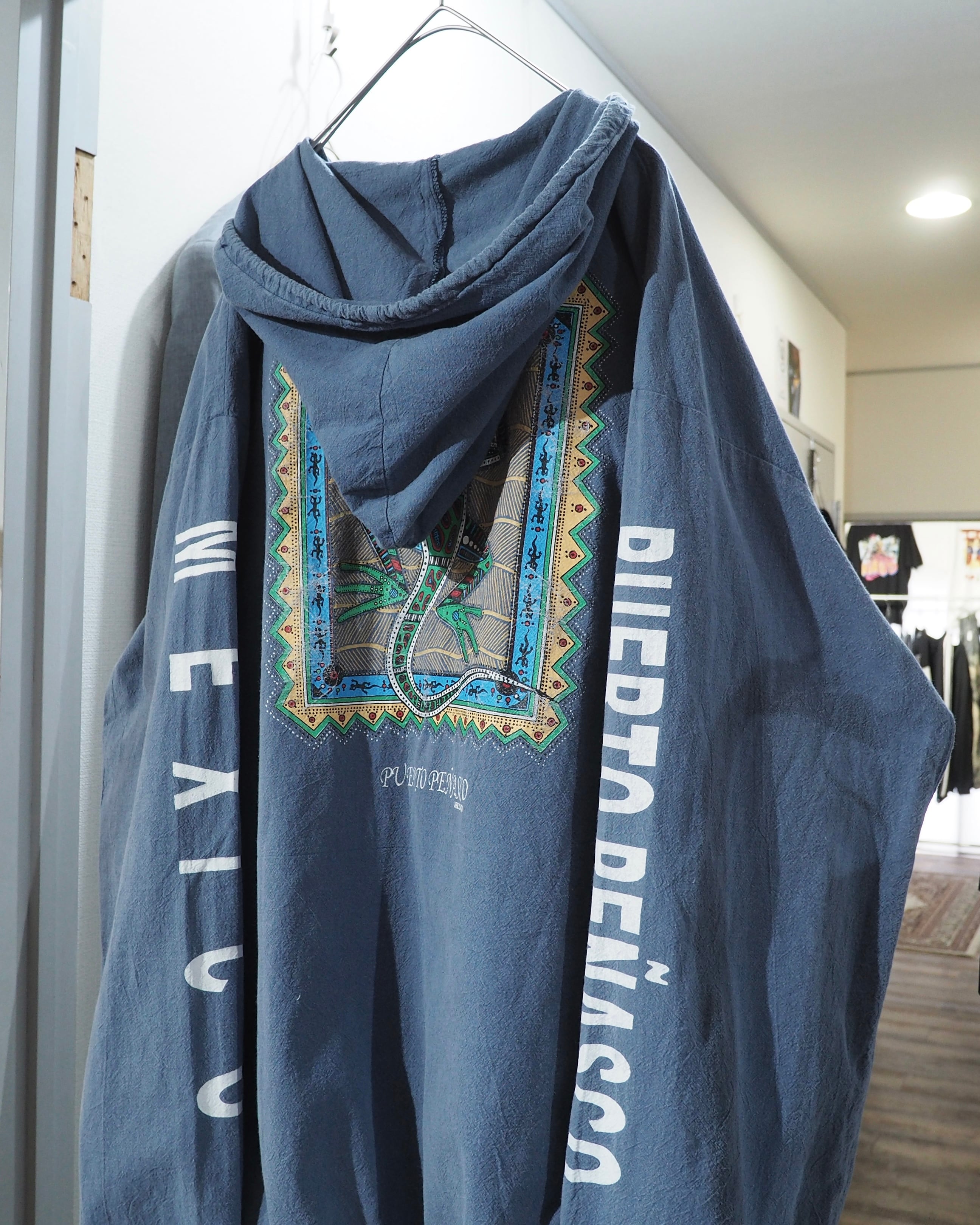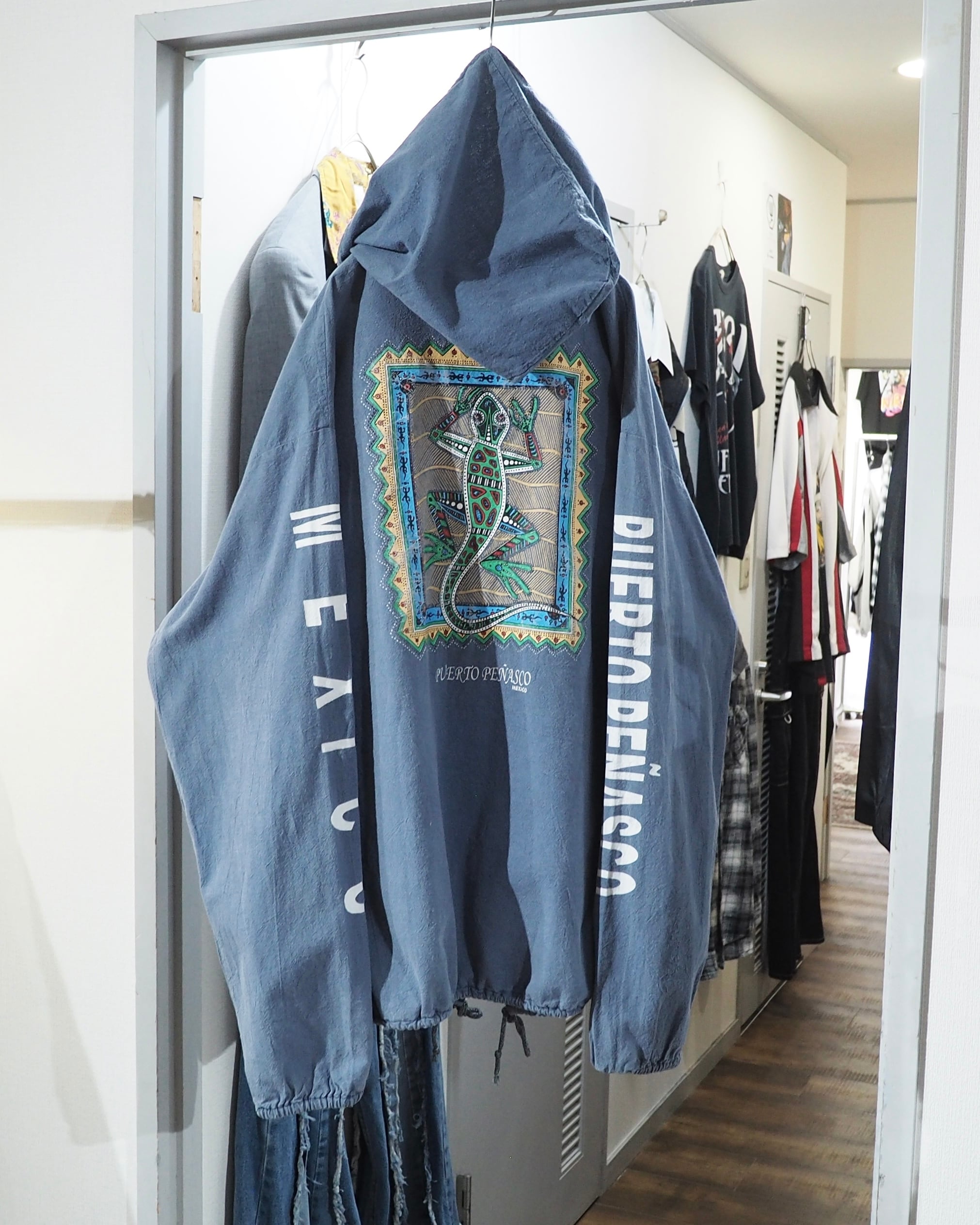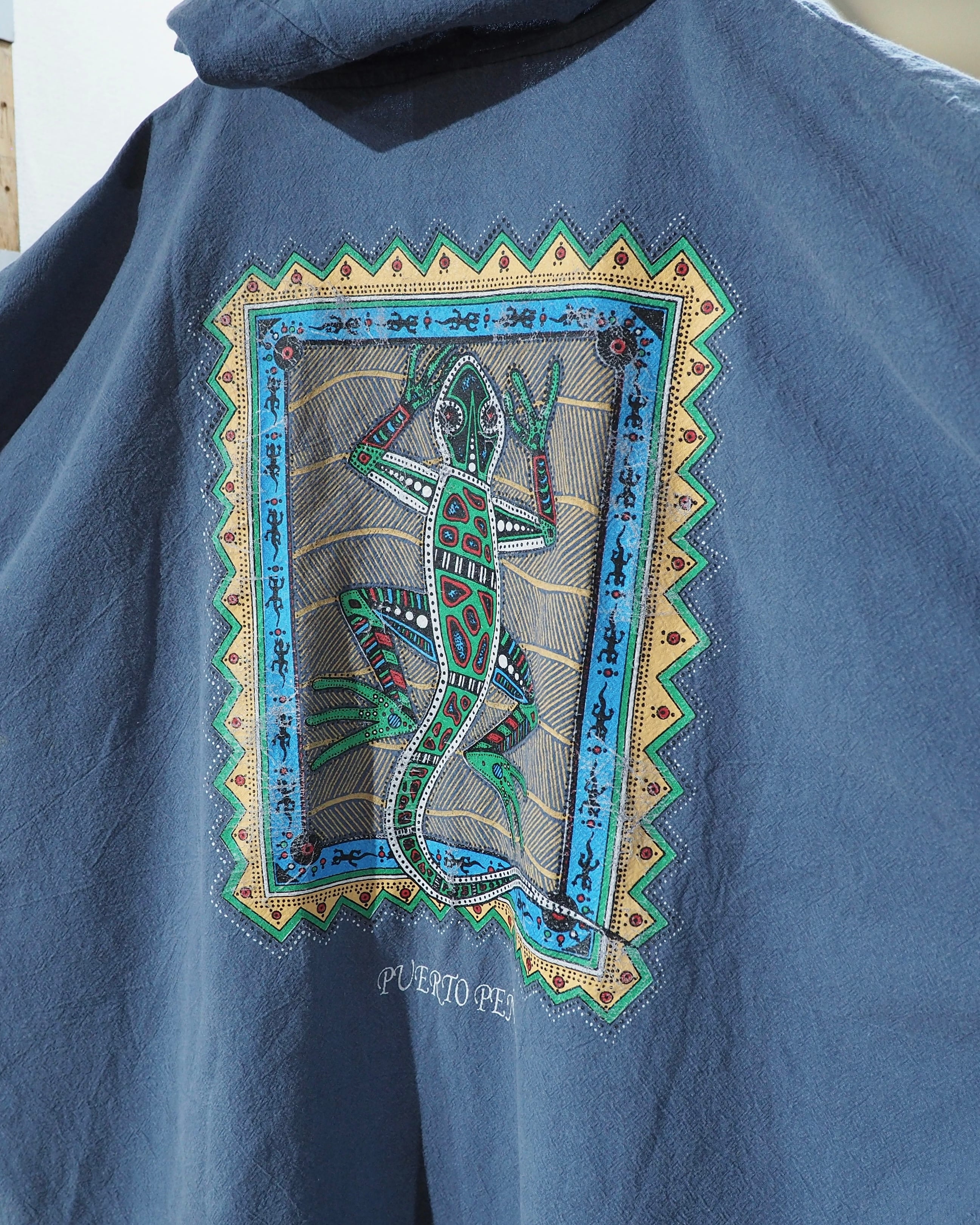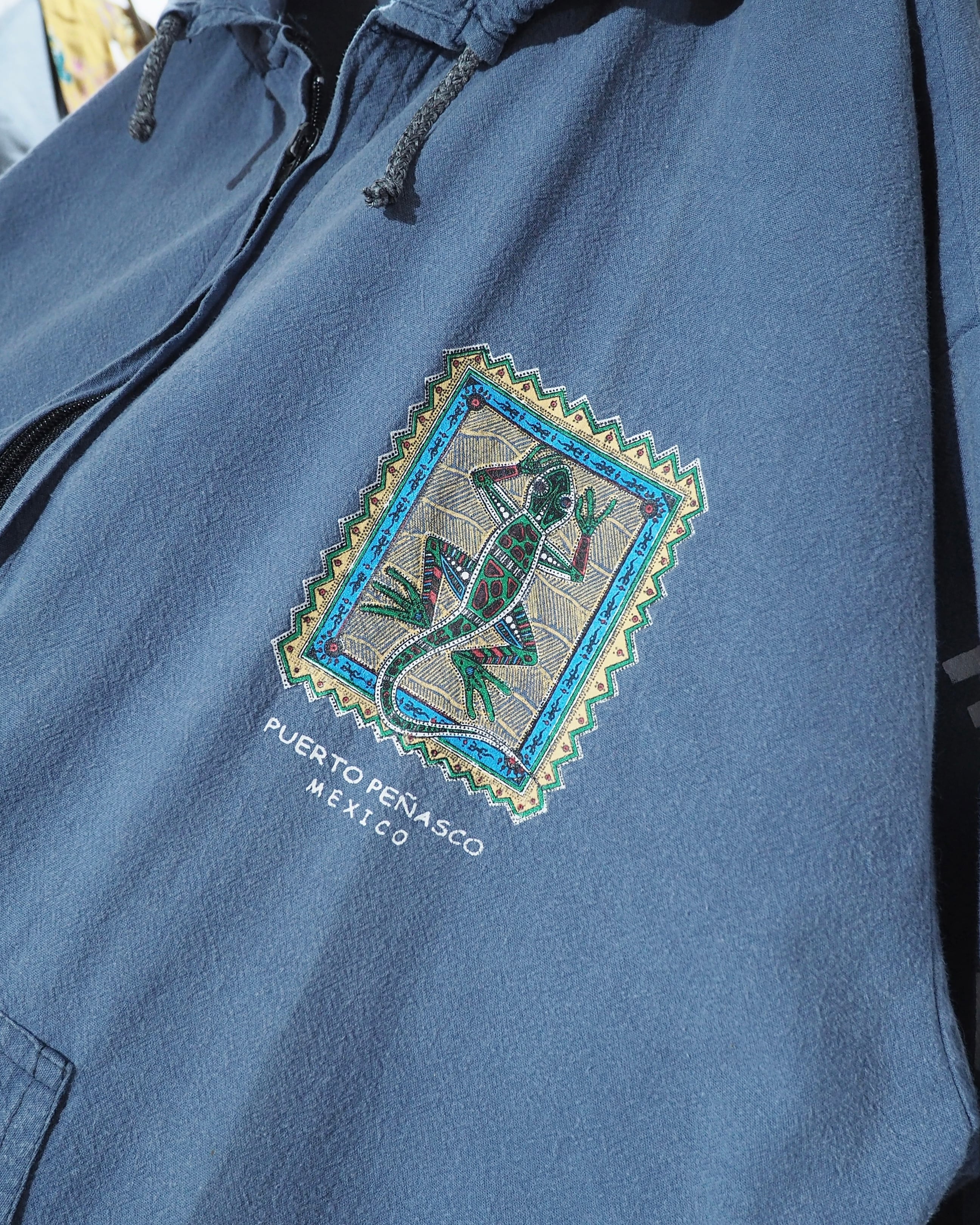 ややくすみがかったスモーキーブルーのお色に、色鮮やかなマルチカラーサラマンダーが目を惹くメキシカンパーカー。額縁に収まりきらないハイセンスなデザインが良いですね。