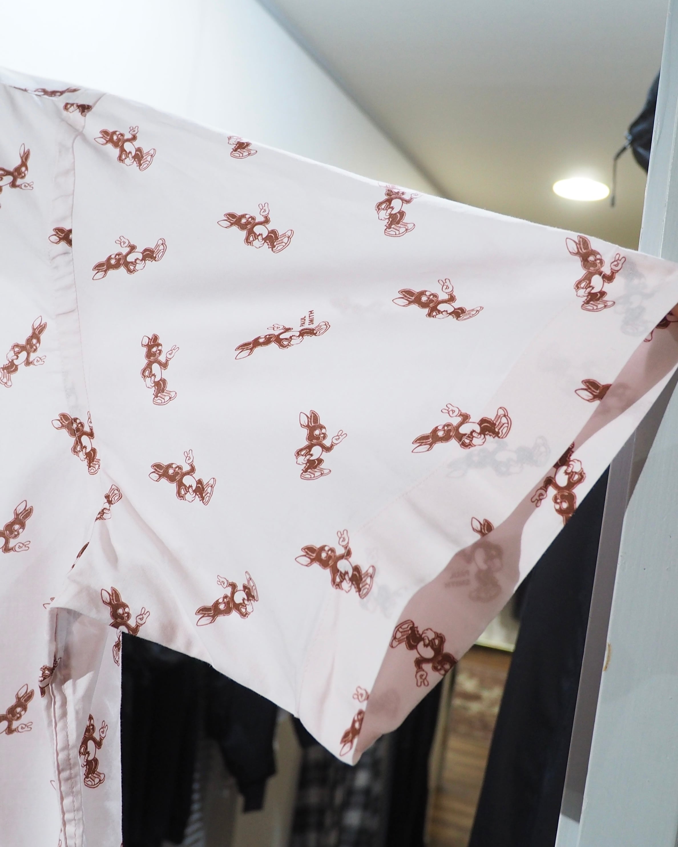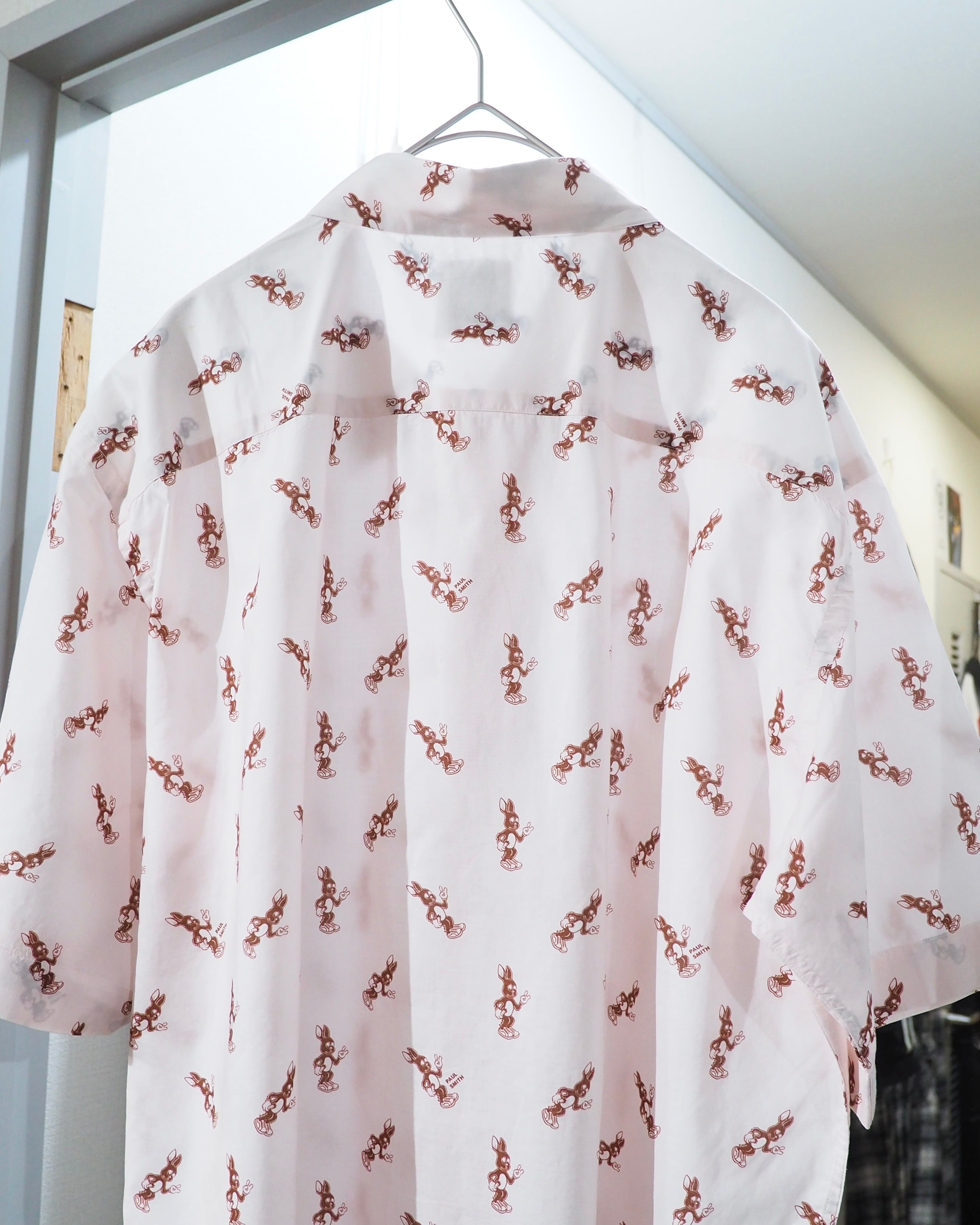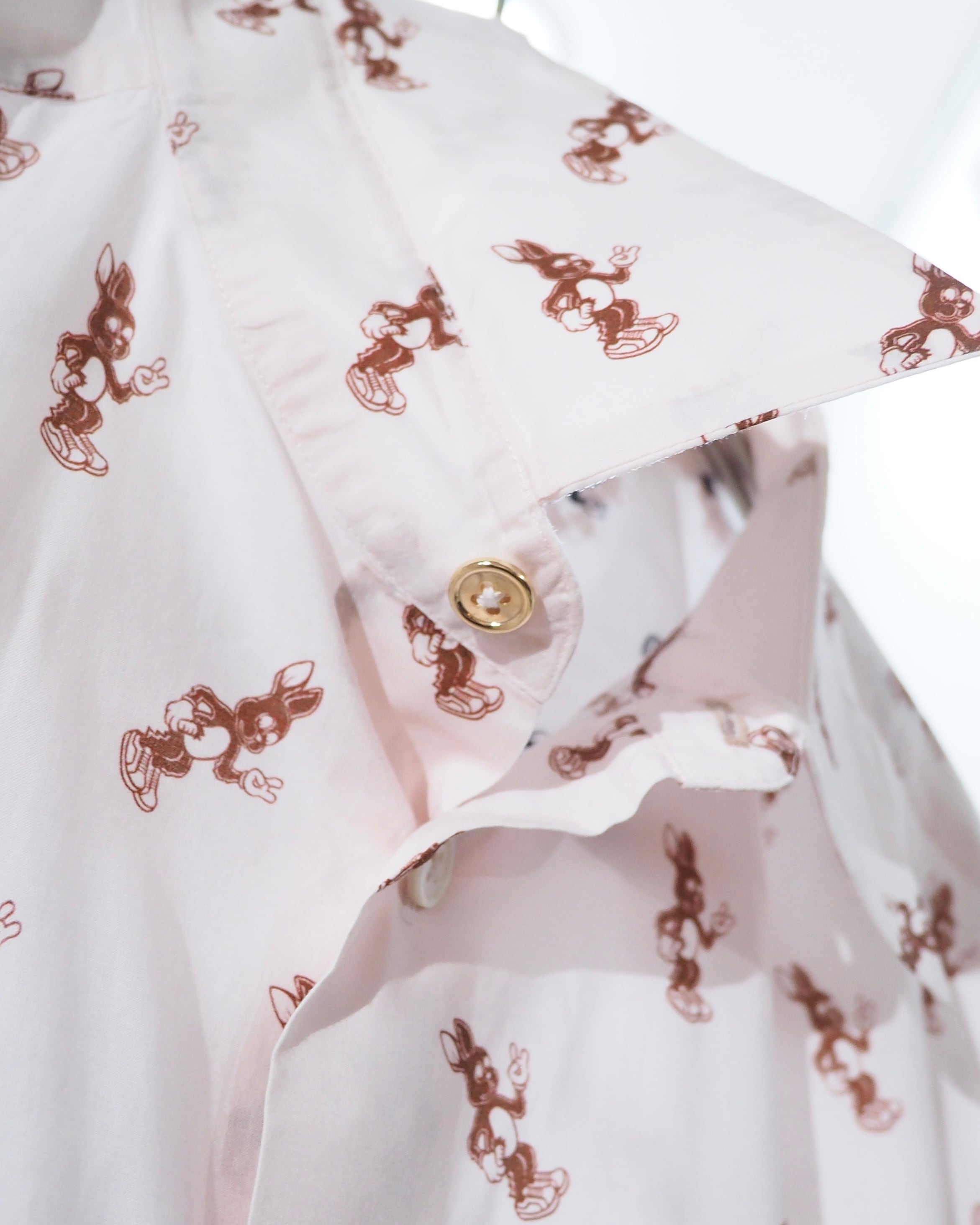 淡いペールピンクのコットンボディに転写されたラビットが可愛らしいシャツ。