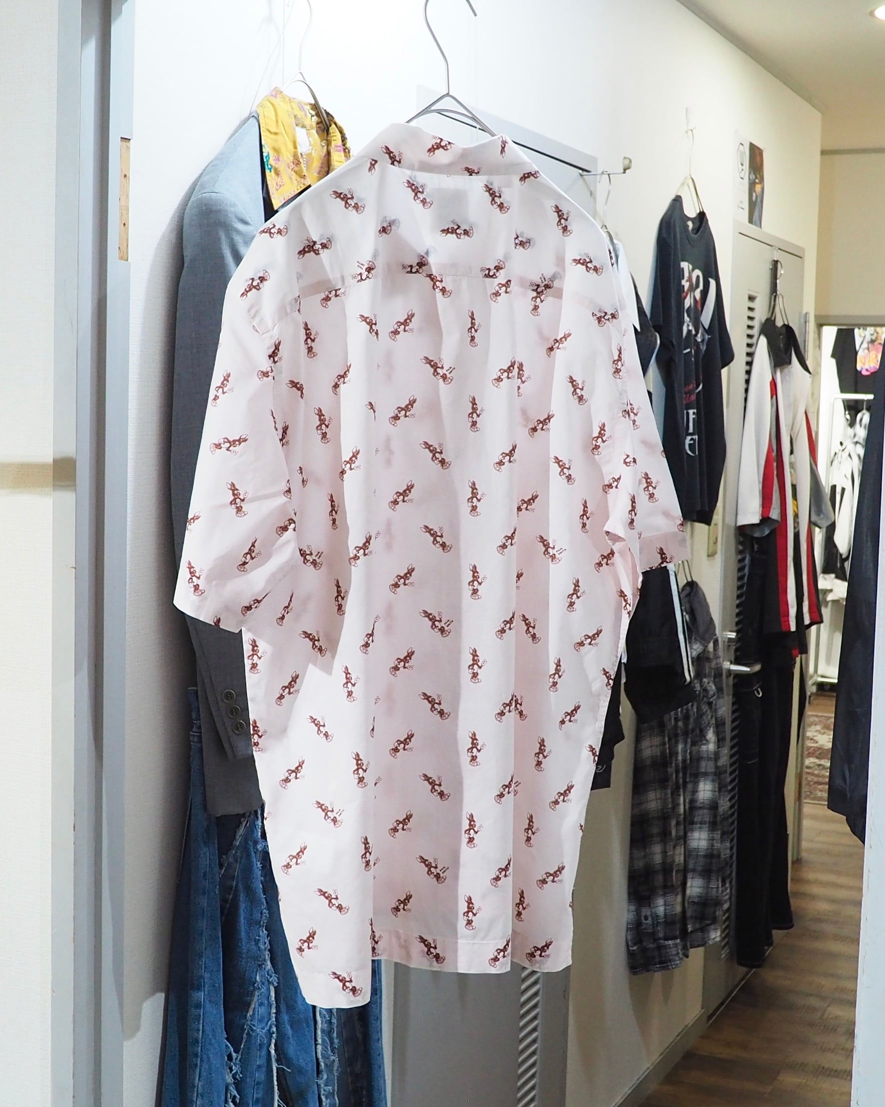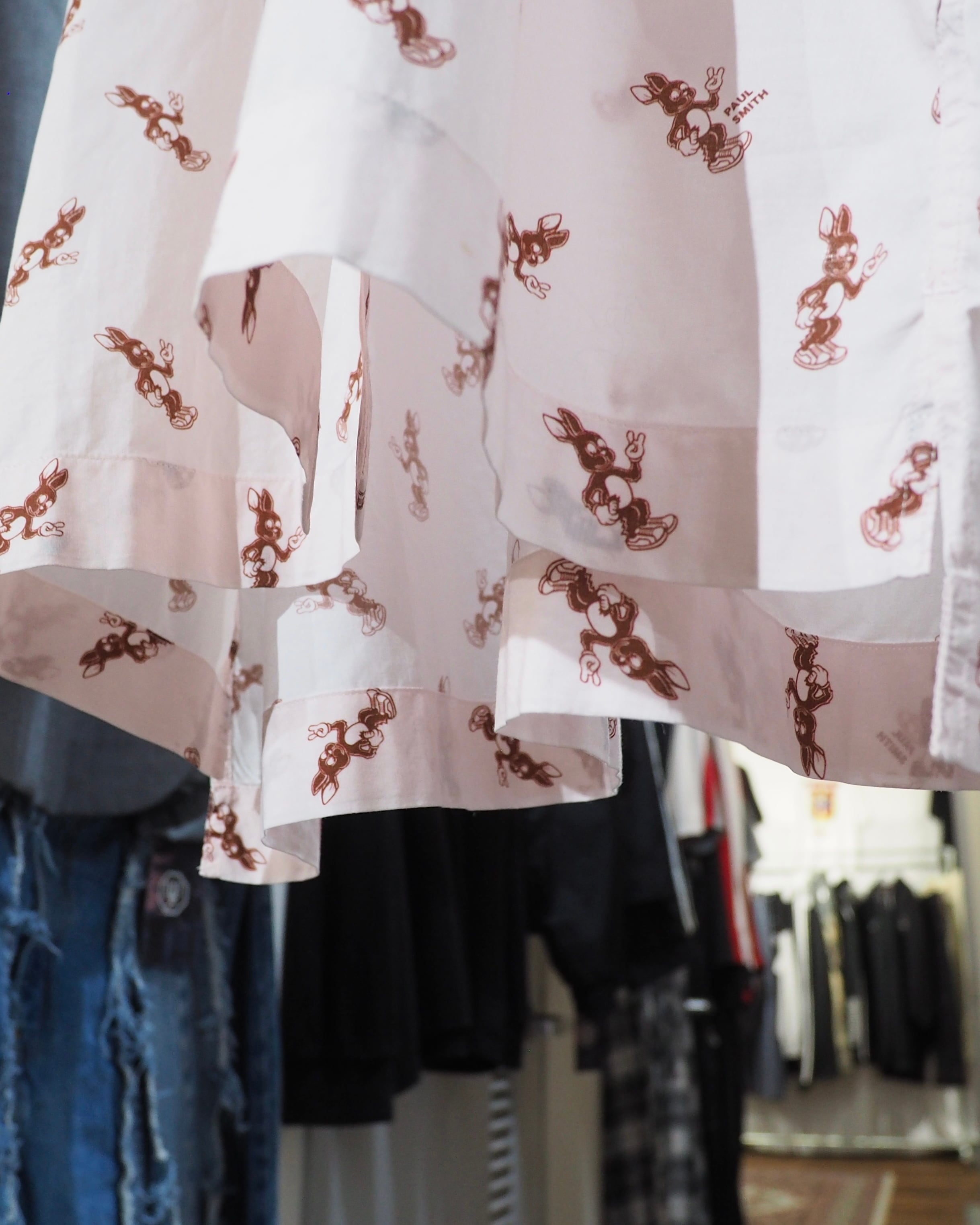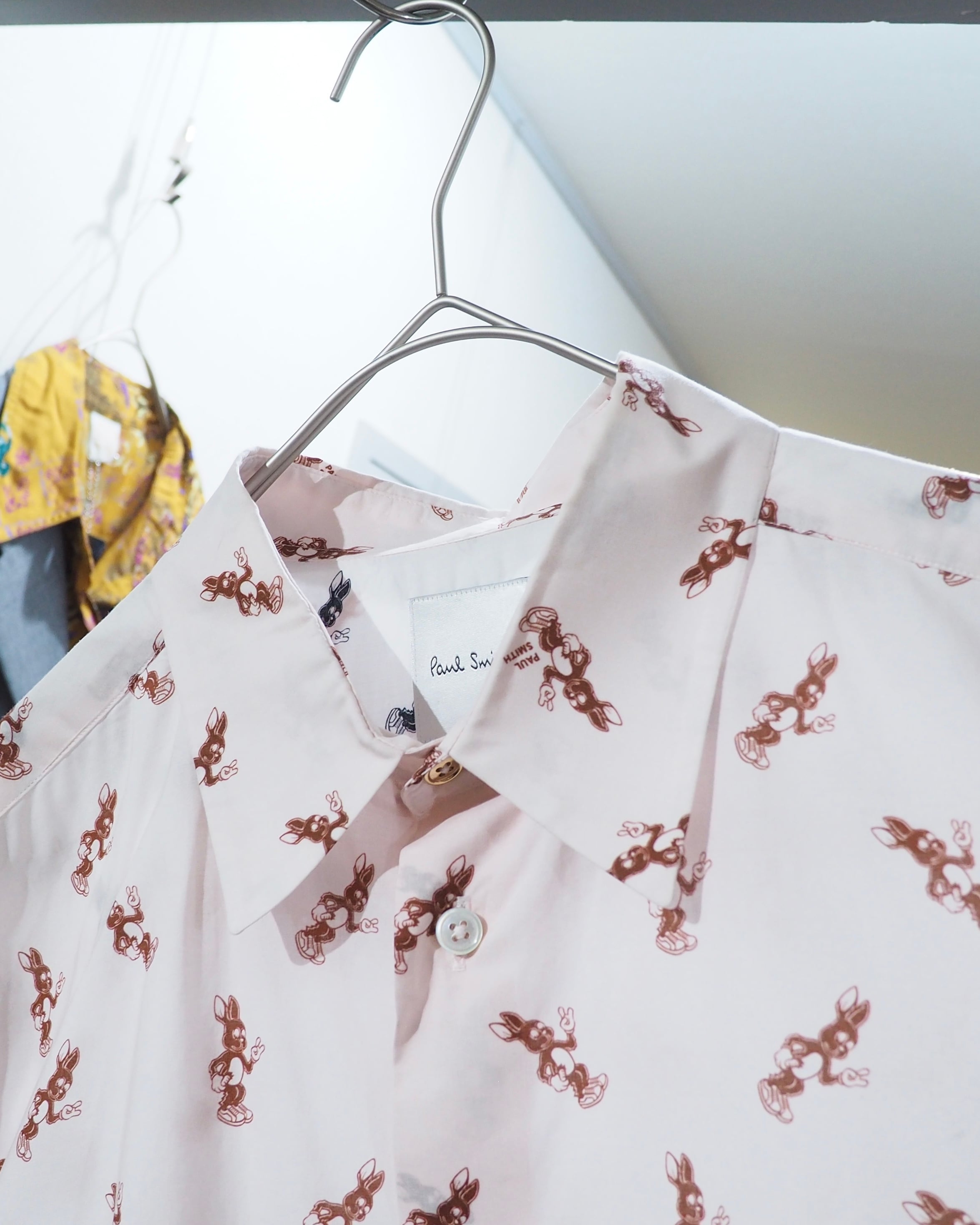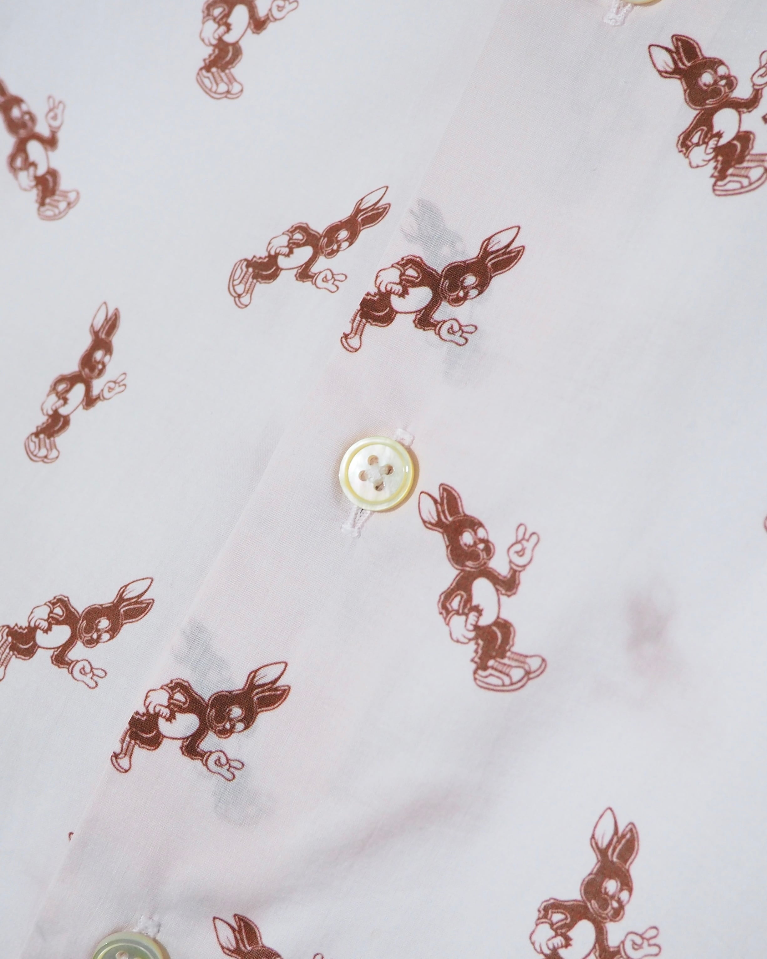 淡いペールピンクのコットンボディに転写されたラビットが可愛らしいシャツ。
