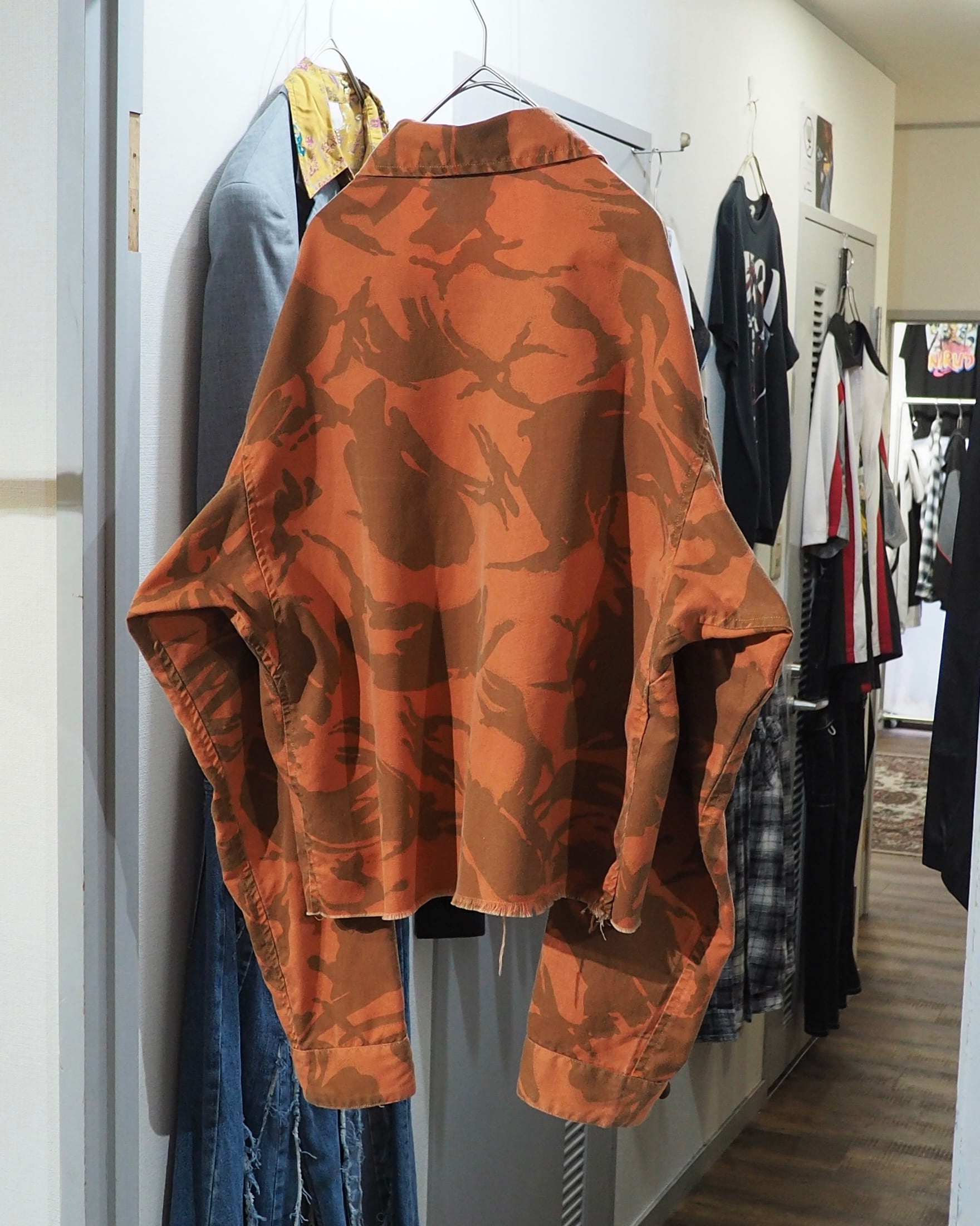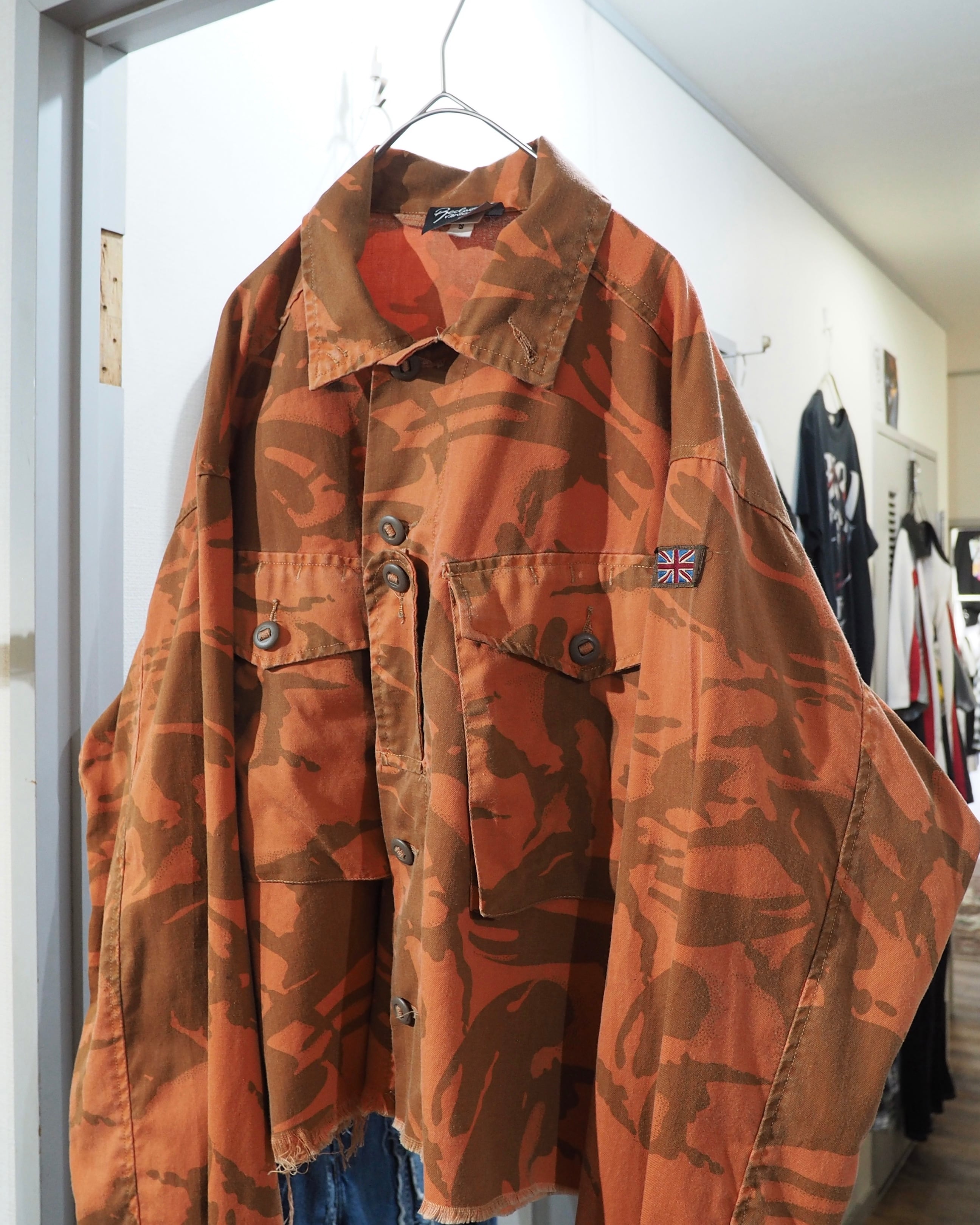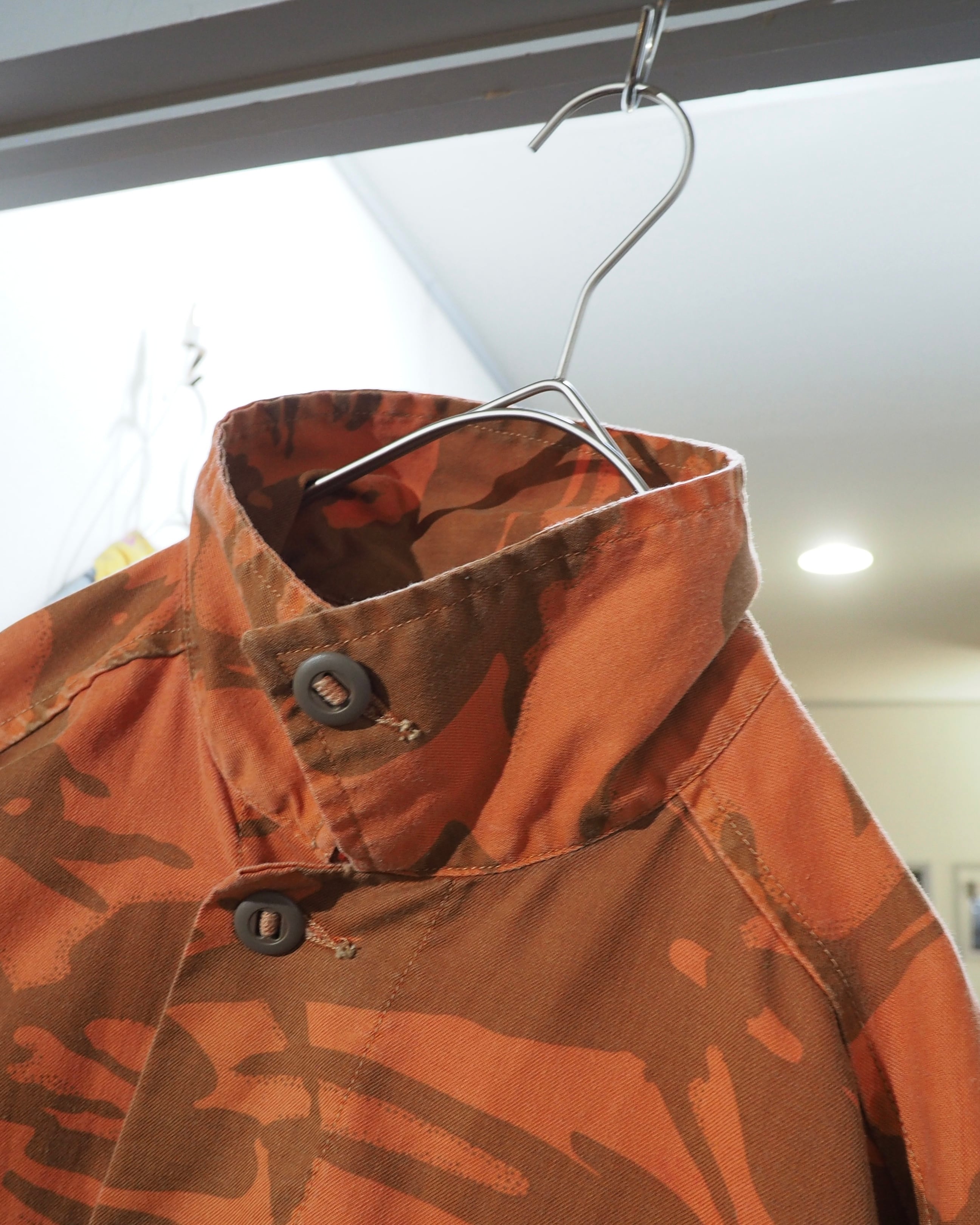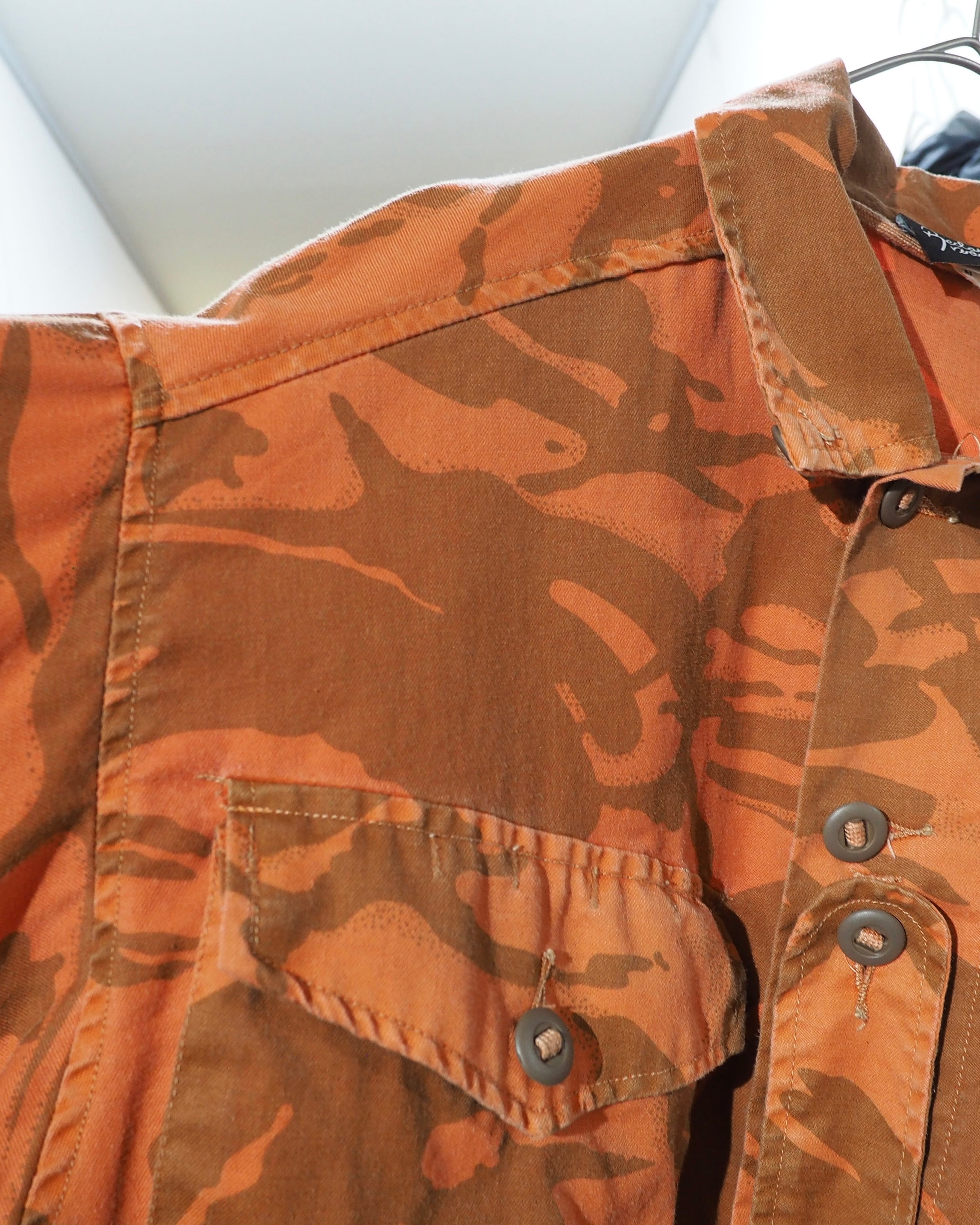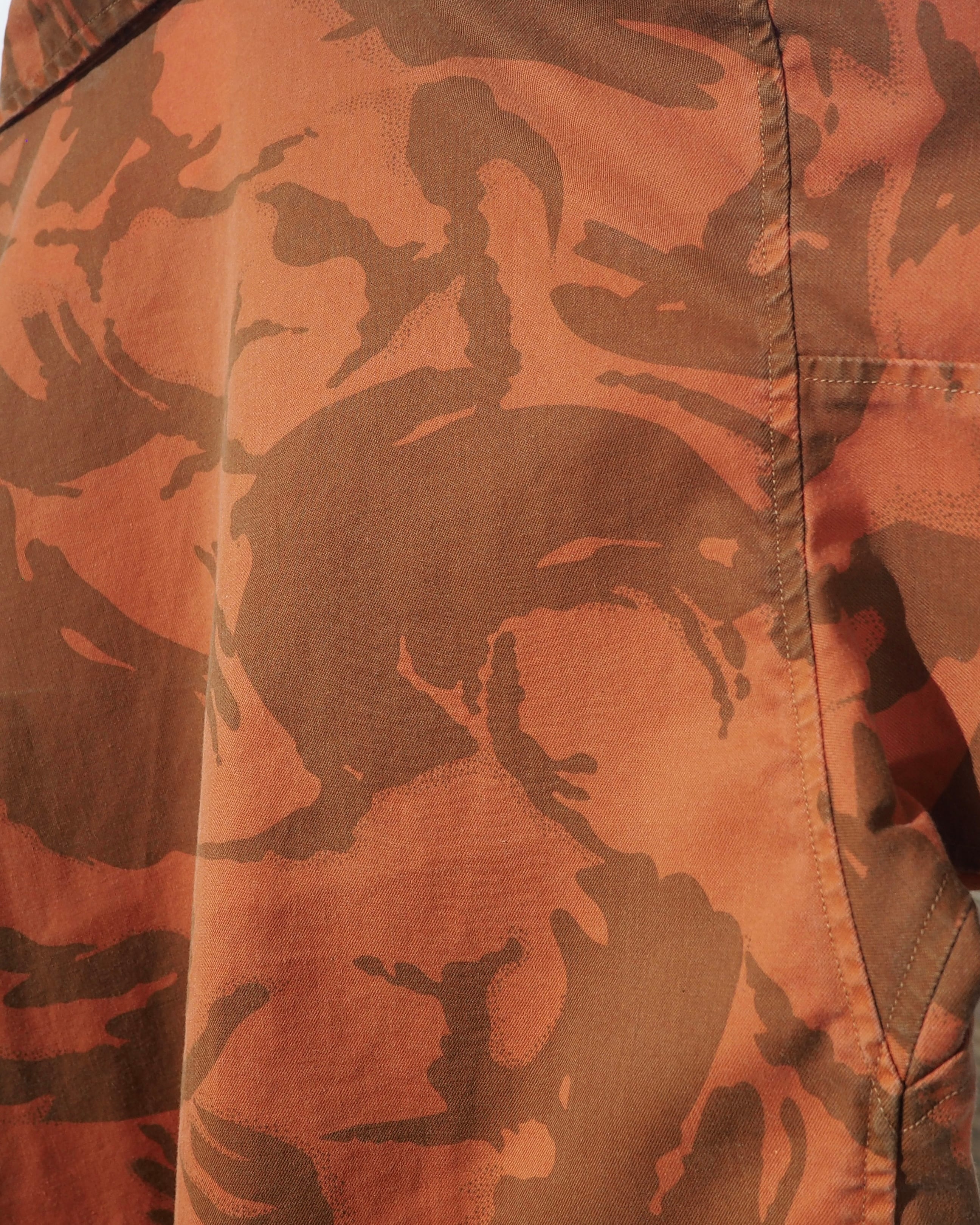 色鮮やかなライトオレンジのお色をベースに、ミリタリーカモを大胆に再構築したデザインが圧倒的な存在感を放つフィールドジャケット。無骨さの中にどこかアートピースのようなニュアンスを感じさせる、退廃的な佇まい。
