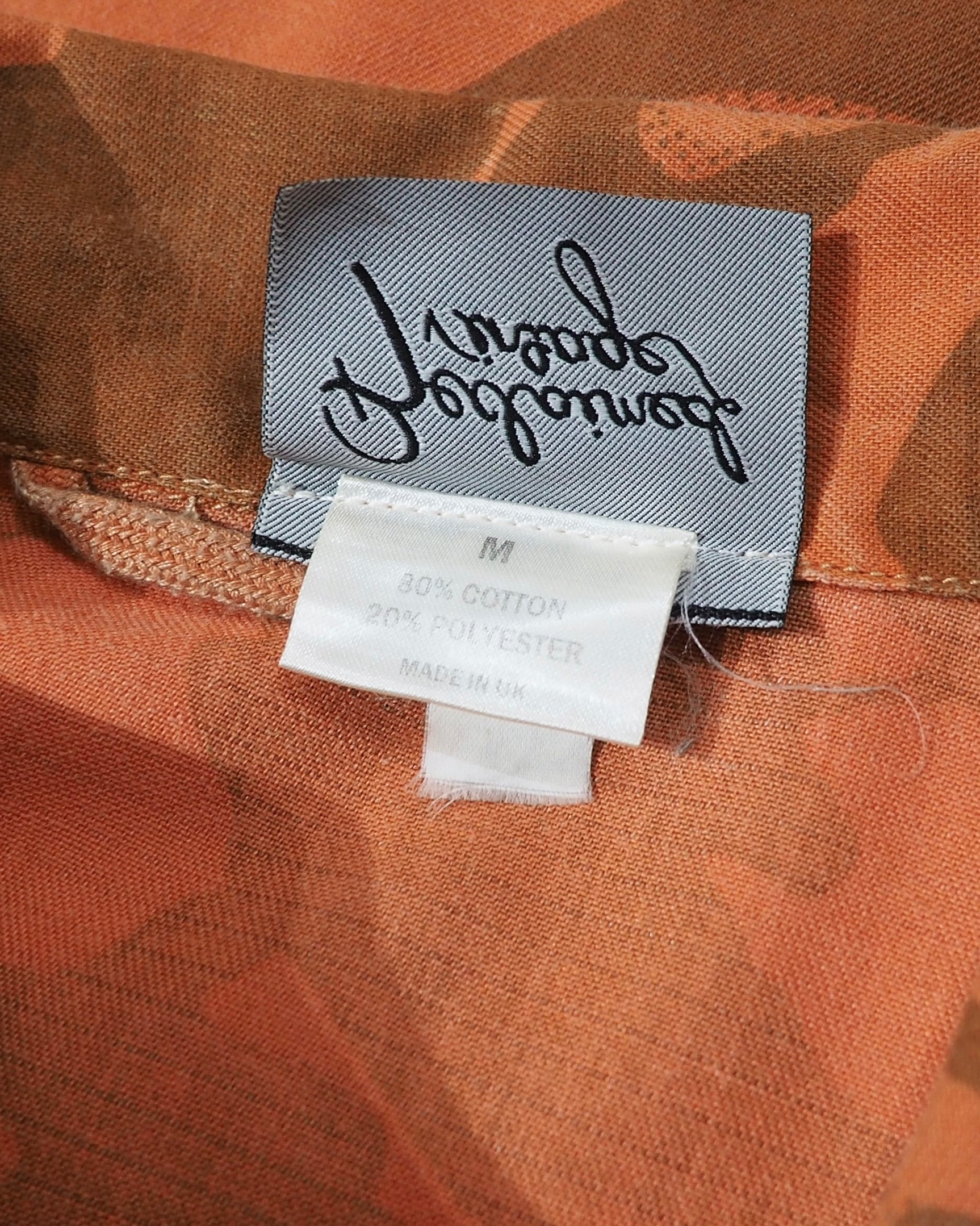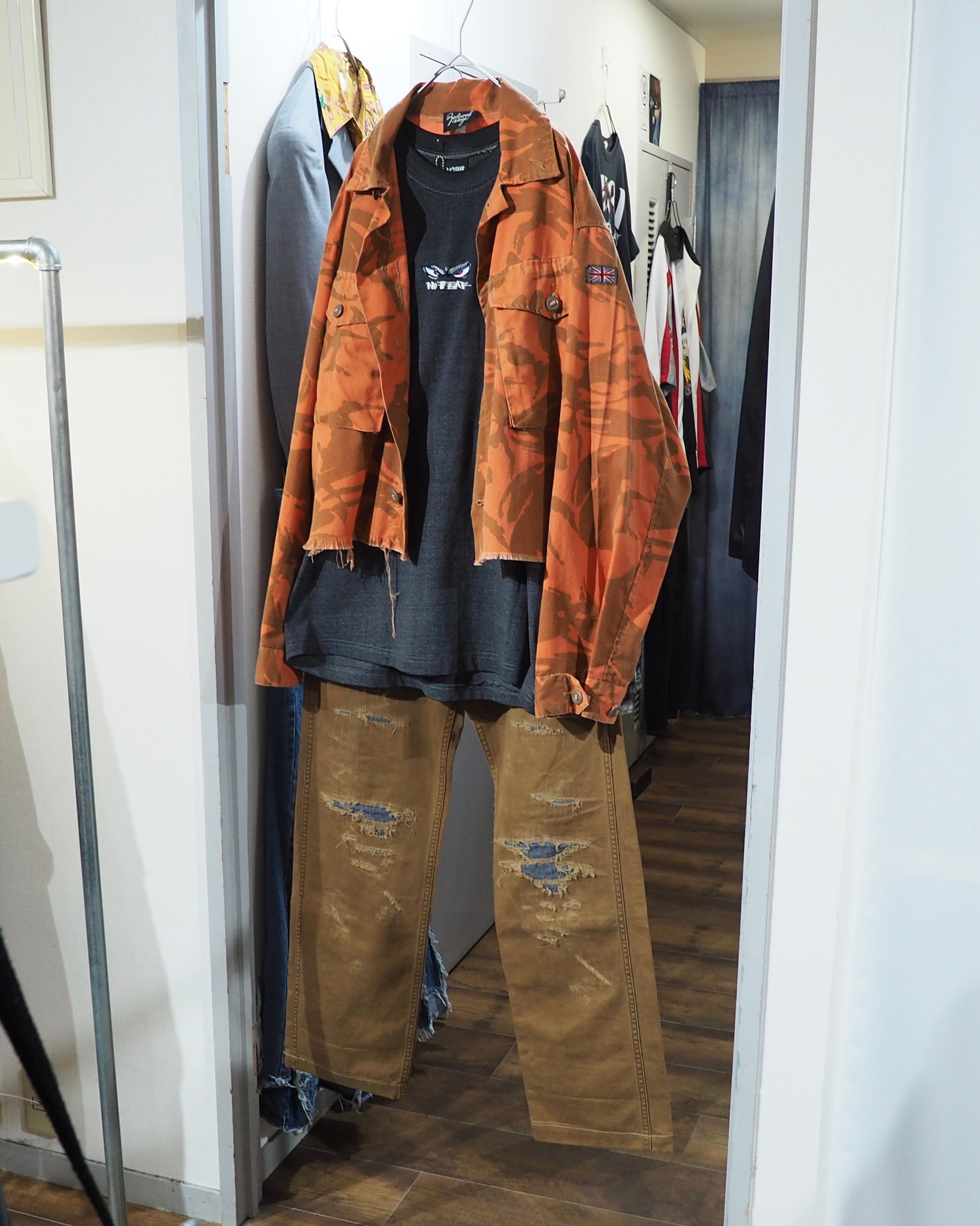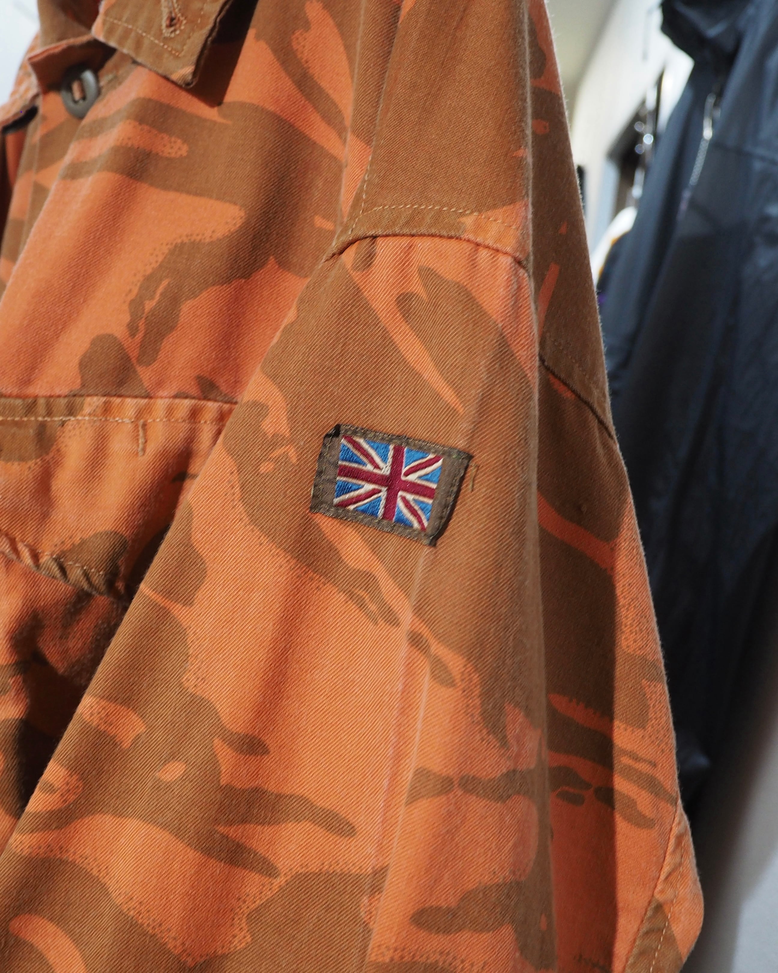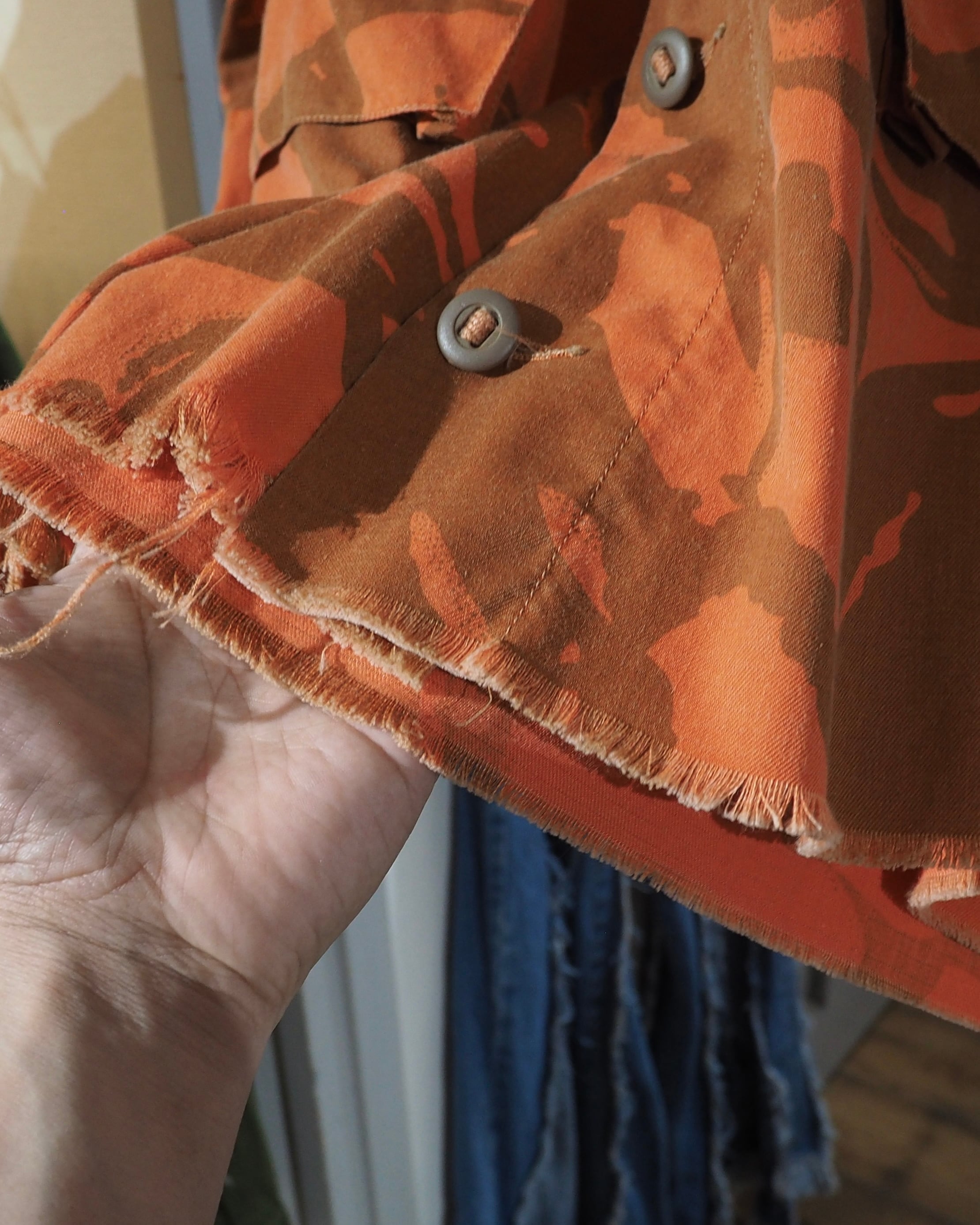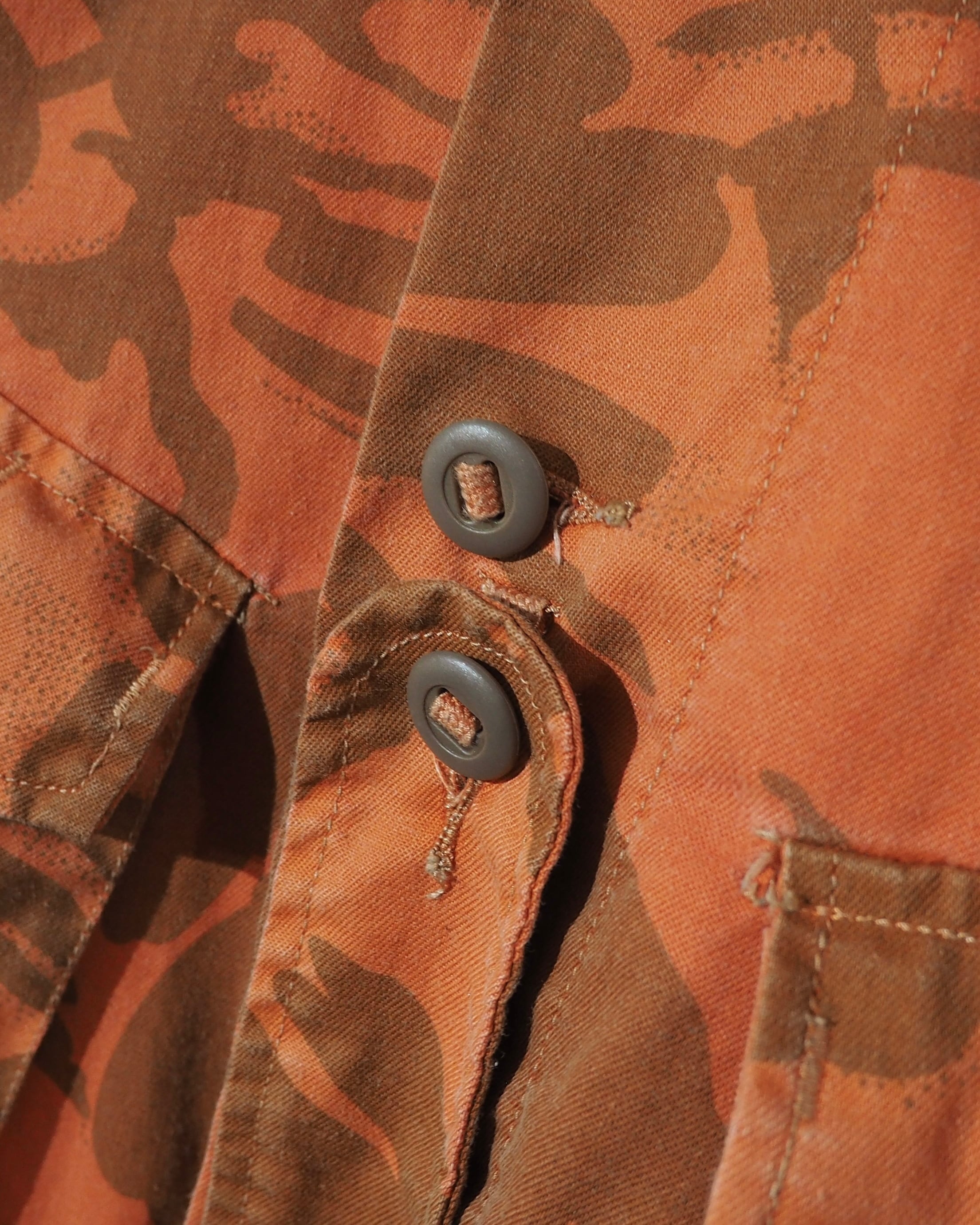色鮮やかなライトオレンジのお色をベースに、ミリタリーカモを大胆に再構築したデザインが圧倒的な存在感を放つフィールドジャケット。無骨さの中にどこかアートピースのようなニュアンスを感じさせる、退廃的な佇まい。
