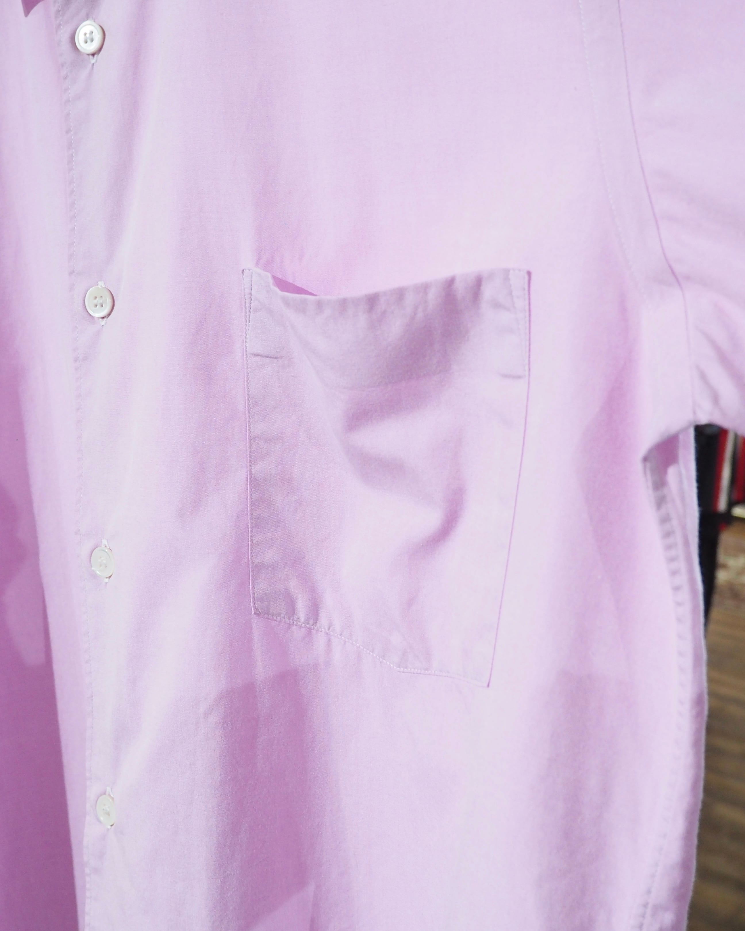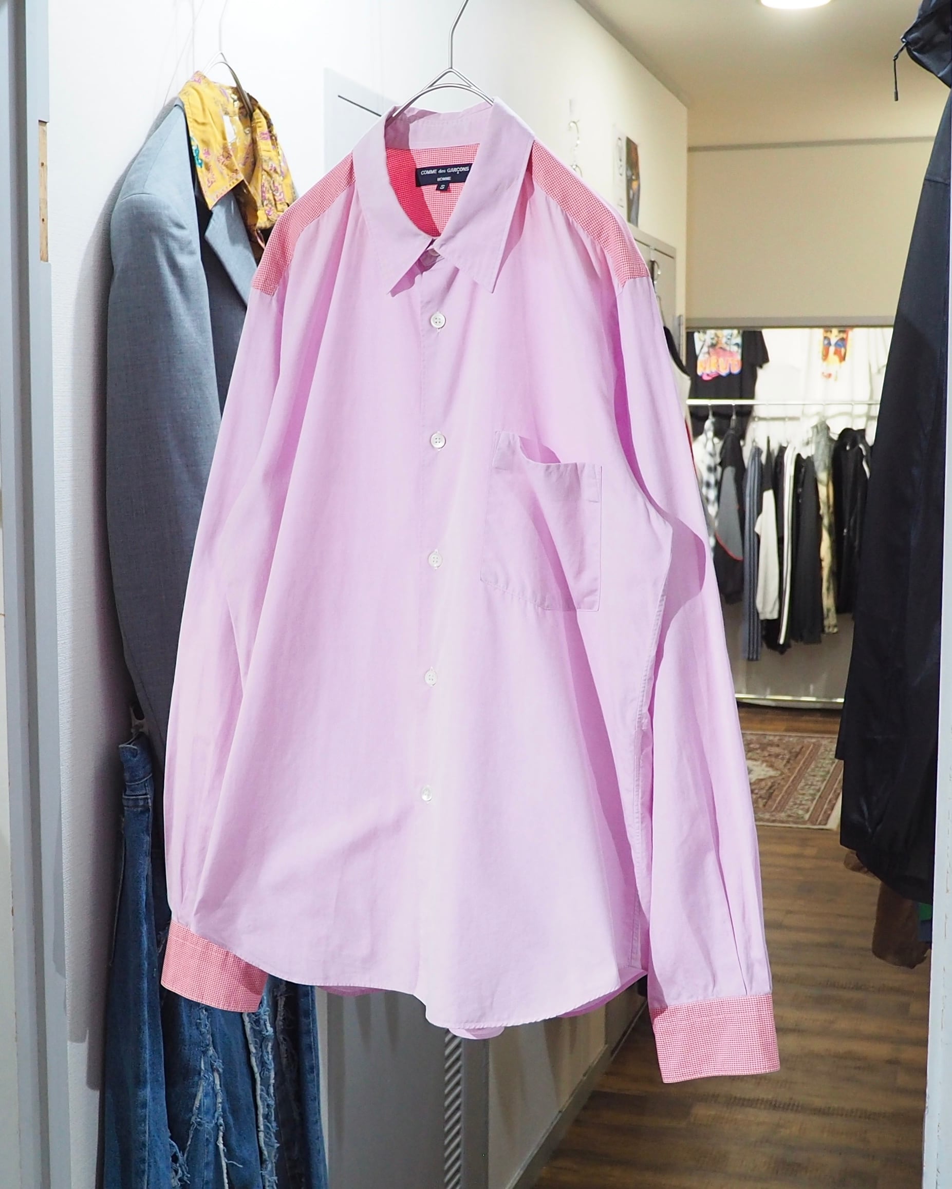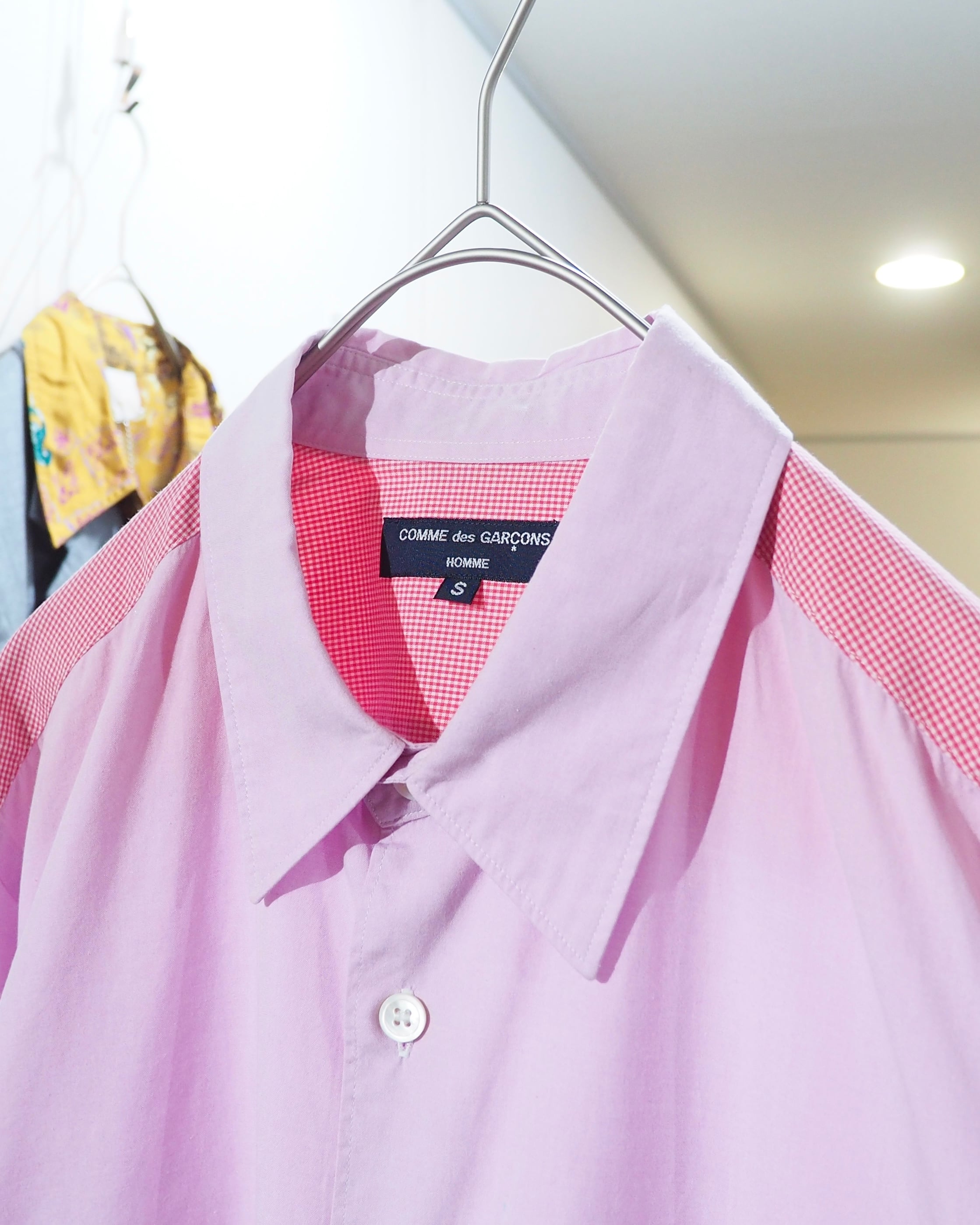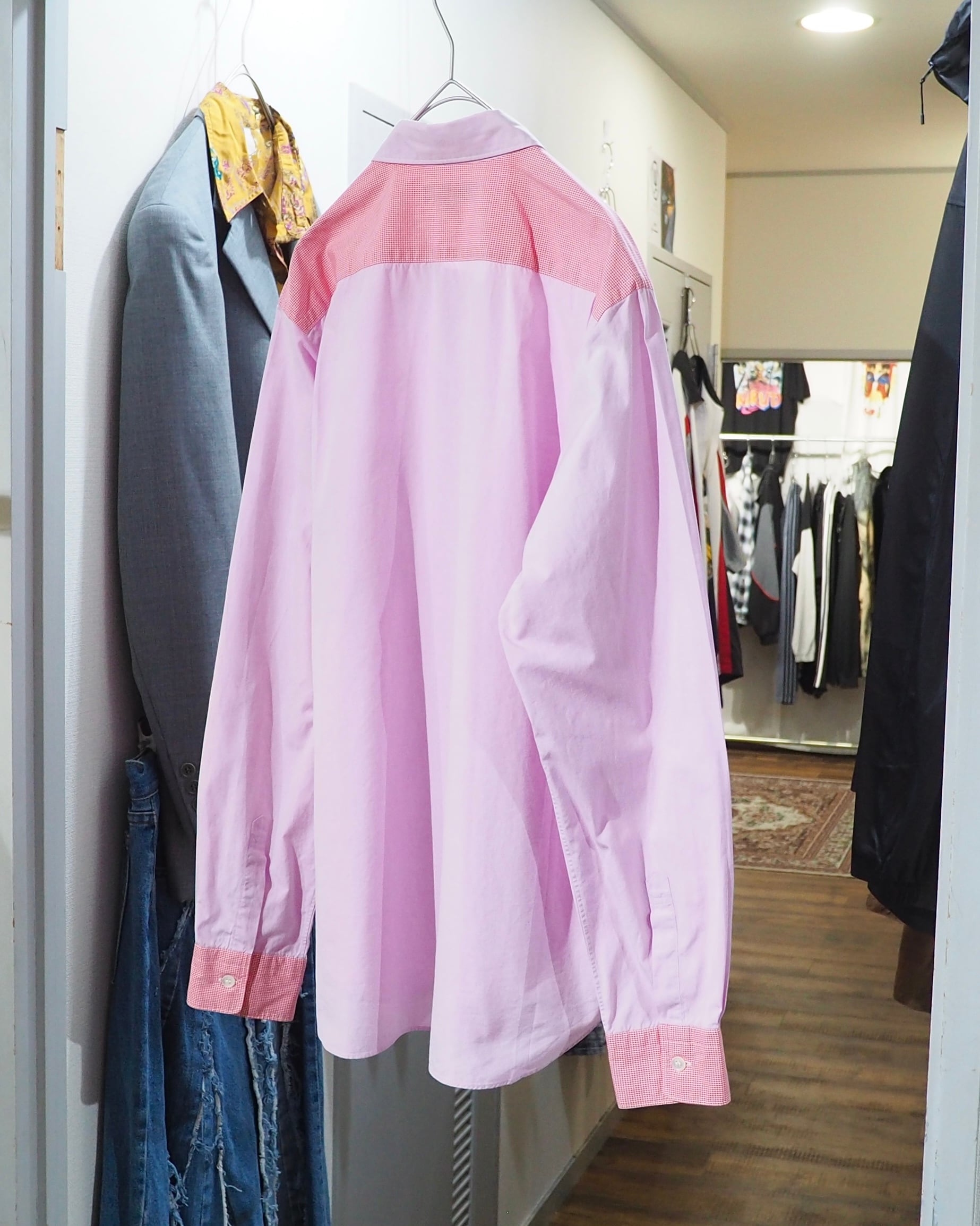 こちらは、淡く柔らかなペールピンクのコットンボディに、ショルダーやカフスへギンガムチェック柄を切り替えたシャツ。密度の高いギンガムチェックは遠目に見ると単色に見える不思議な仕掛けとなっています。