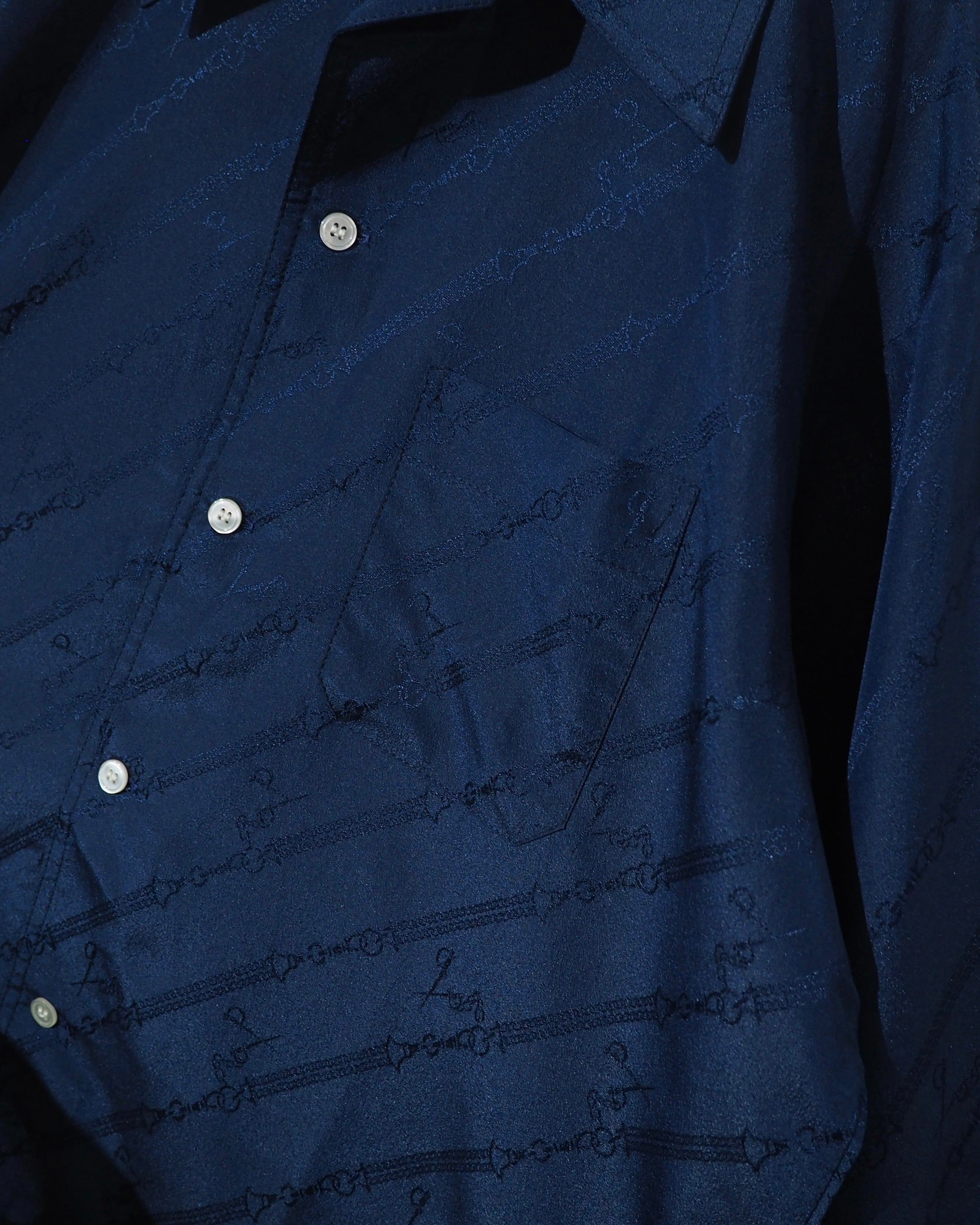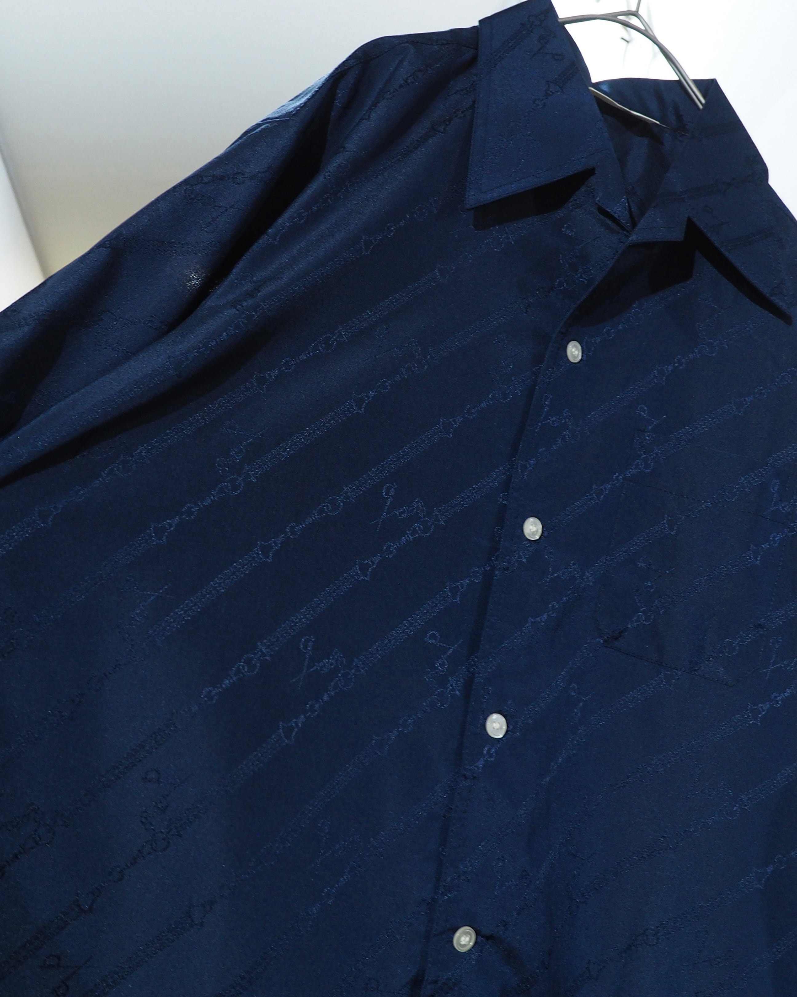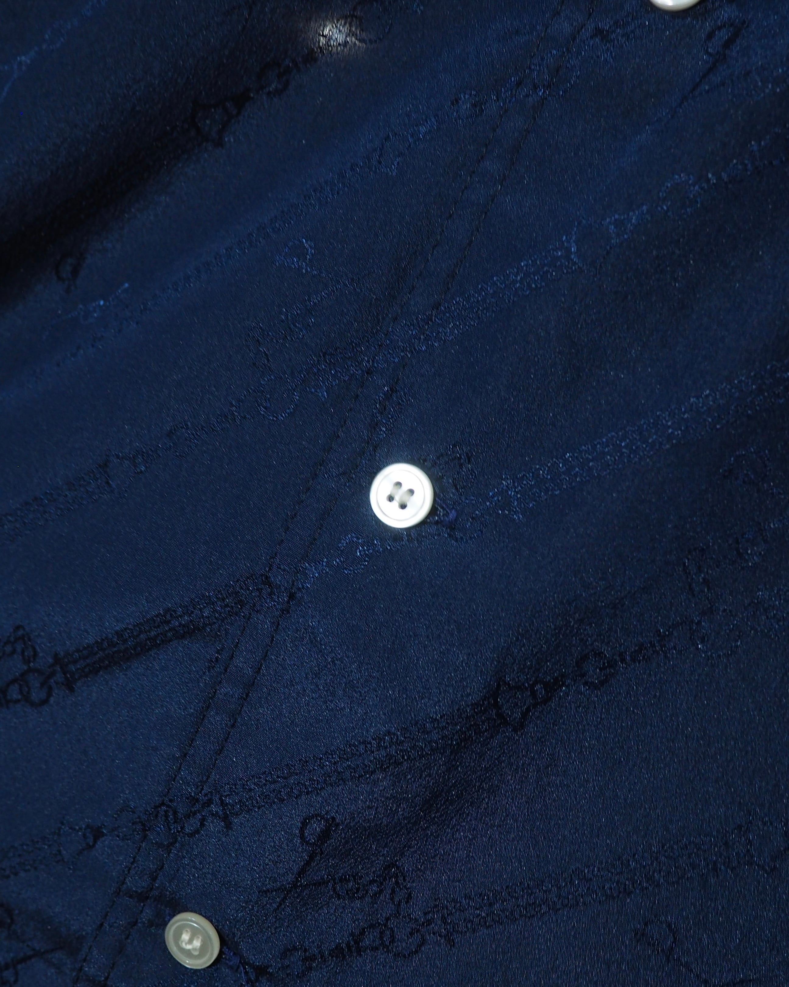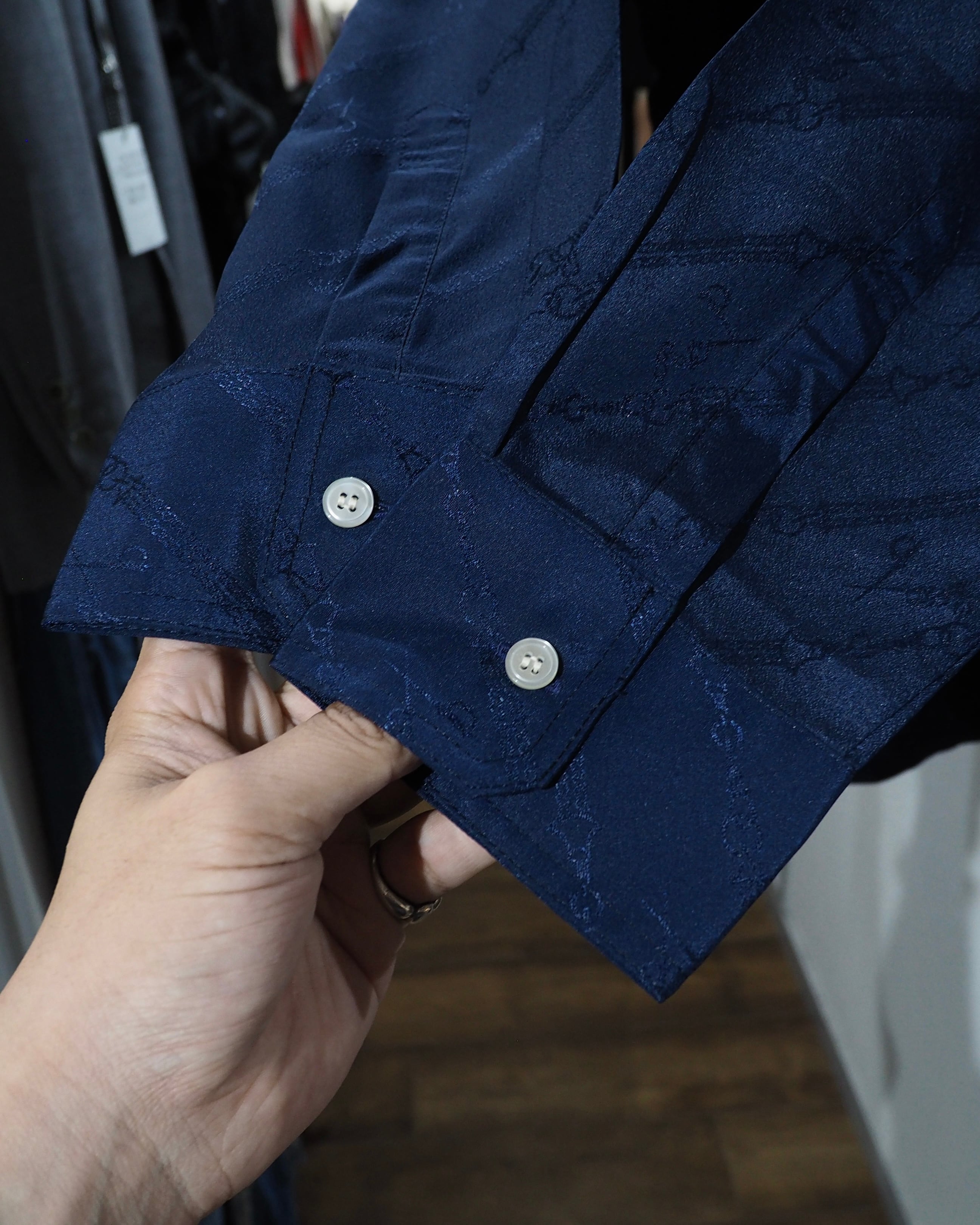 深く沈むような濃紺ダークブルーをベースに、繊細に転写された幾何学模様が静かに浮かび上がるラグジュアリーモードなシャツ。光の当たり方や動きによって表情を変えるその佇まいに惑わされて。