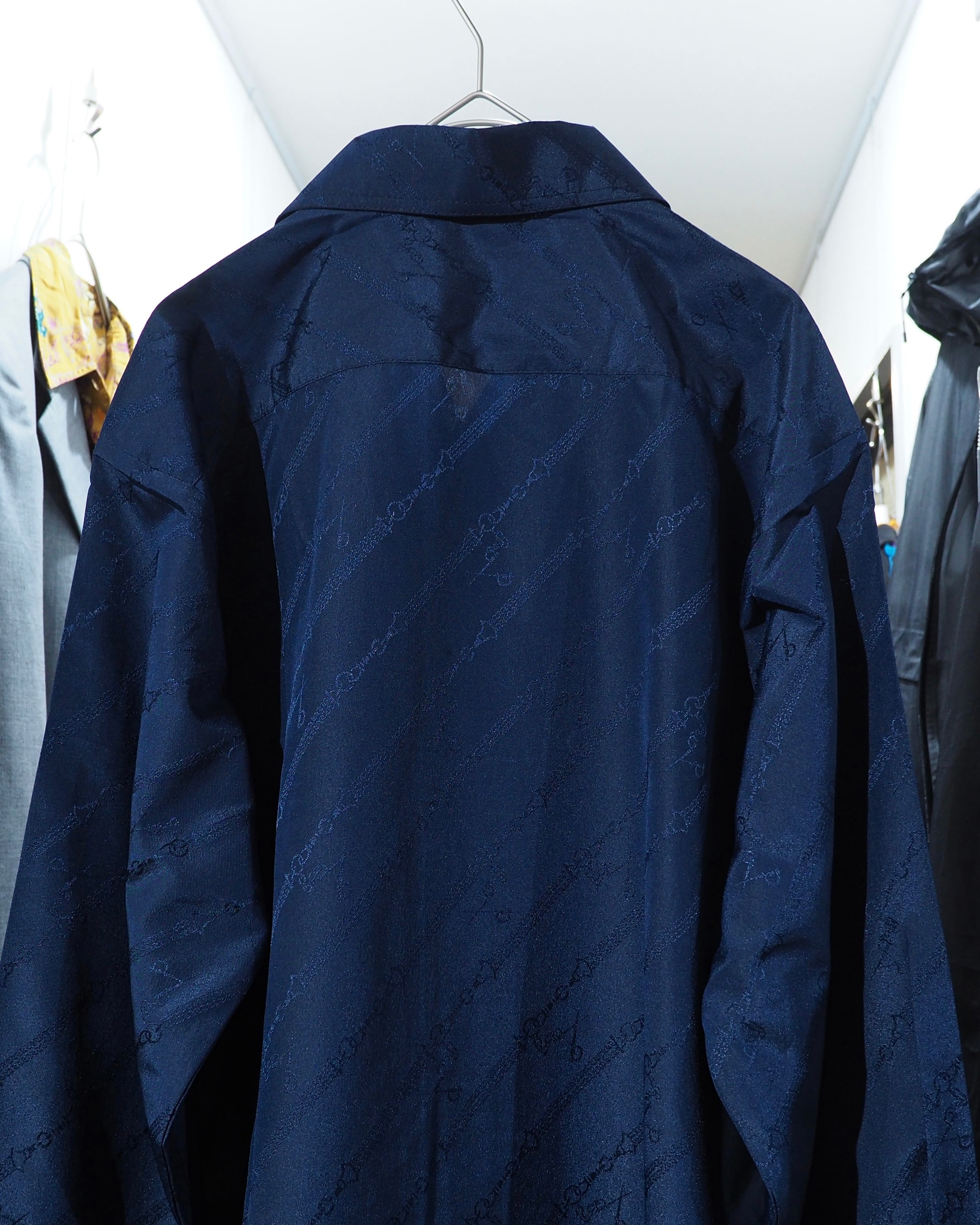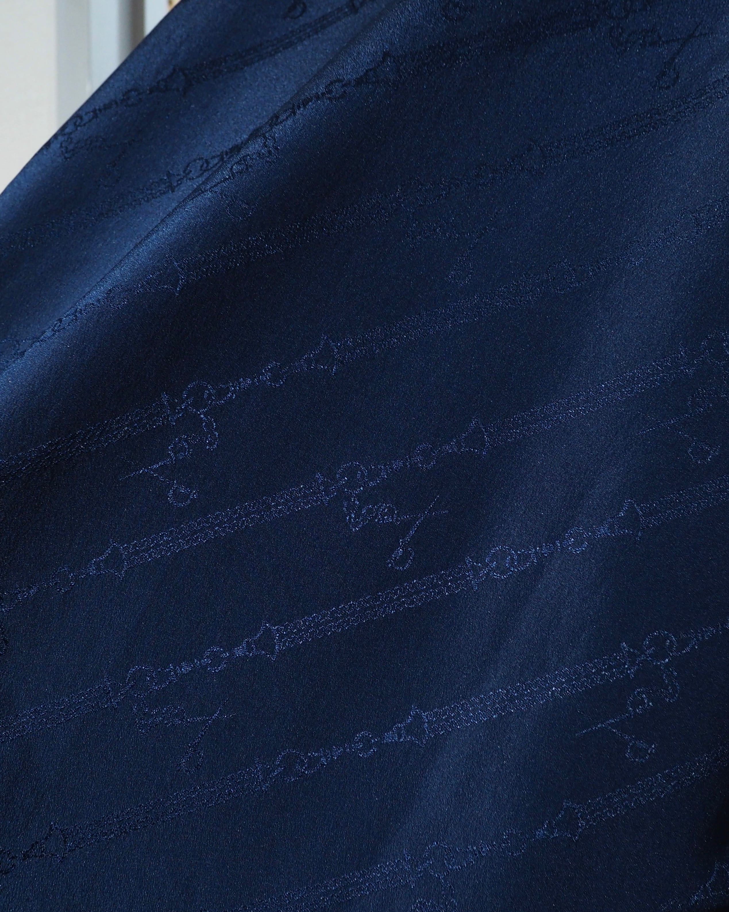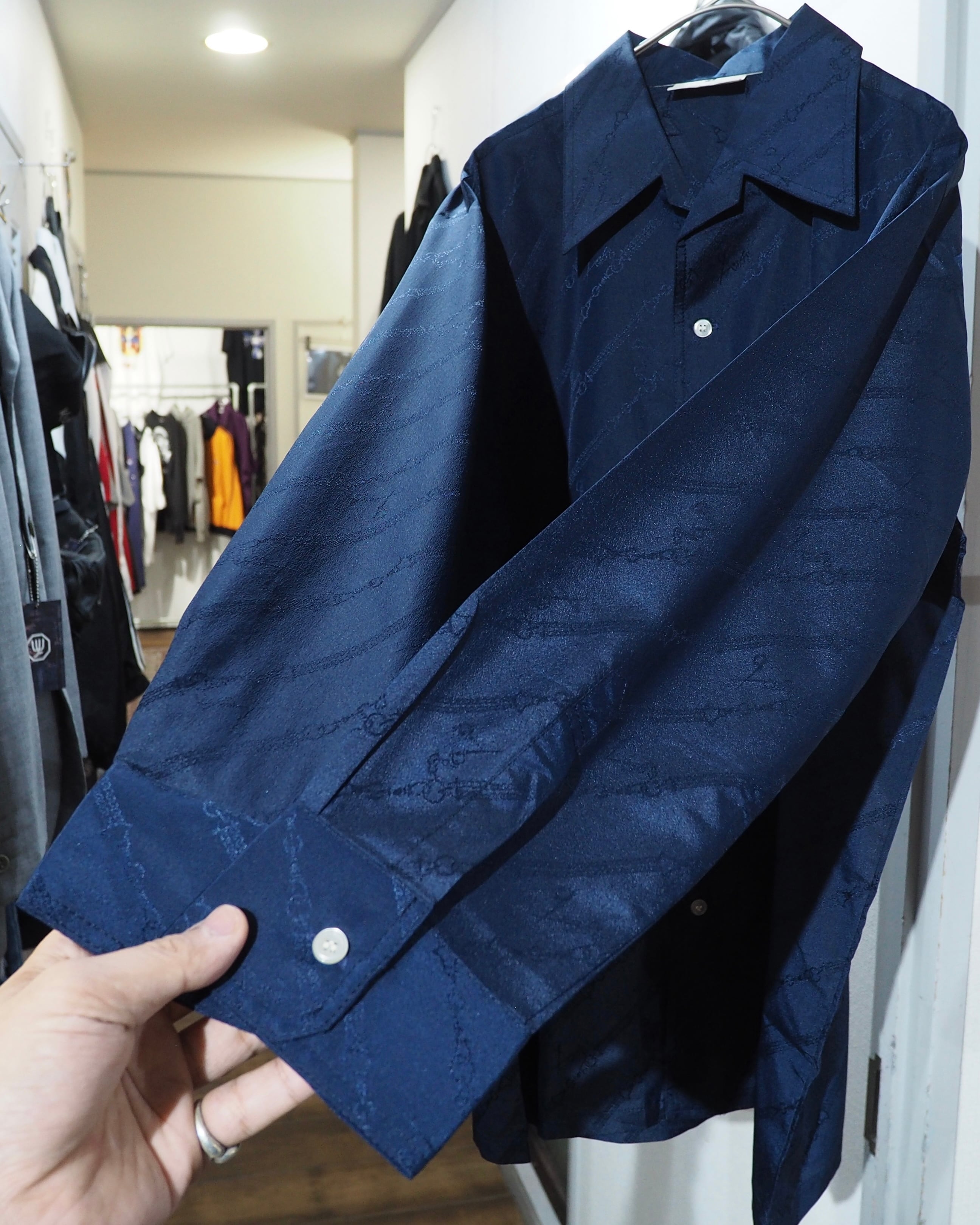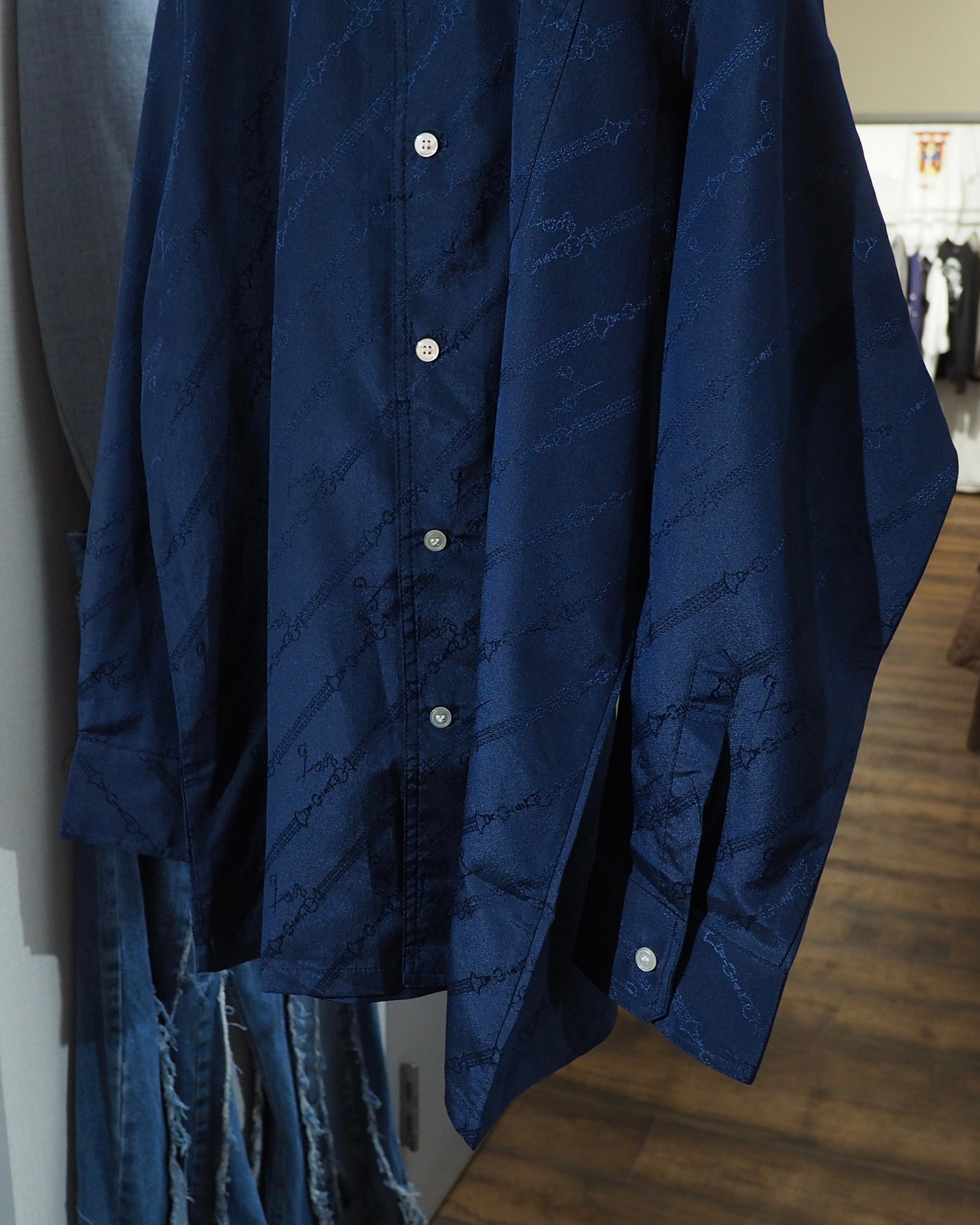 深く沈むような濃紺ダークブルーをベースに、繊細に転写された幾何学模様が静かに浮かび上がるラグジュアリーモードなシャツ。光の当たり方や動きによって表情を変えるその佇まいに惑わされて。